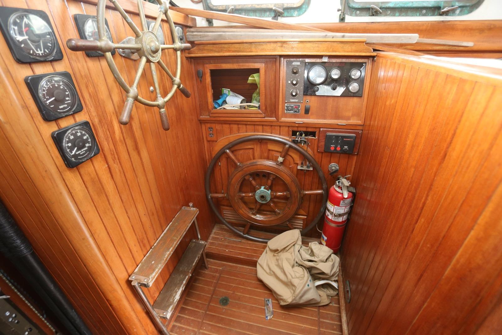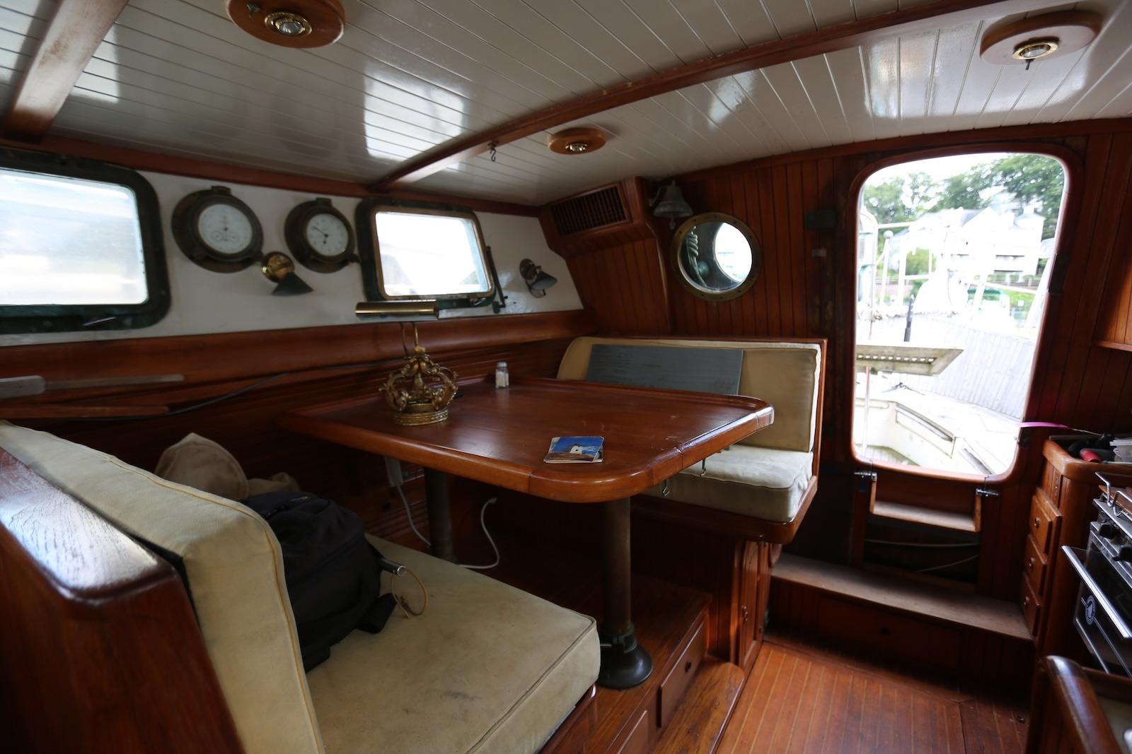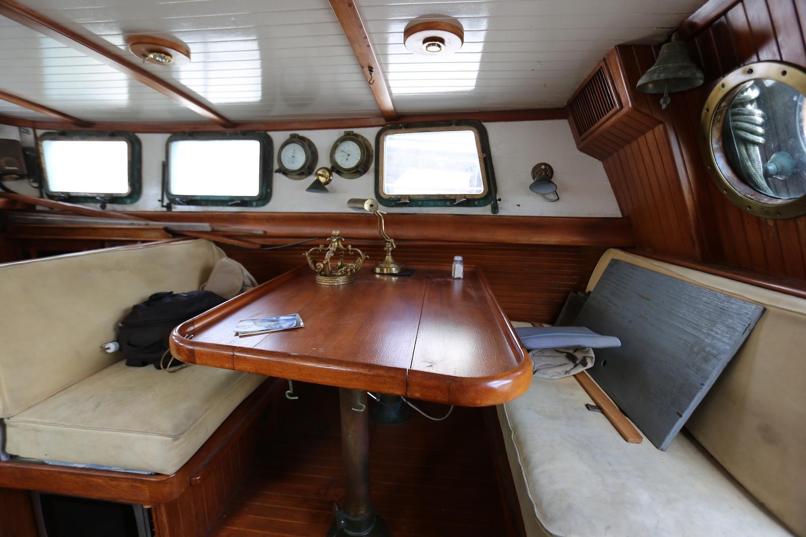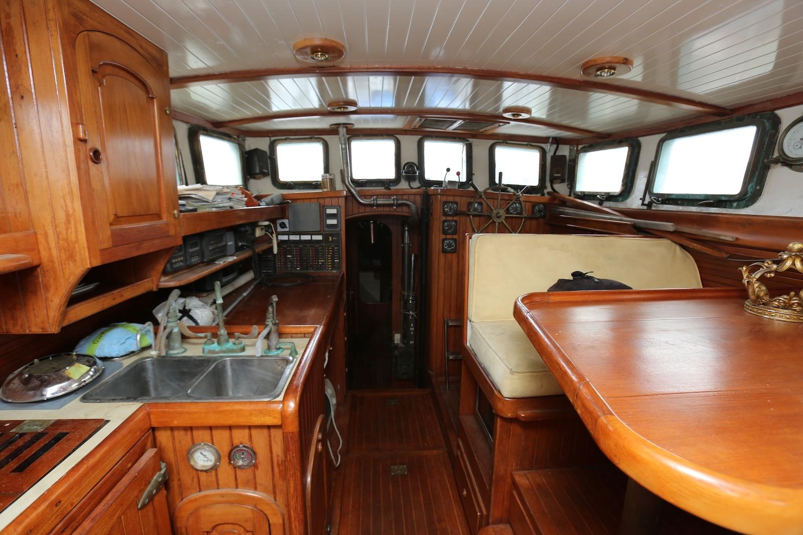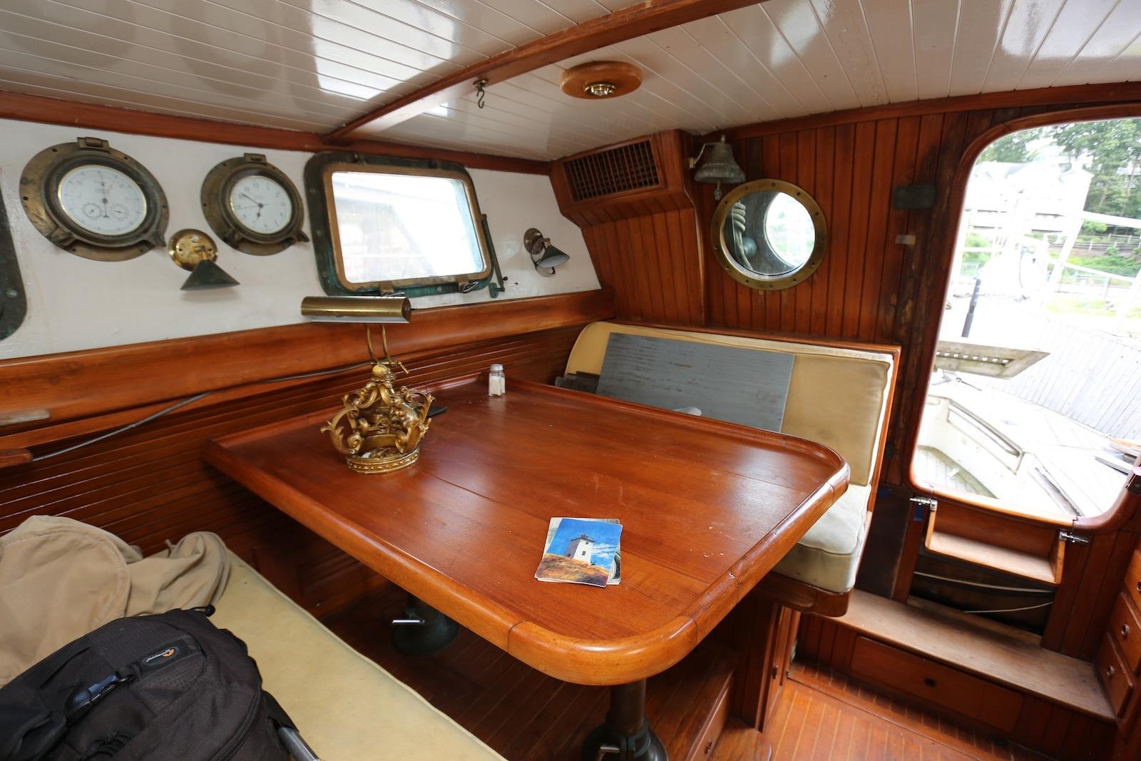 Main pilothouse cabin with helm, convertible double-berth dinette, communications and chart table/ workstation and galley with gimbal 2-burner stove and oven, SS double sink with original brass fixtures, microwave and huge refrigerated icebox, all with ample ambient lighting and ventilation via large wrap-around brass and bronze framed portlights.