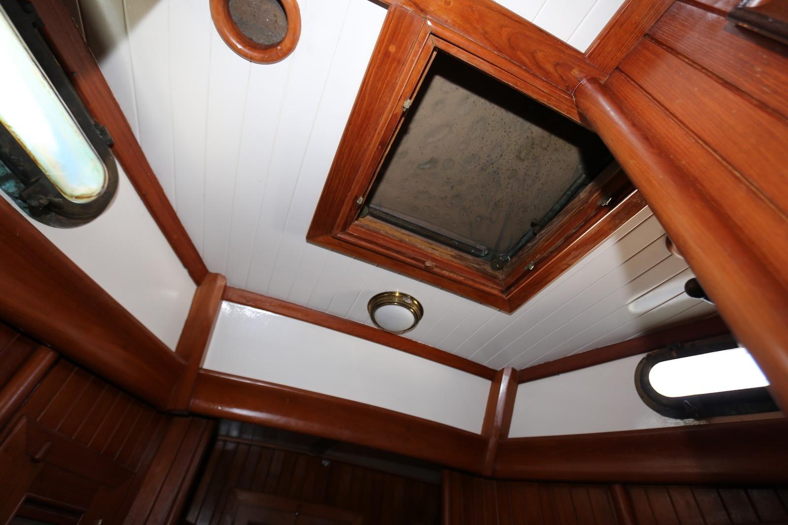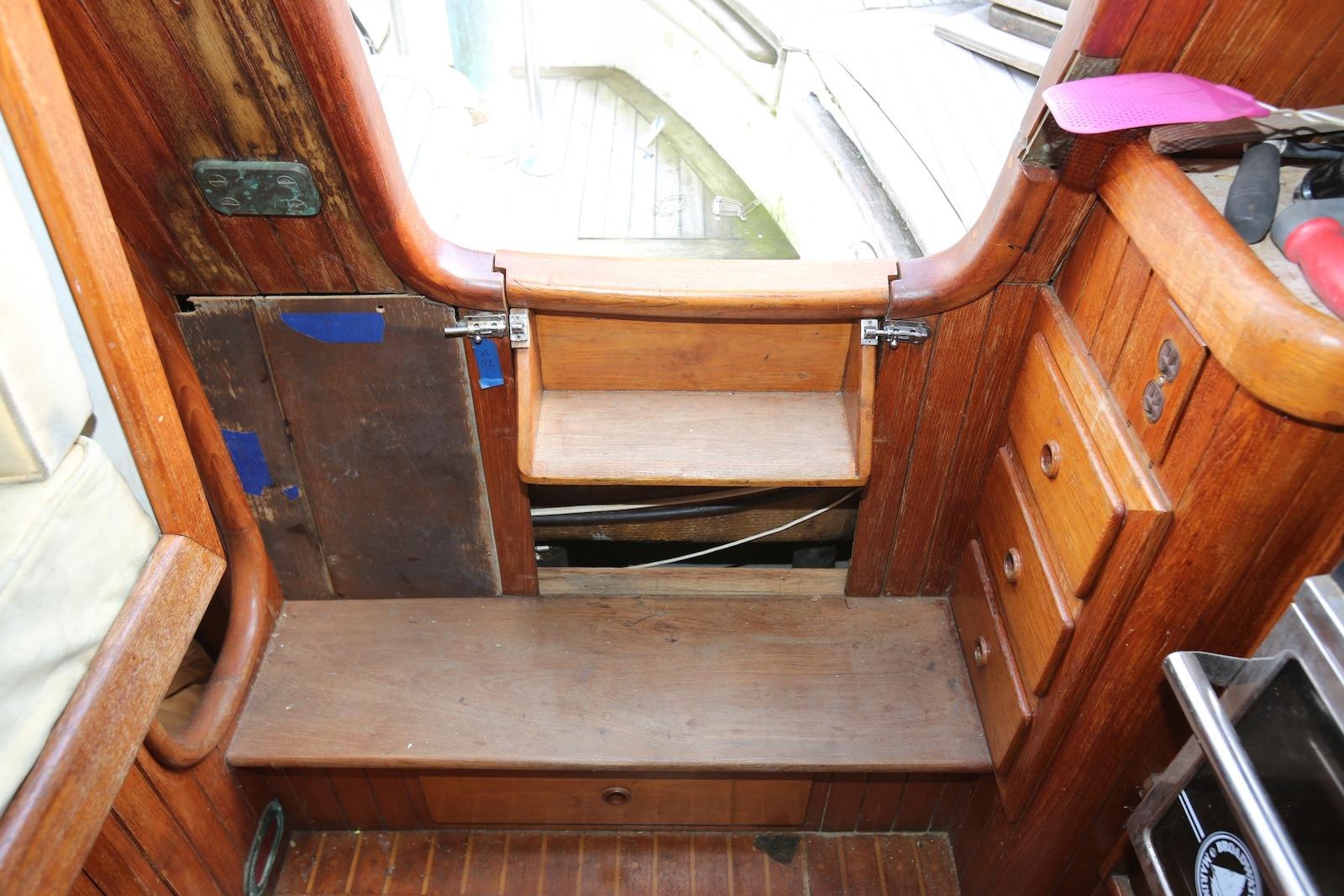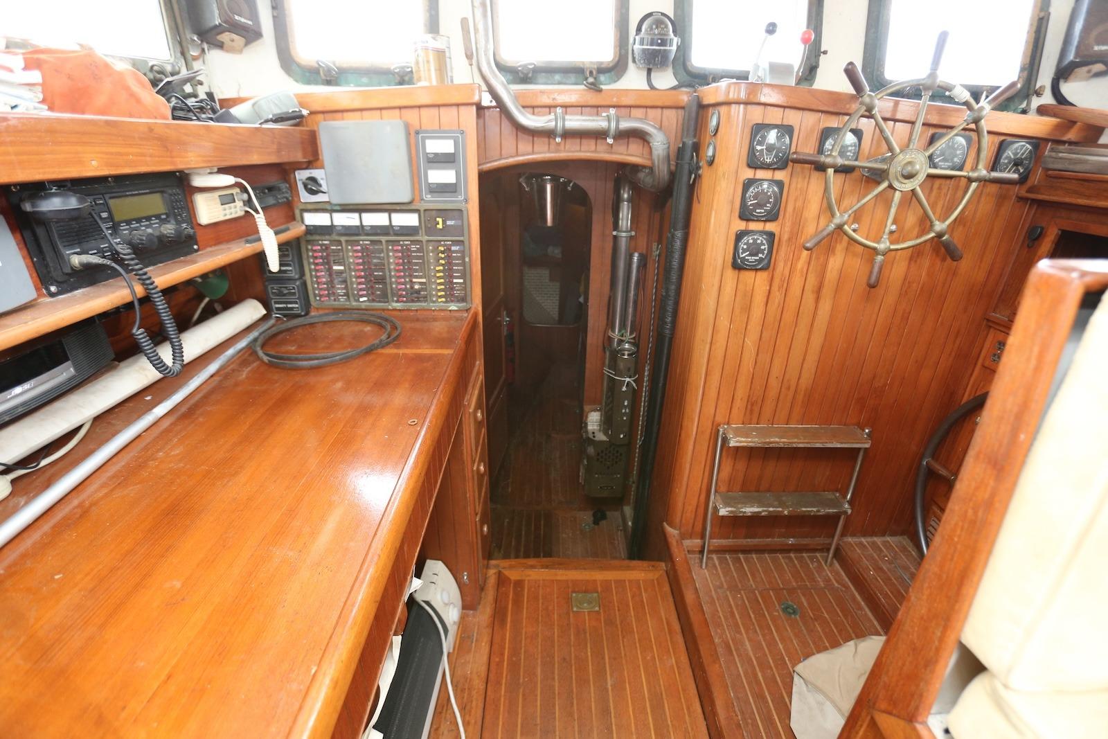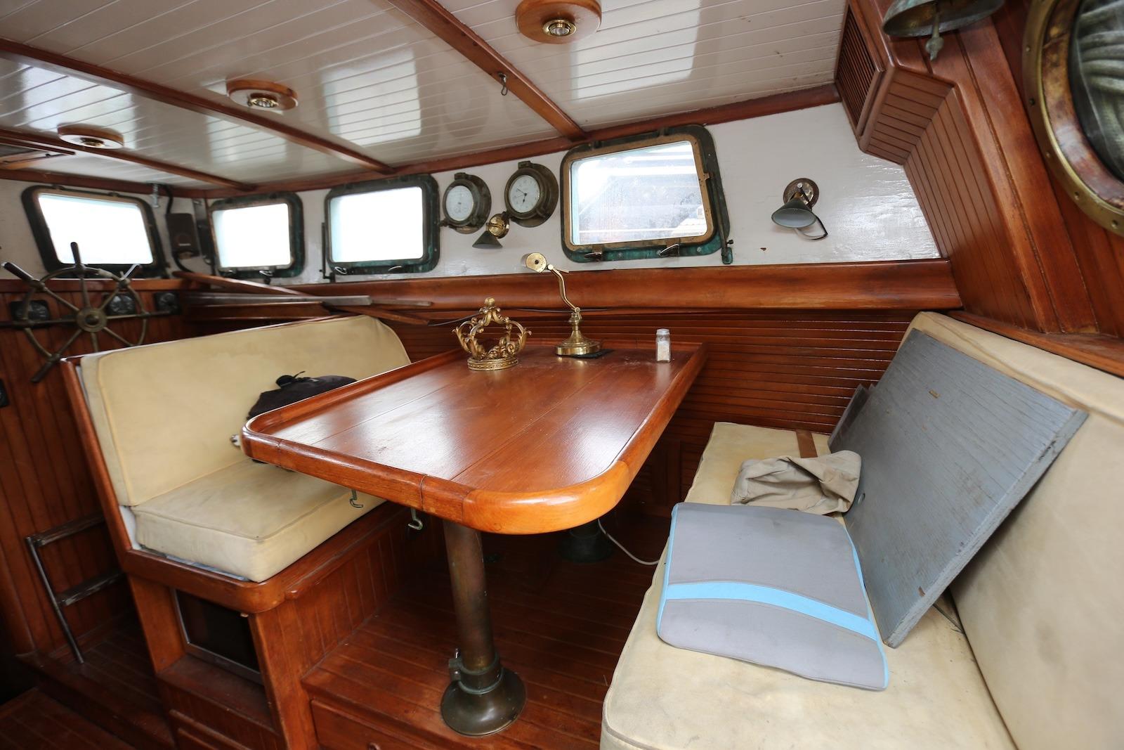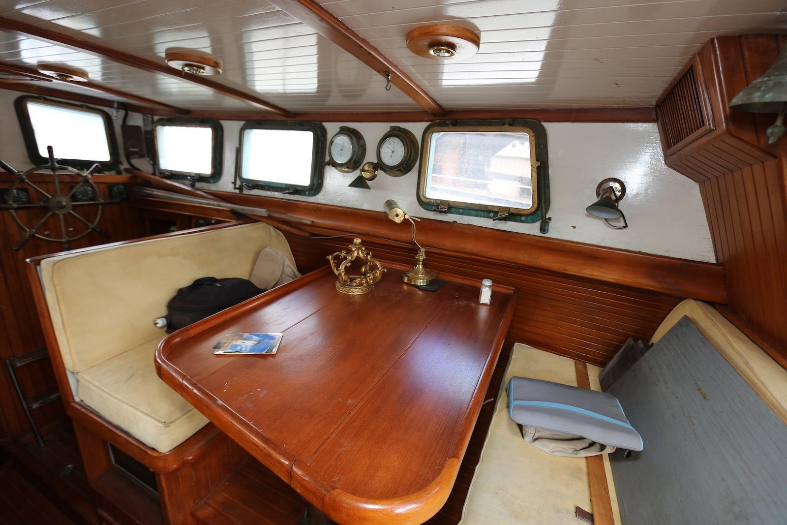 Main pilothouse cabin with helm, convertible double-berth dinette, communications and chart table/ workstation and galley with gimbal 2-burner stove and oven, SS double sink with original brass fixtures, microwave and huge refrigerated icebox, all with ample ambient lighting and ventilation via large wrap-around brass and bronze framed portlights.