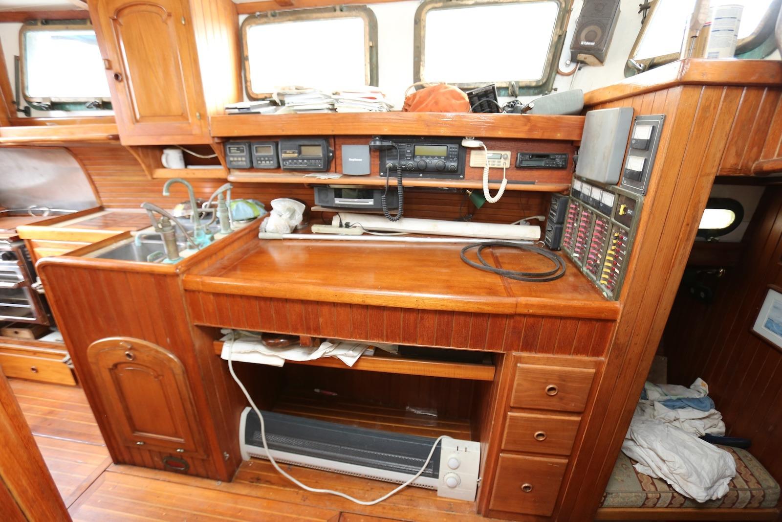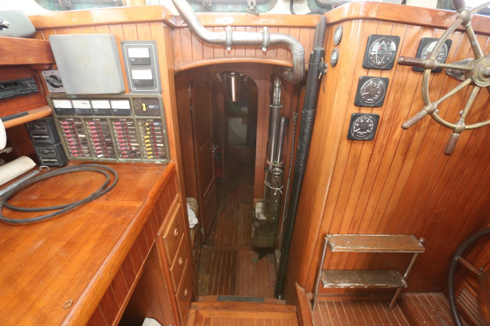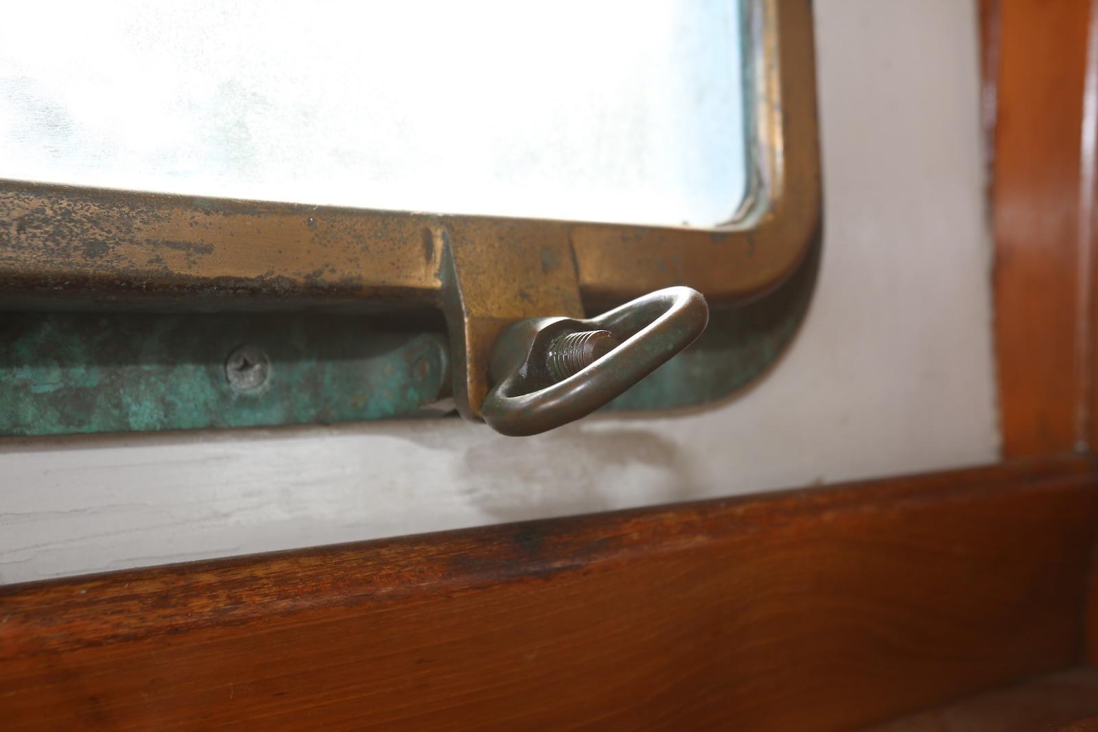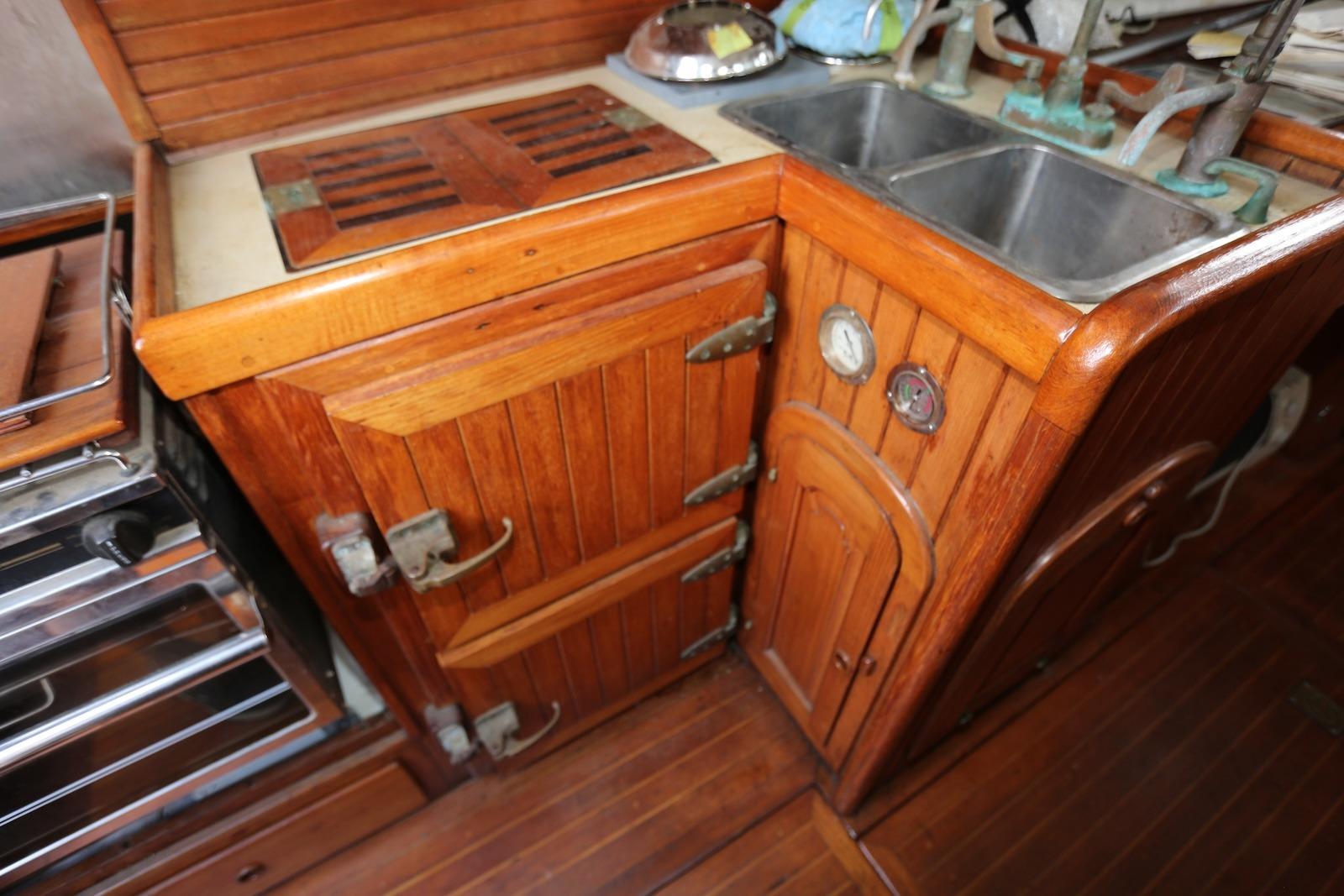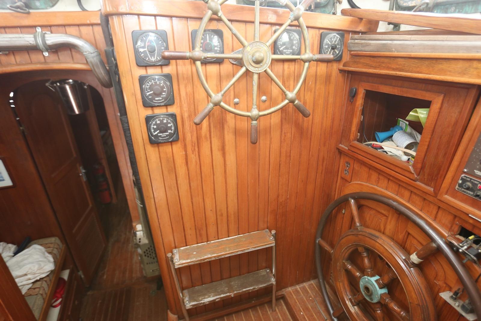 Main pilothouse cabin with helm, convertible double-berth dinette, communications and chart table/ workstation and galley with gimbal 2-burner stove and oven, SS double sink with original brass fixtures, microwave and huge refrigerated icebox, all with ample ambient lighting and ventilation via large wrap-around brass and bronze framed portlights.