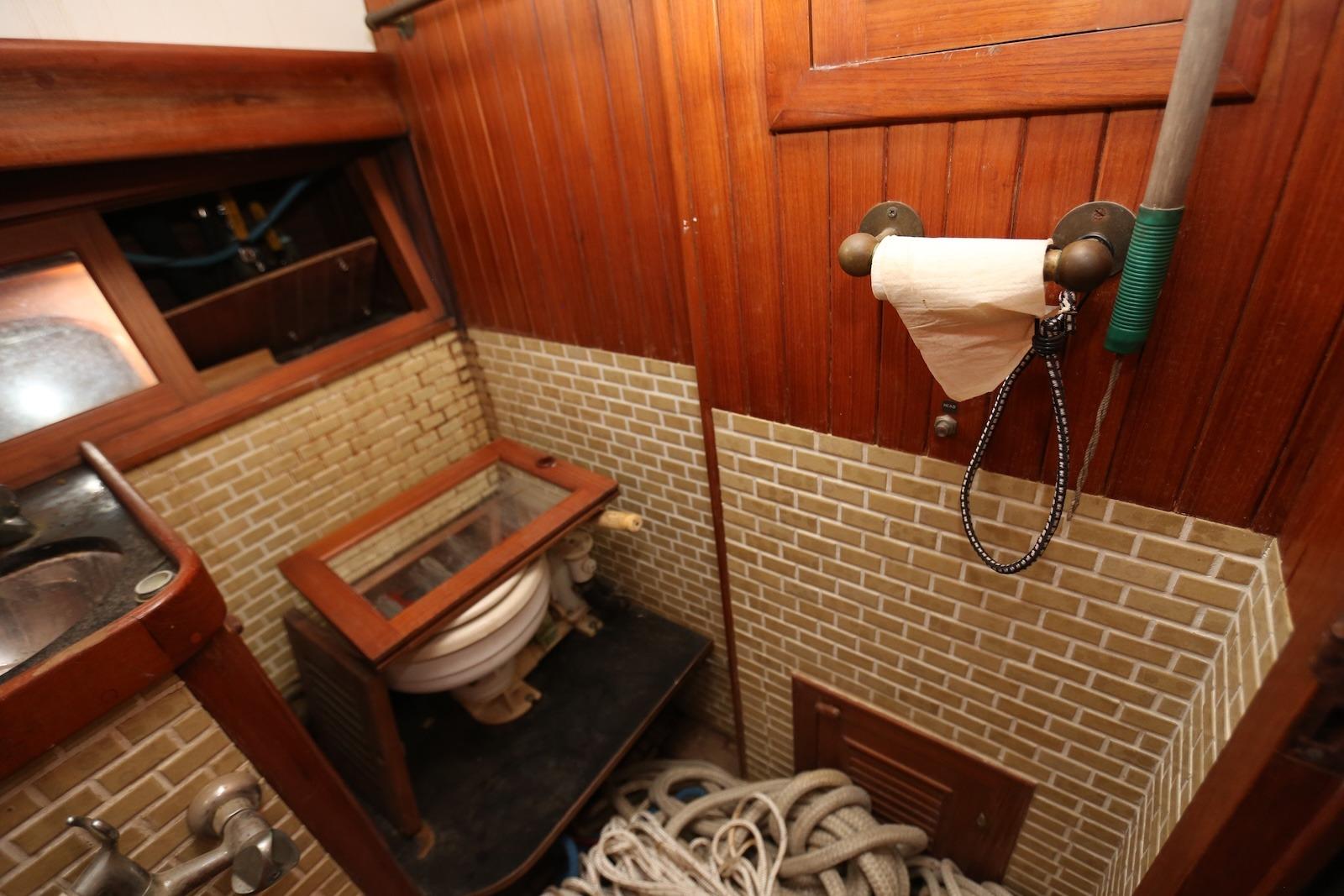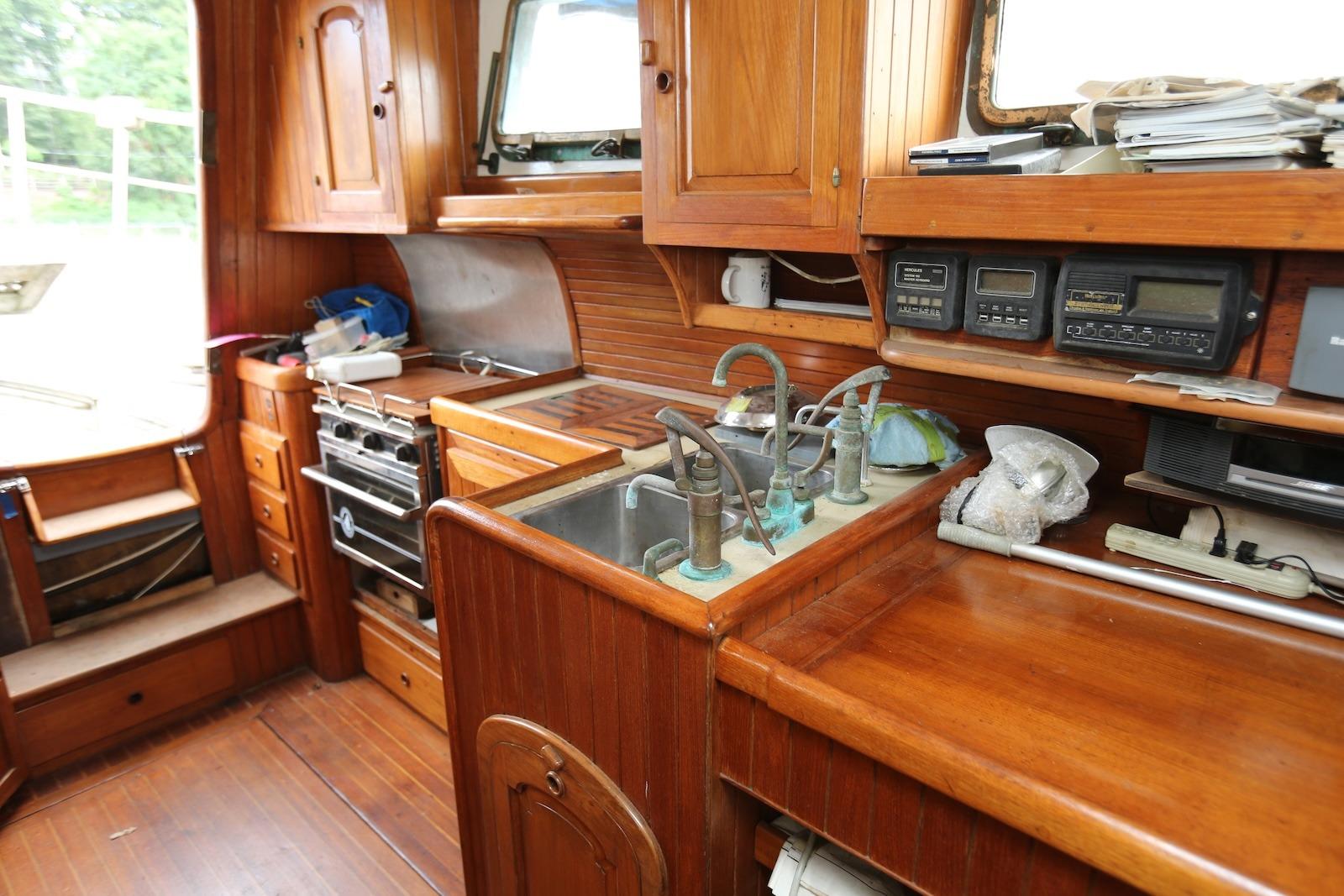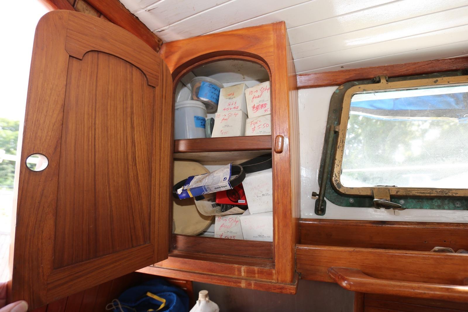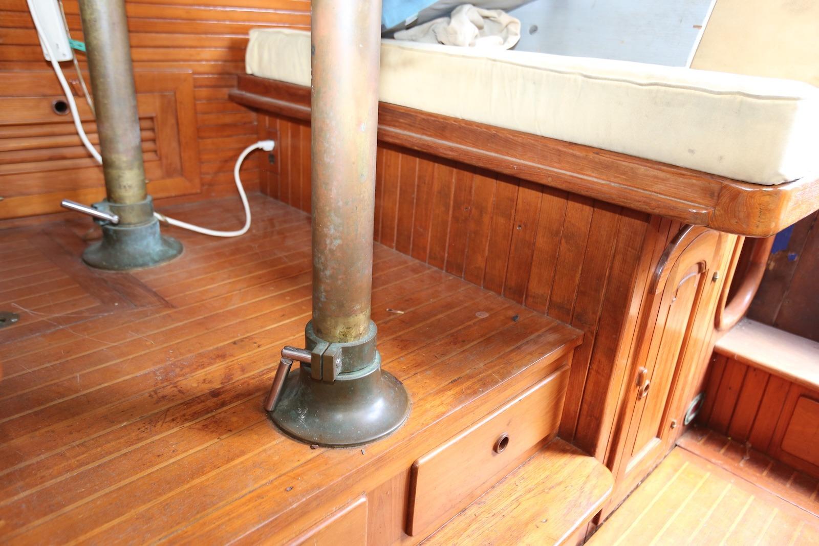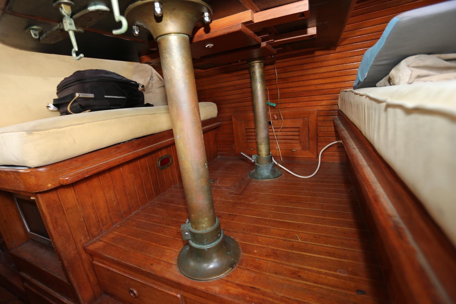 Main pilothouse cabin with helm, convertible double-berth dinette, communications and chart table/ workstation and galley with gimbal 2-burner stove and oven, SS double sink with original brass fixtures, microwave and huge refrigerated icebox, all with ample ambient lighting and ventilation via large wrap-around brass and bronze framed portlights.