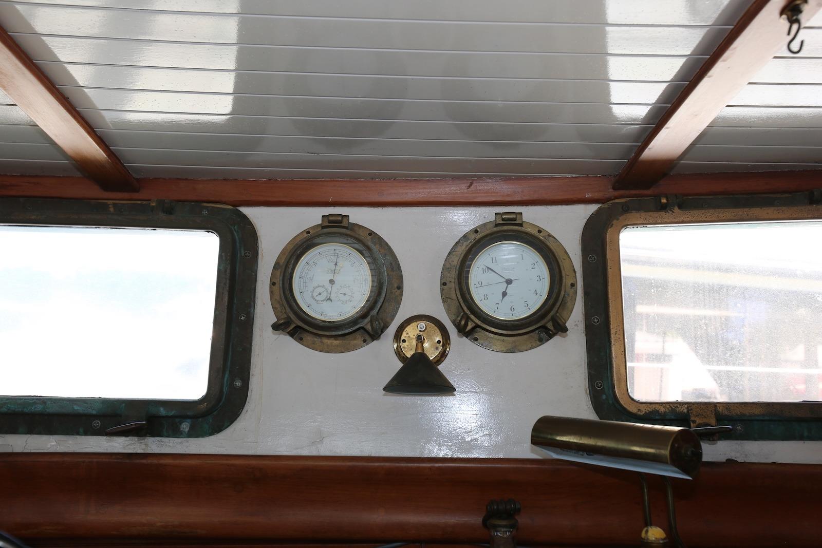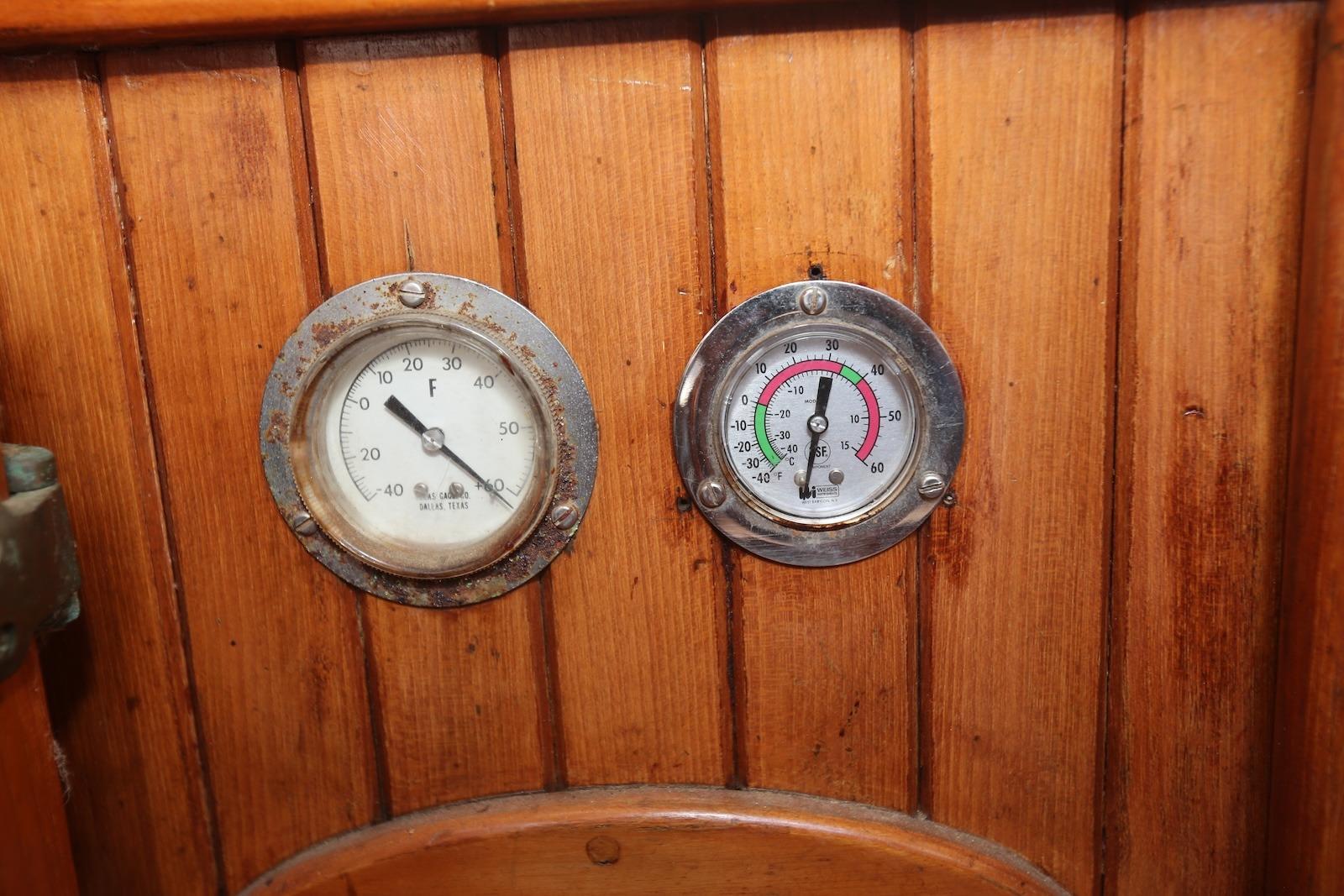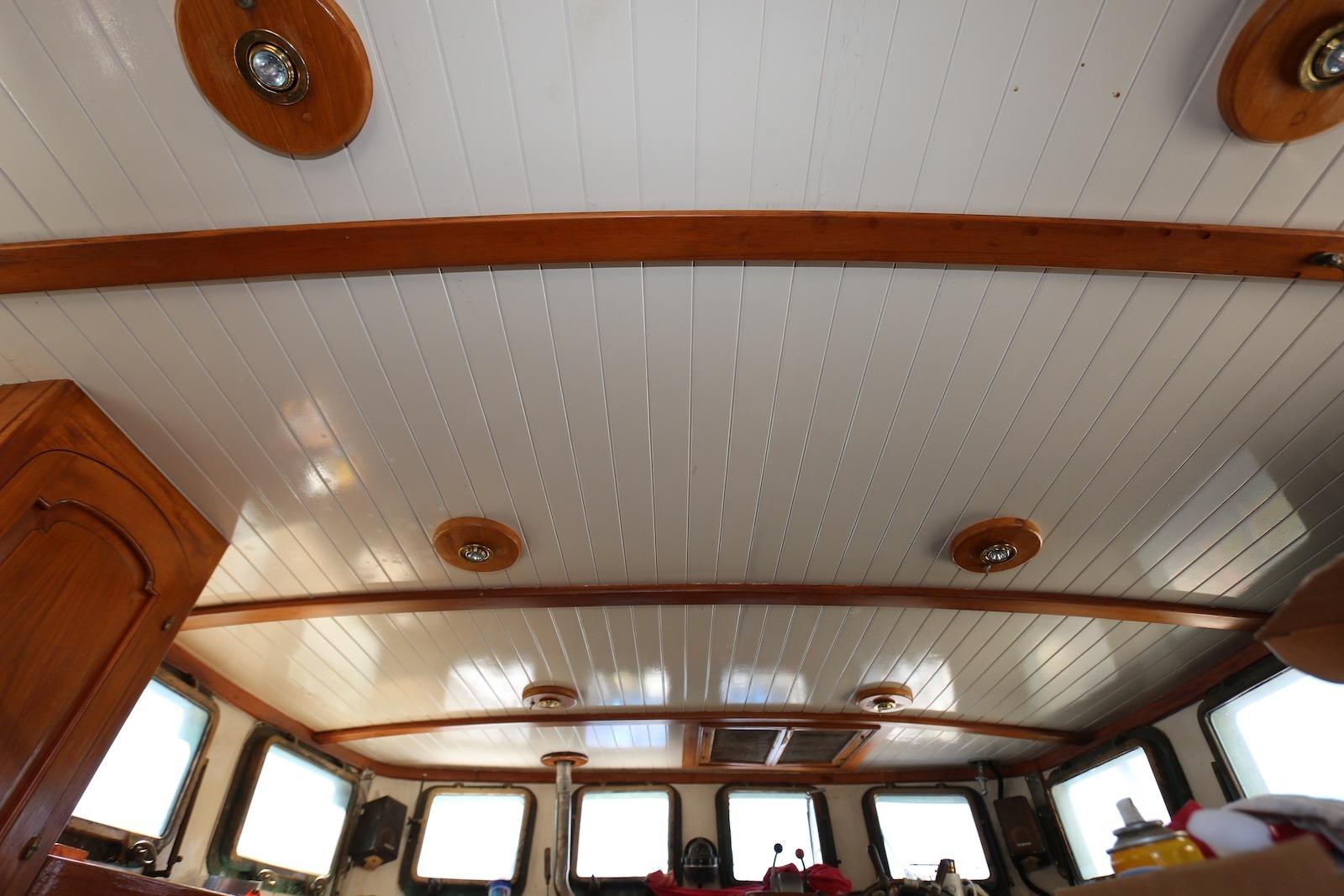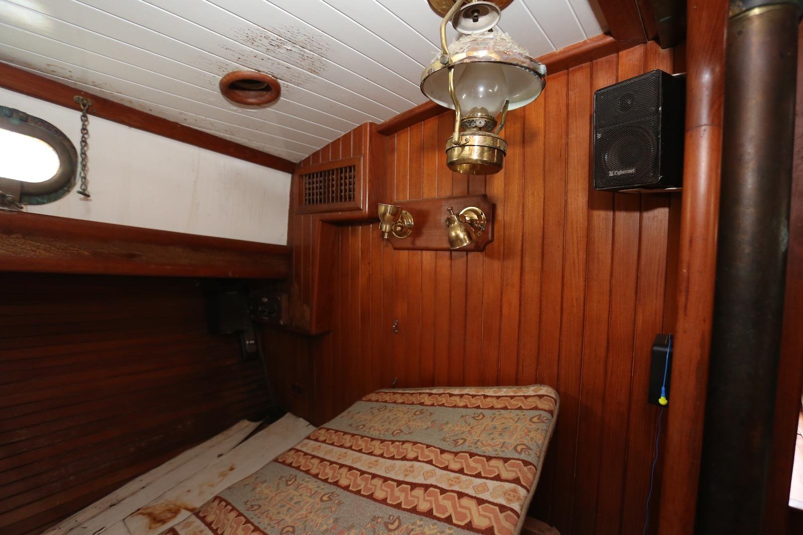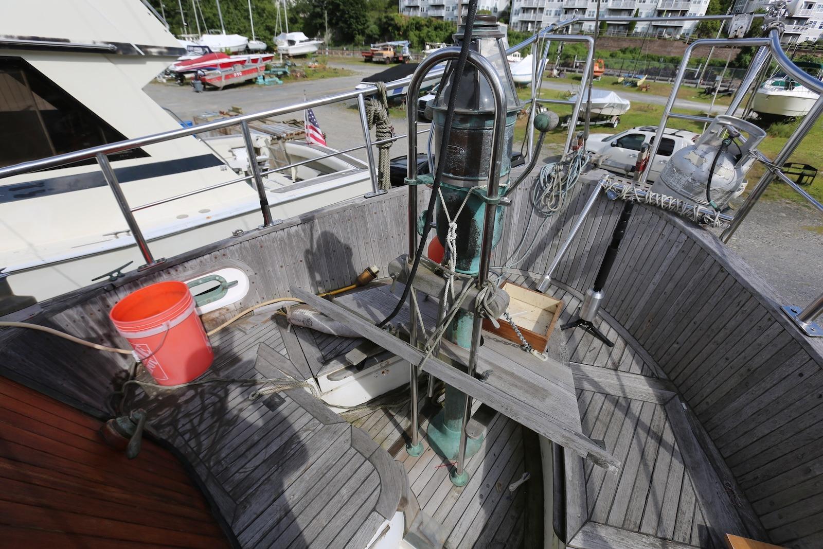 Main pilothouse cabin with helm, convertible double-berth dinette, communications and chart table/ workstation and galley with gimbal 2-burner stove and oven, SS double sink with original brass fixtures, microwave and huge refrigerated icebox, all with ample ambient lighting and ventilation via large wrap-around brass and bronze framed portlights.