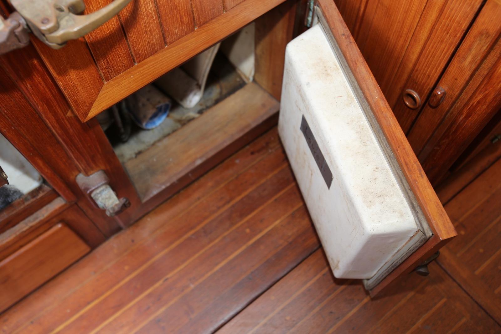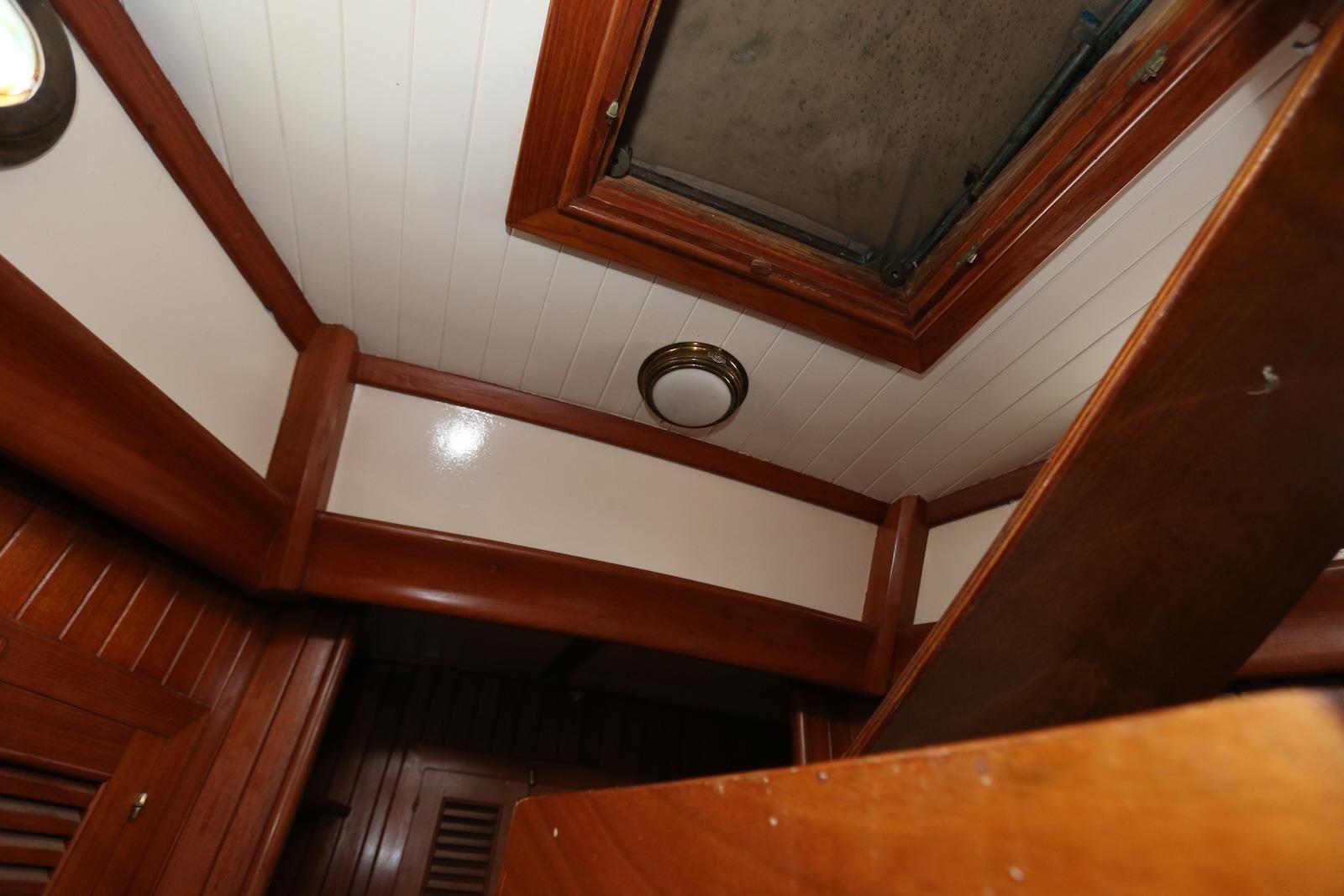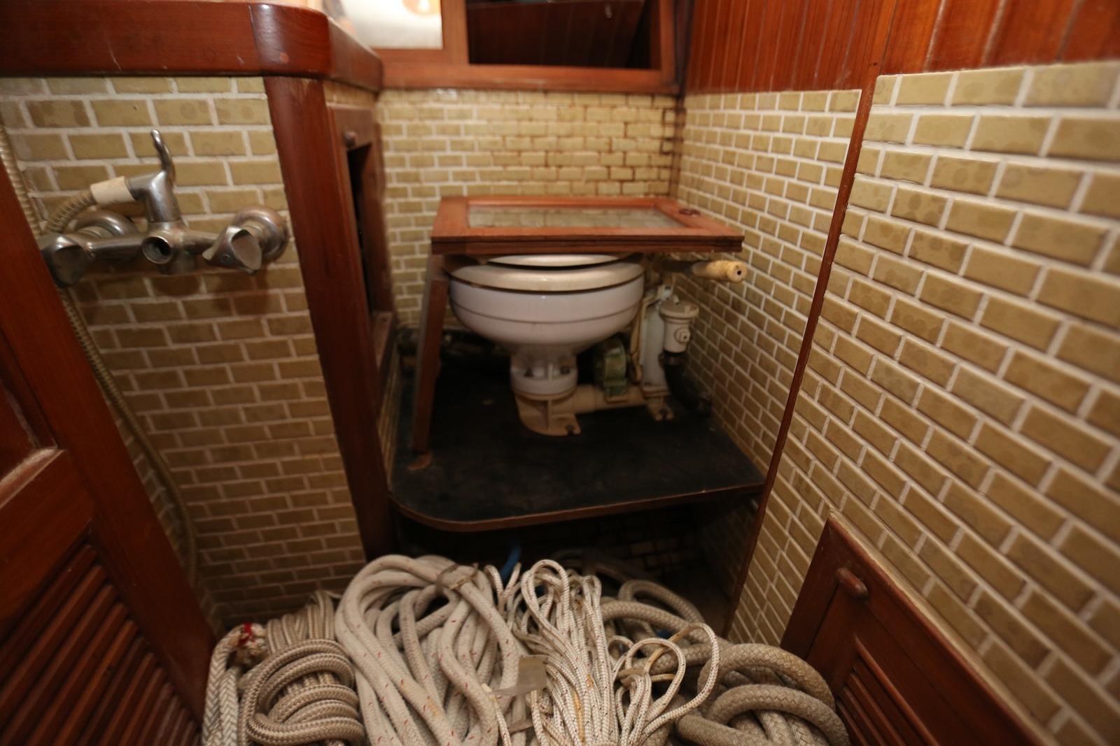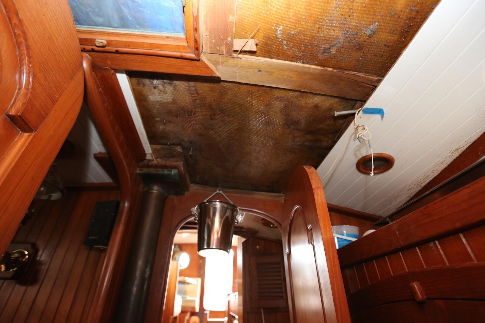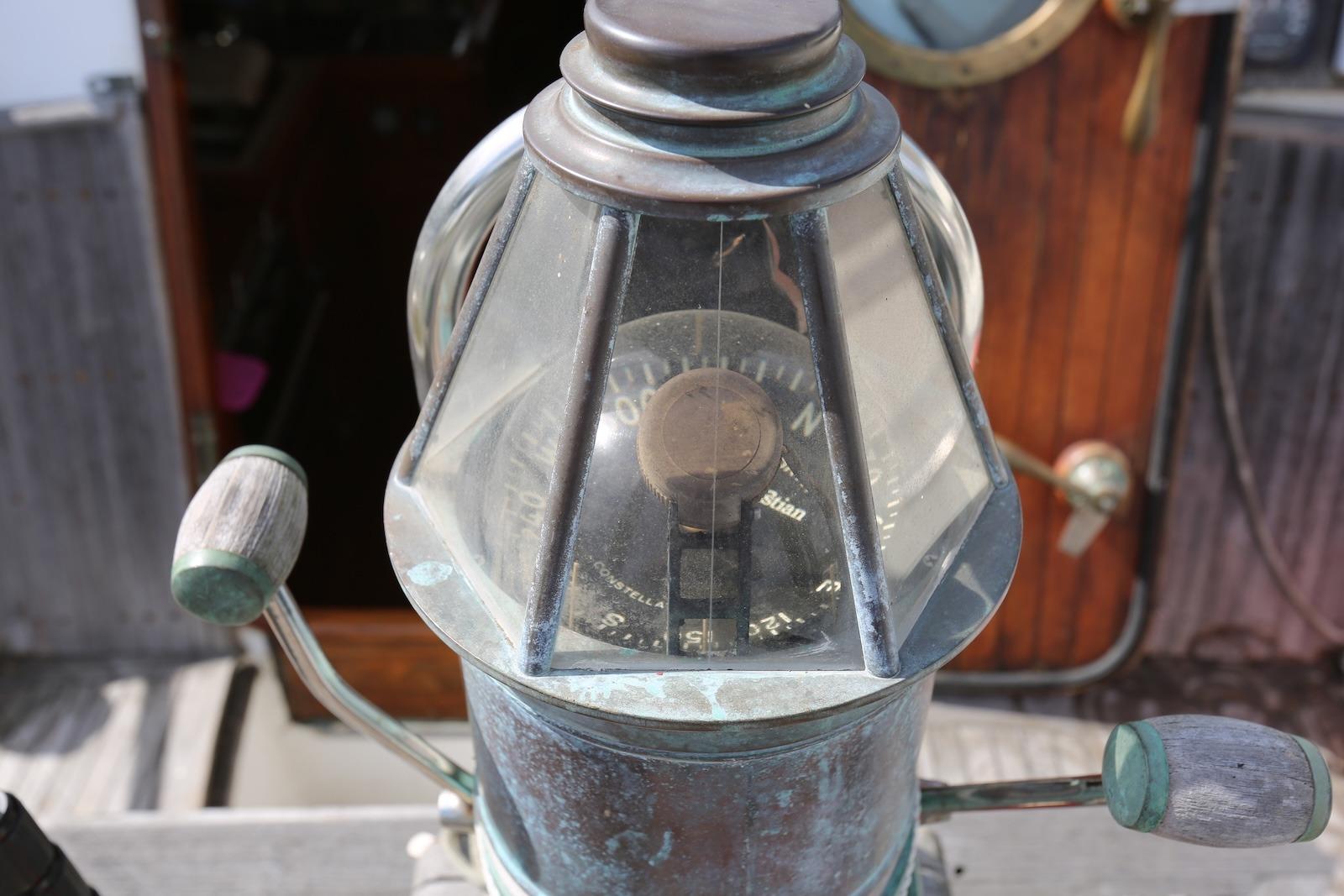 Main pilothouse cabin with helm, convertible double-berth dinette, communications and chart table/ workstation and galley with gimbal 2-burner stove and oven, SS double sink with original brass fixtures, microwave and huge refrigerated icebox, all with ample ambient lighting and ventilation via large wrap-around brass and bronze framed portlights.