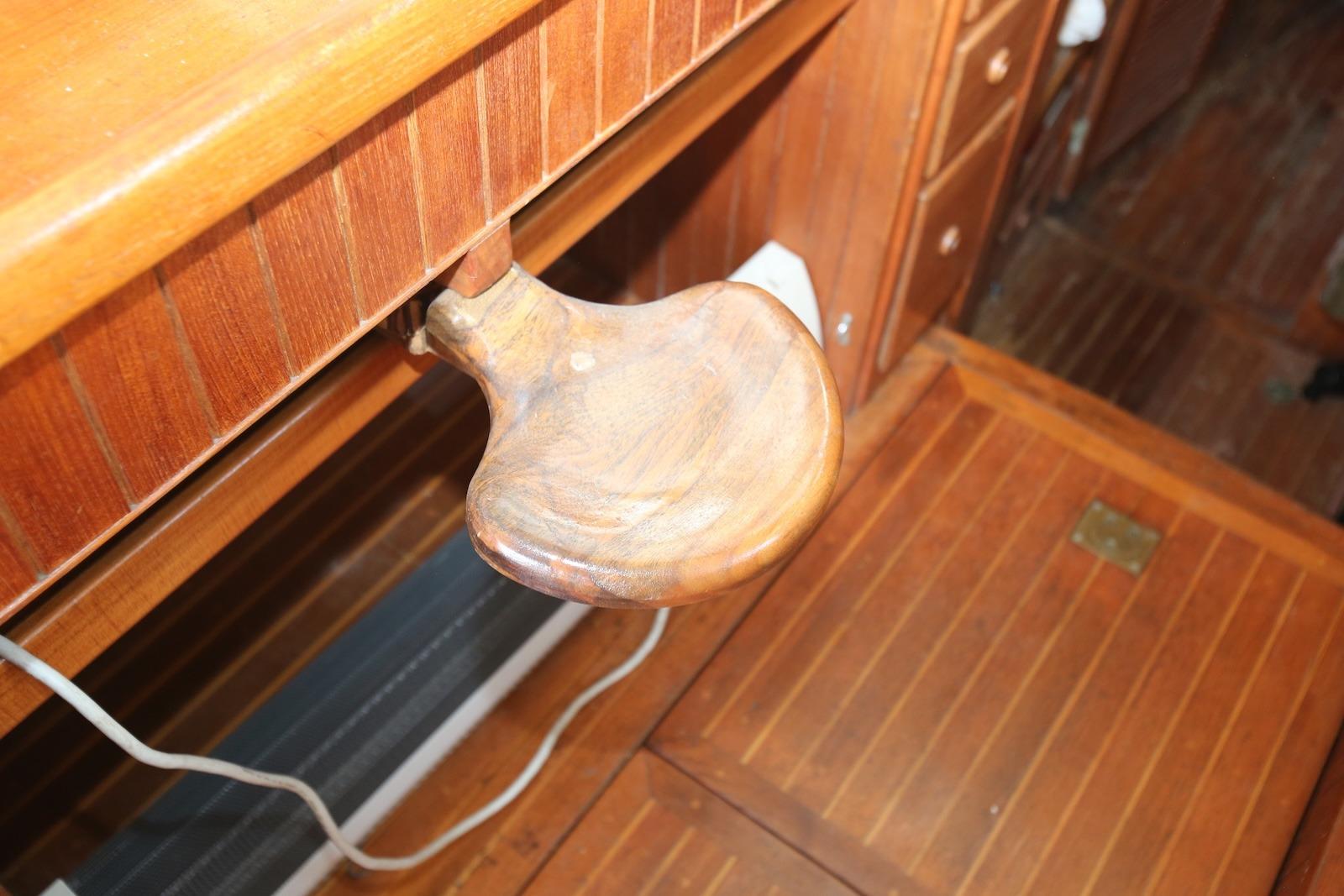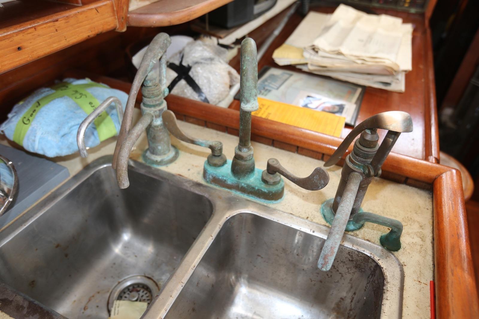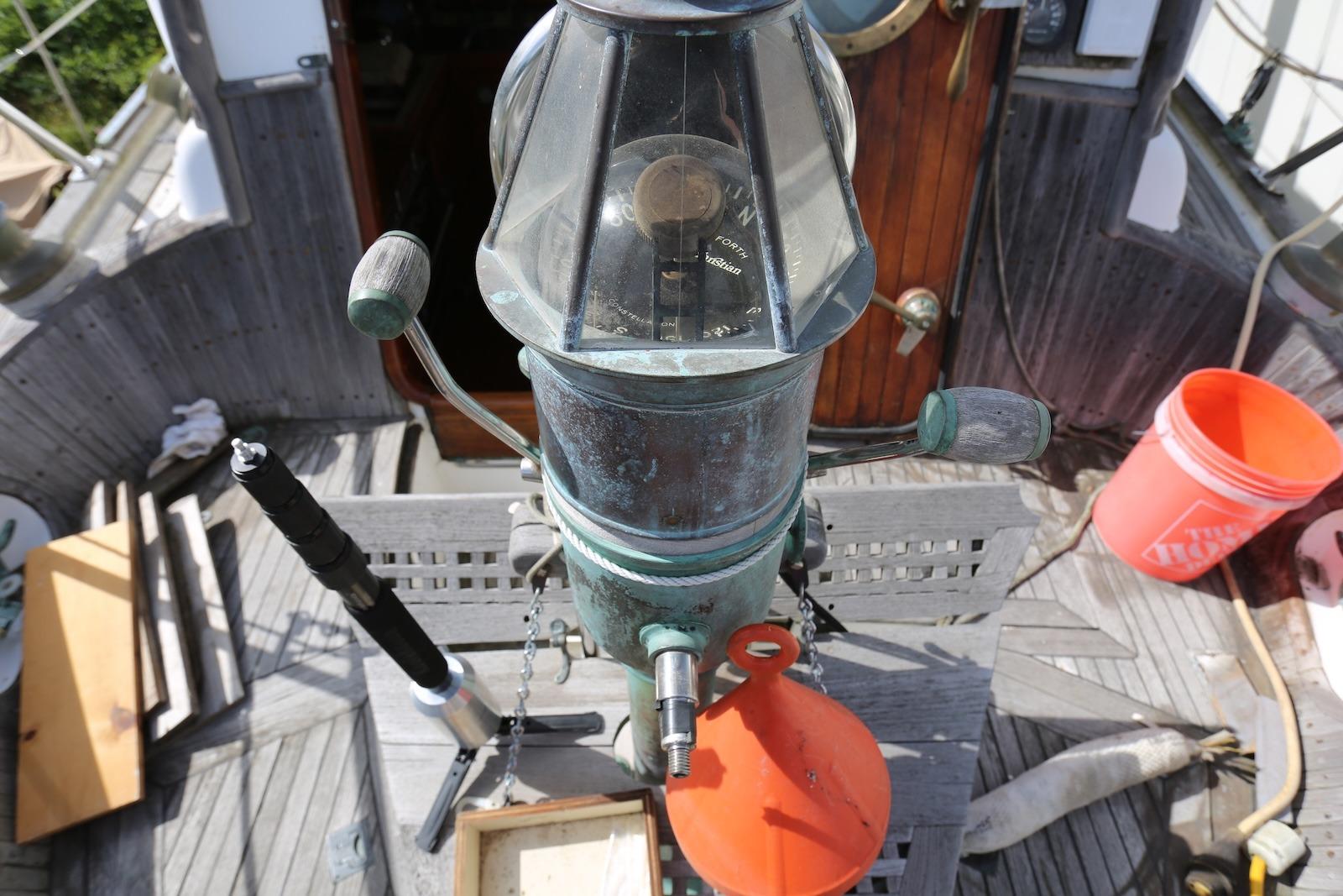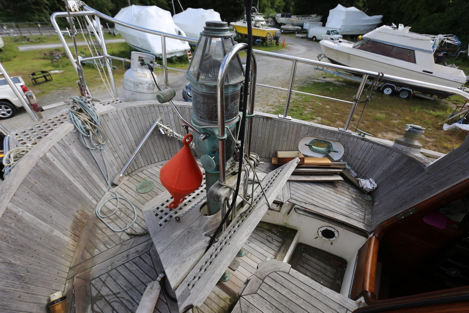 Main pilothouse cabin with helm, convertible double-berth dinette, communications and chart table/ workstation and galley with gimbal 2-burner stove and oven, SS double sink with original brass fixtures, microwave and huge refrigerated icebox, all with ample ambient lighting and ventilation via large wrap-around brass and bronze framed portlights.