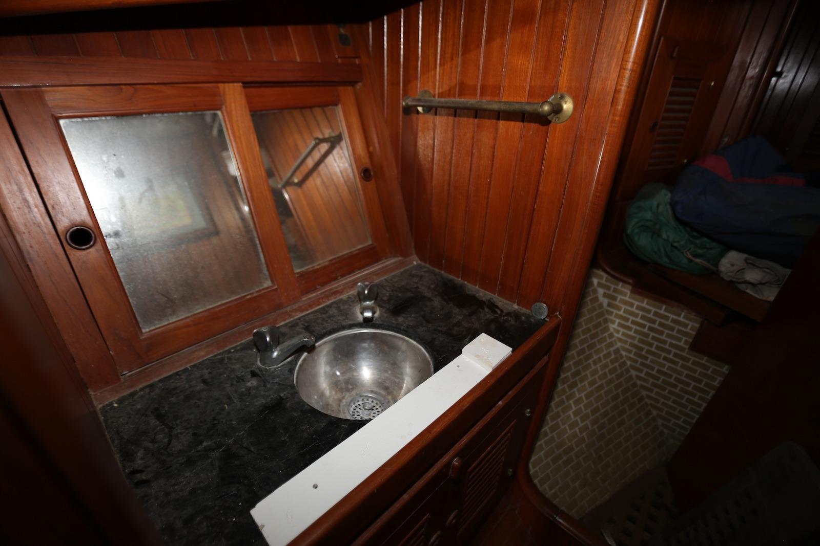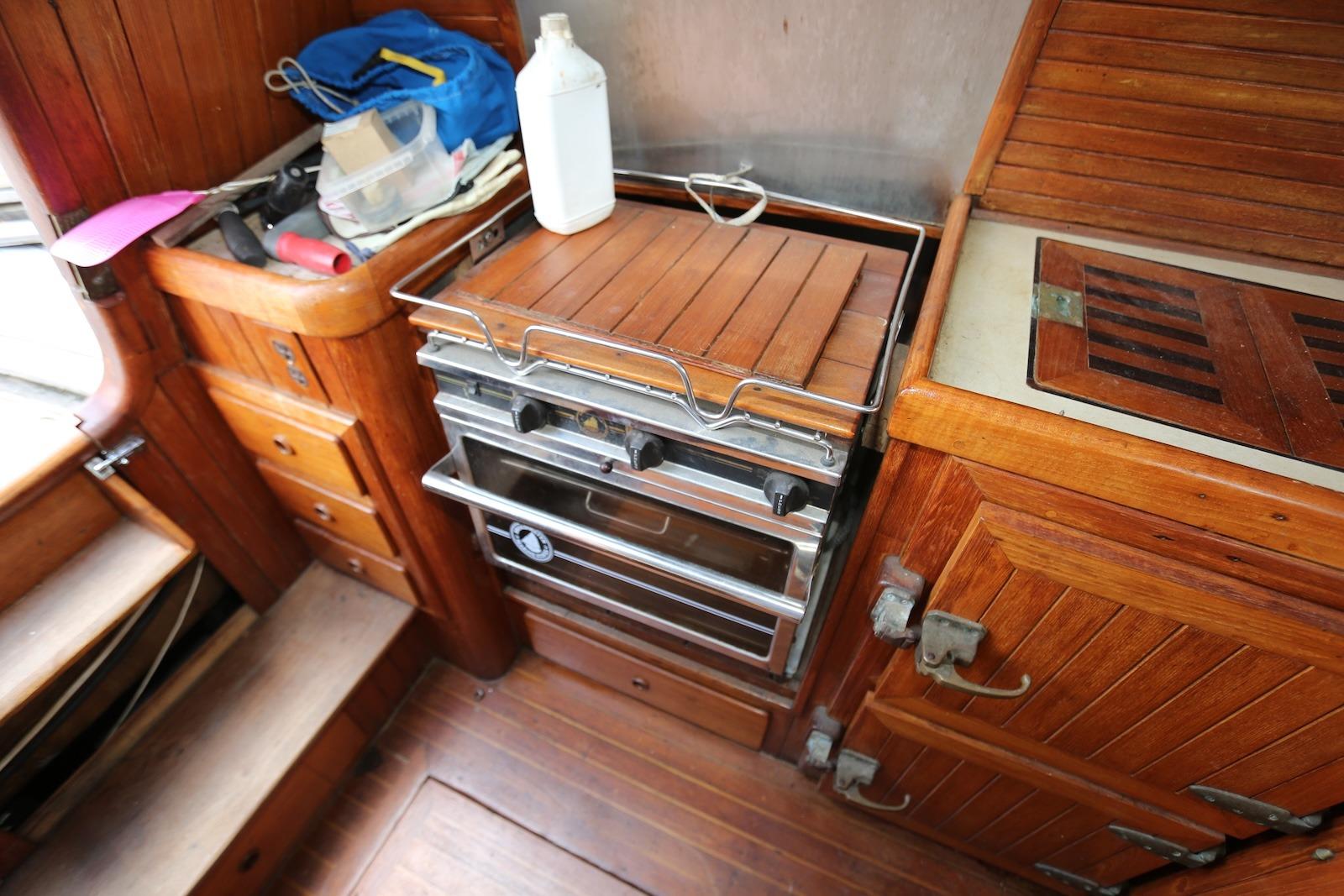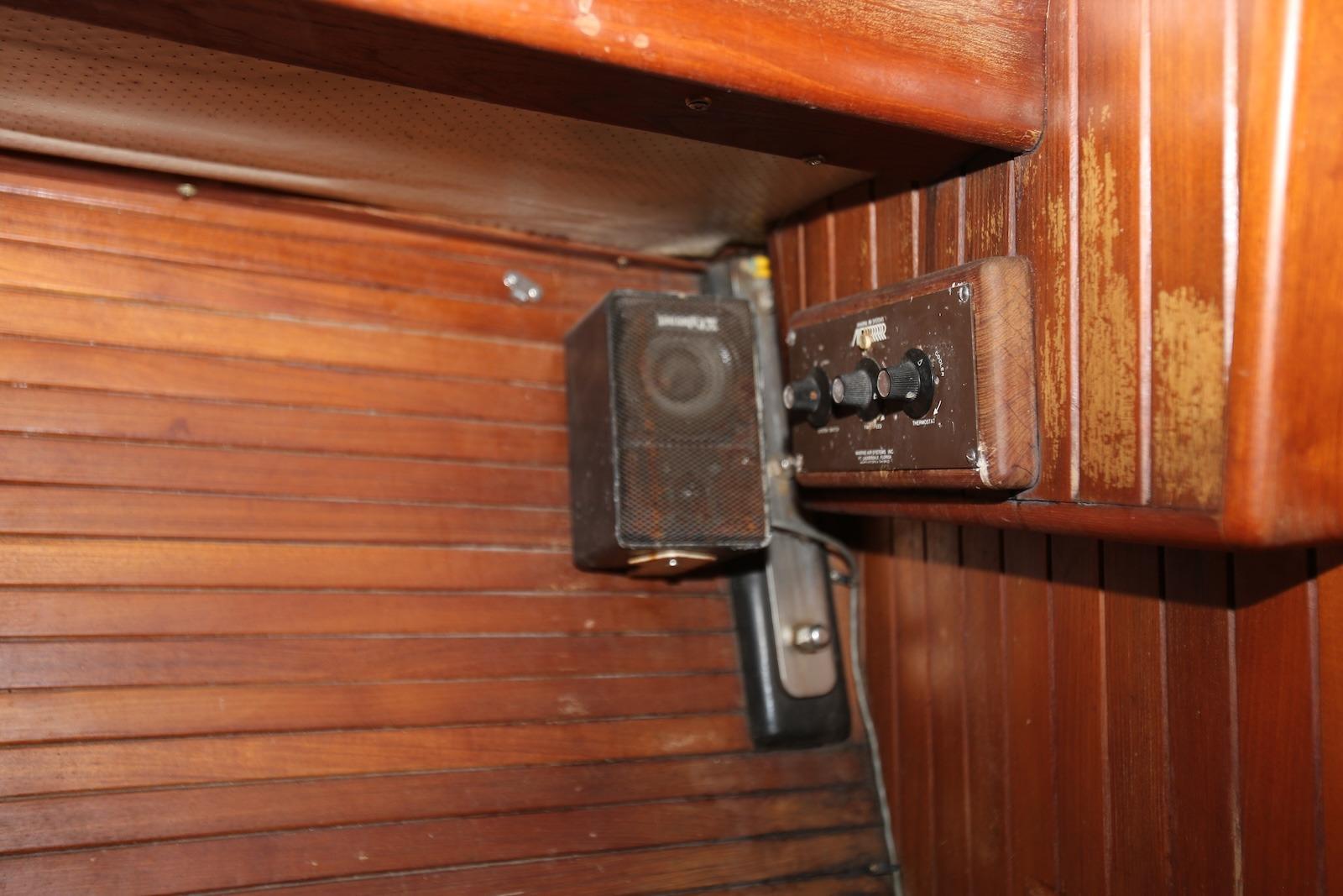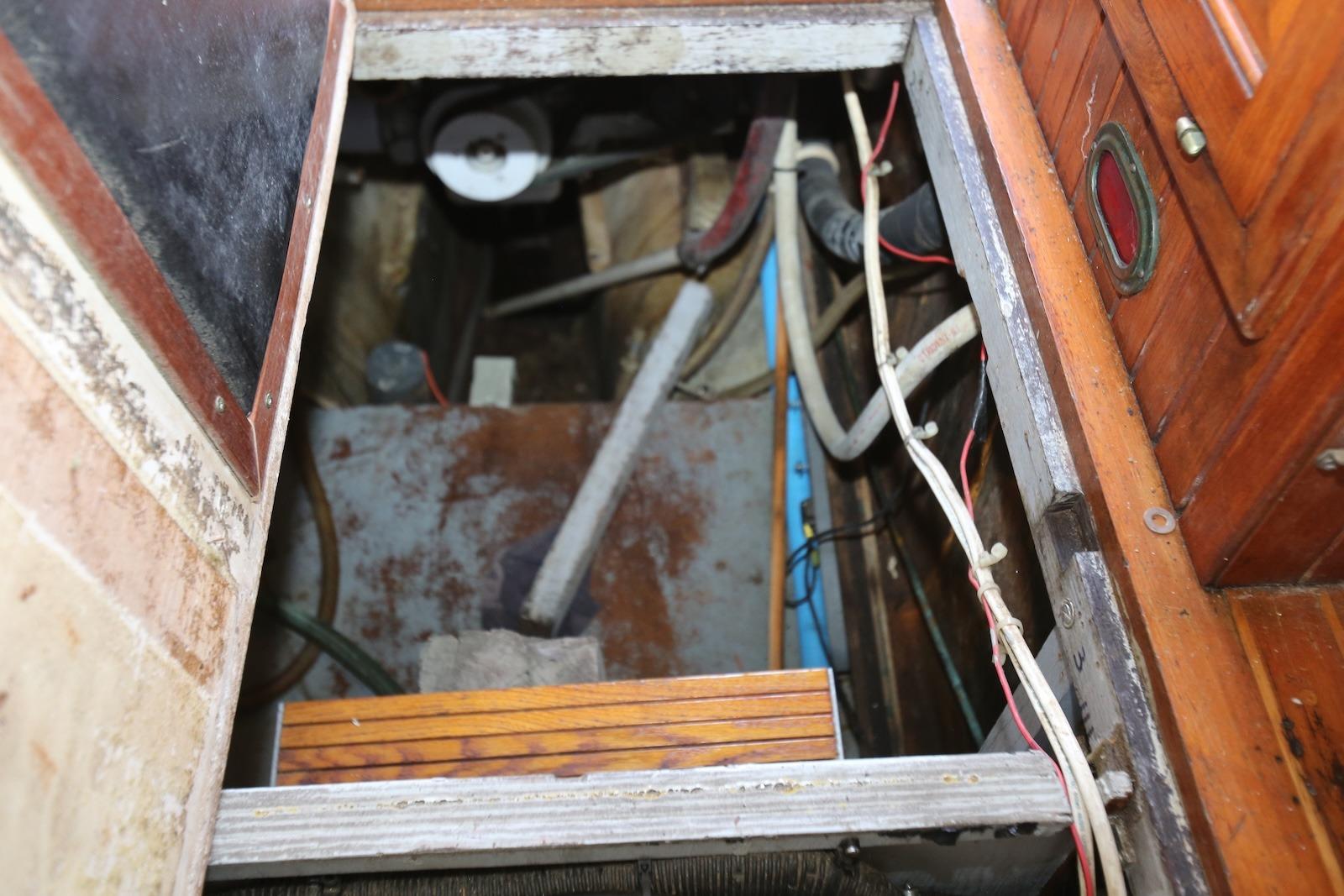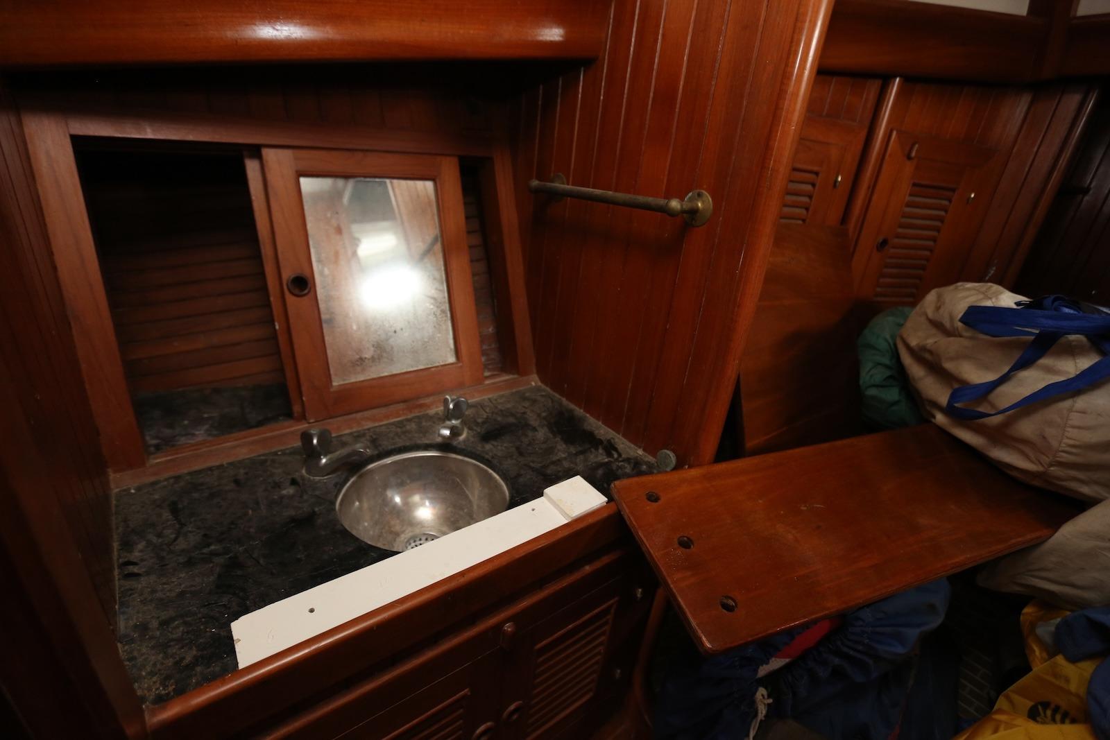 Main pilothouse cabin with helm, convertible double-berth dinette, communications and chart table/ workstation and galley with gimbal 2-burner stove and oven, SS double sink with original brass fixtures, microwave and huge refrigerated icebox, all with ample ambient lighting and ventilation via large wrap-around brass and bronze framed portlights.