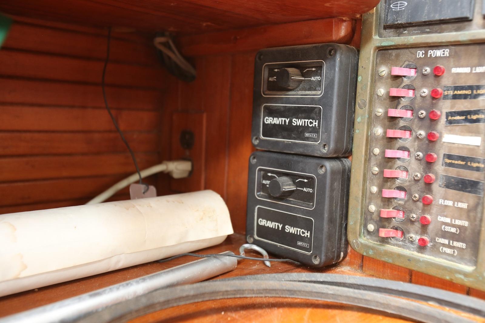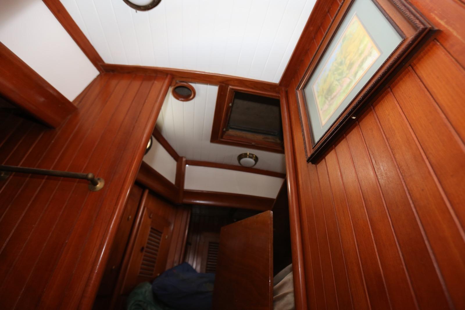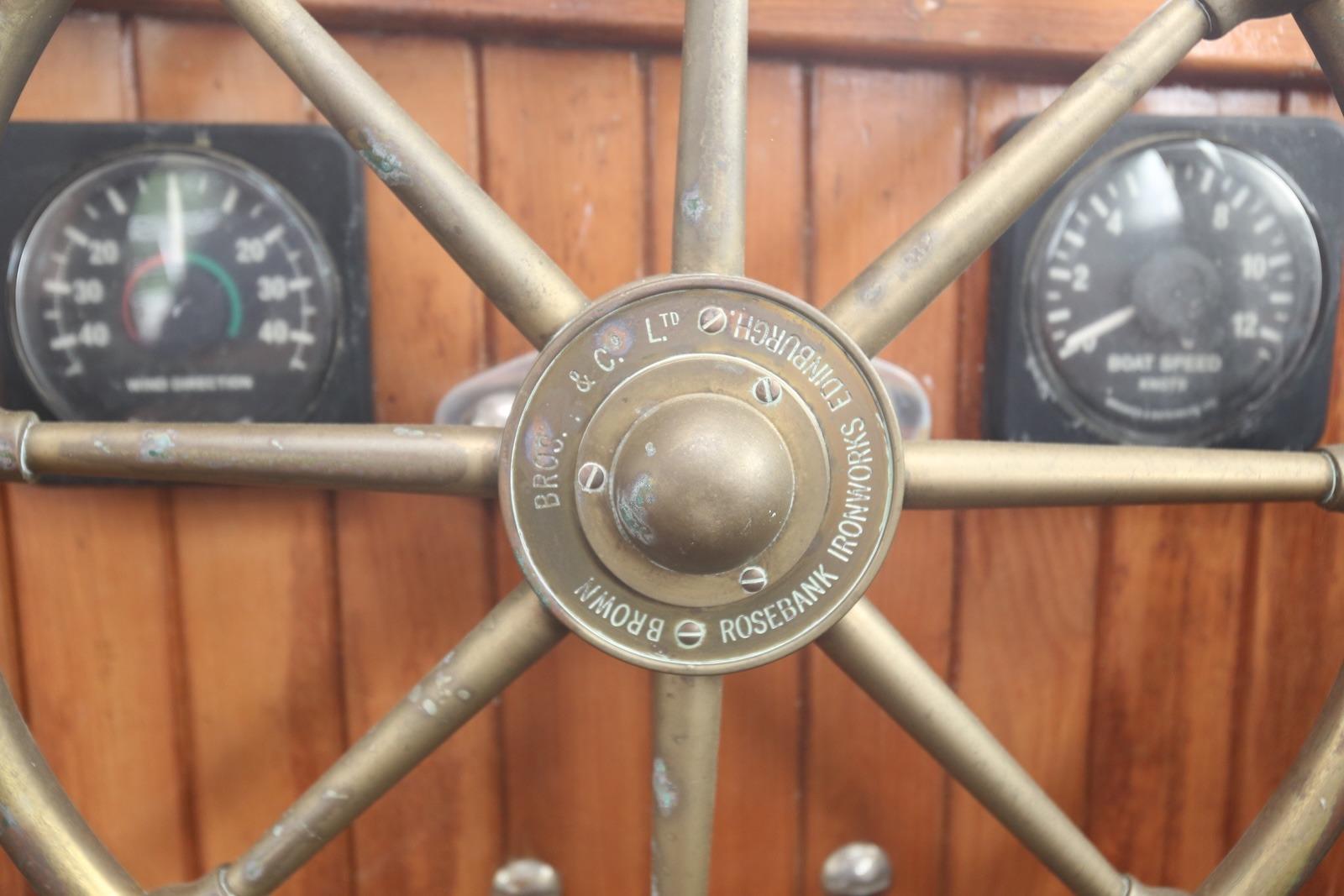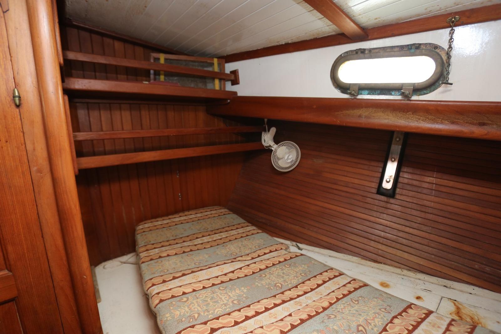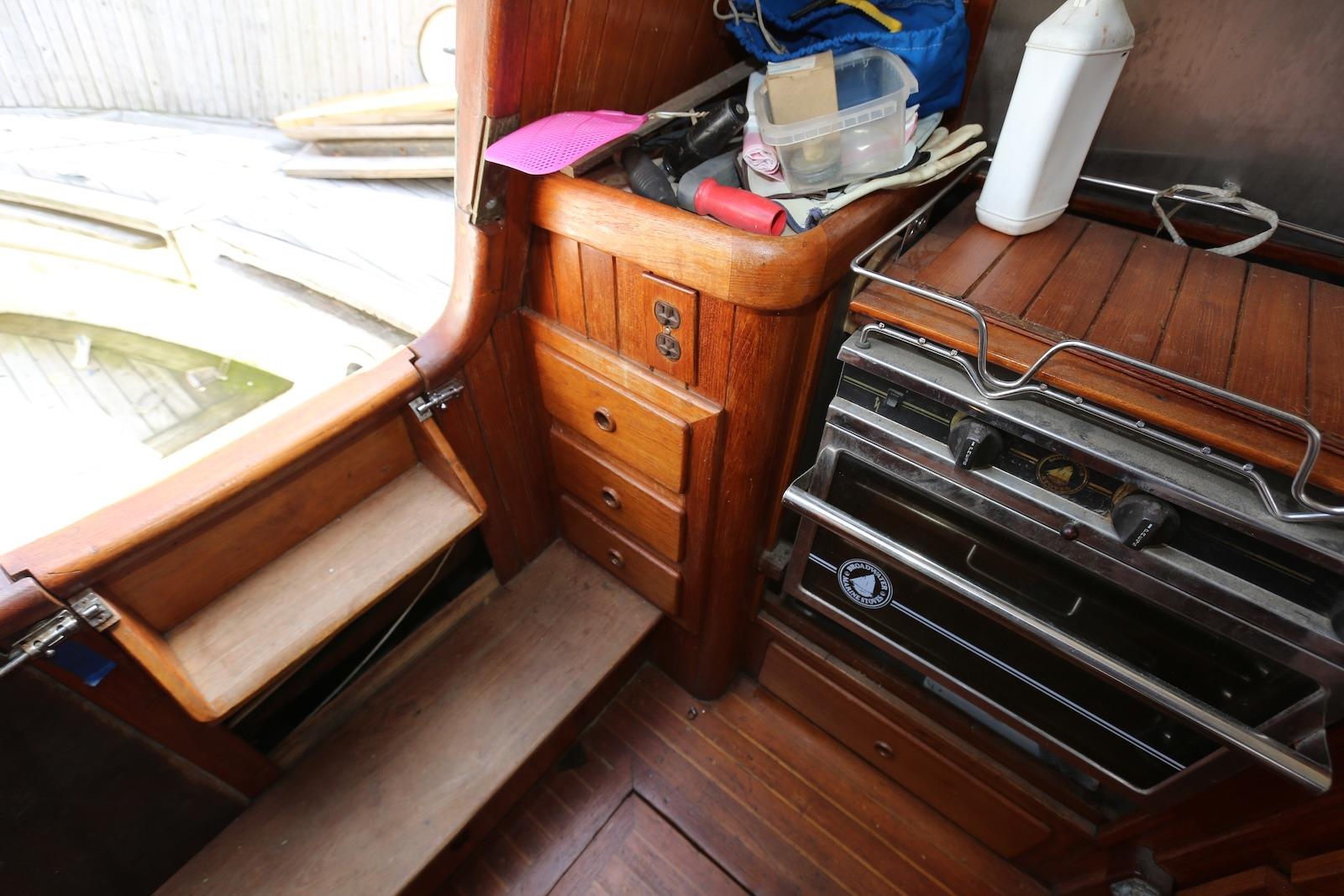 Main pilothouse cabin with helm, convertible double-berth dinette, communications and chart table/ workstation and galley with gimbal 2-burner stove and oven, SS double sink with original brass fixtures, microwave and huge refrigerated icebox, all with ample ambient lighting and ventilation via large wrap-around brass and bronze framed portlights.