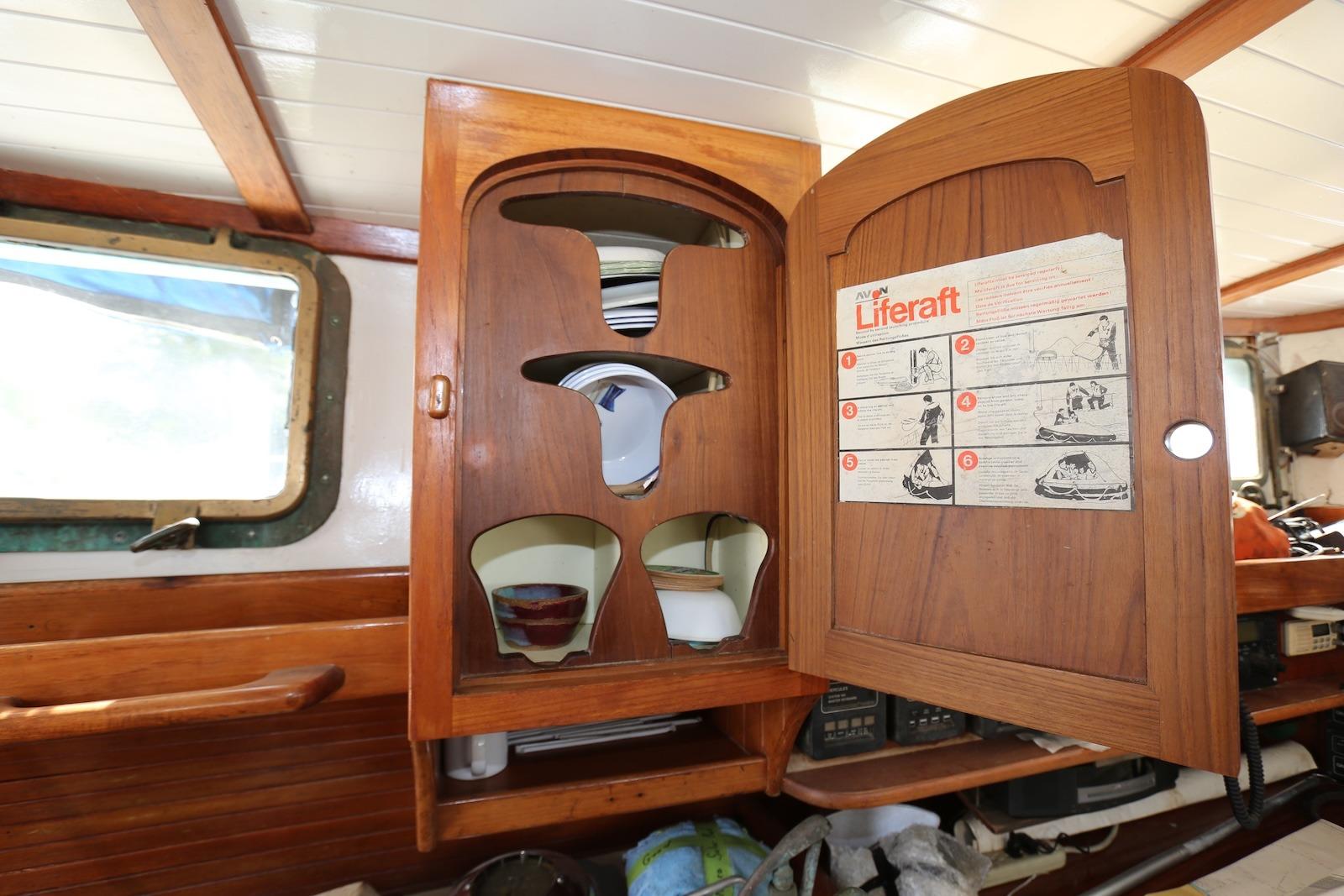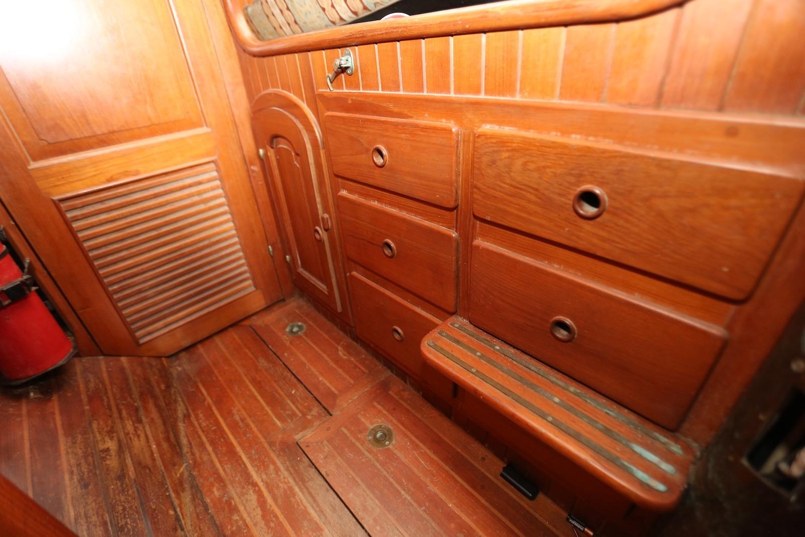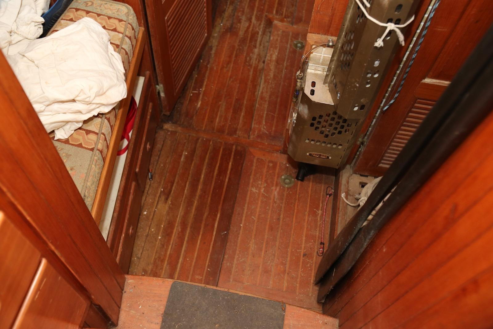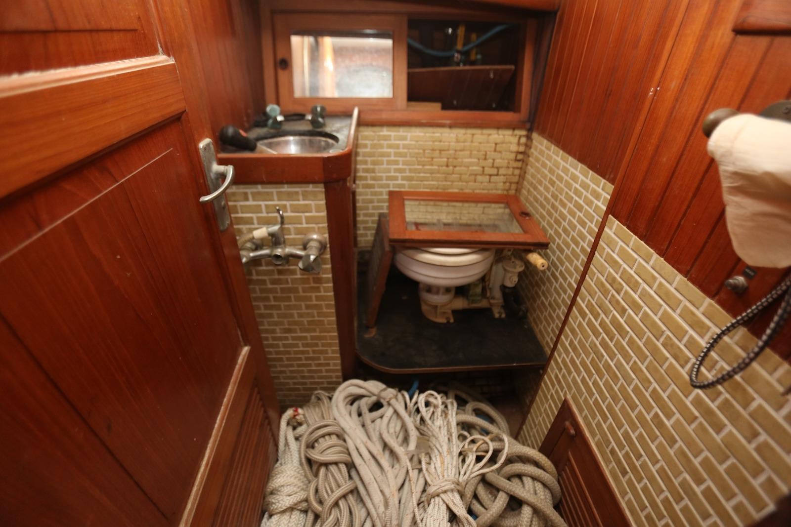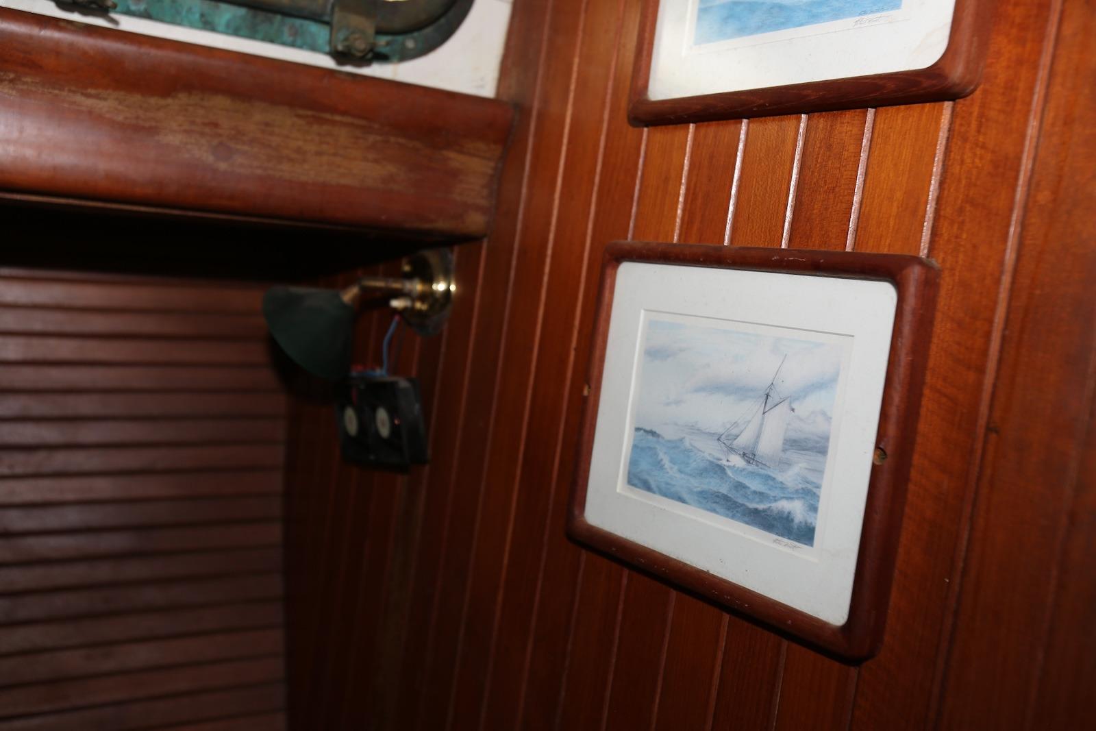 Main pilothouse cabin with helm, convertible double-berth dinette, communications and chart table/ workstation and galley with gimbal 2-burner stove and oven, SS double sink with original brass fixtures, microwave and huge refrigerated icebox, all with ample ambient lighting and ventilation via large wrap-around brass and bronze framed portlights.