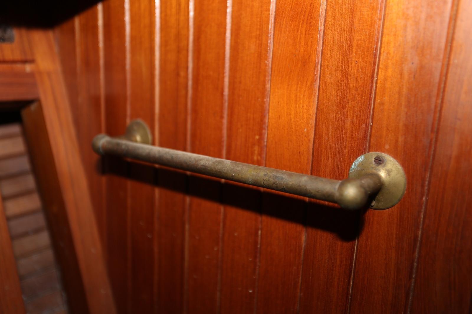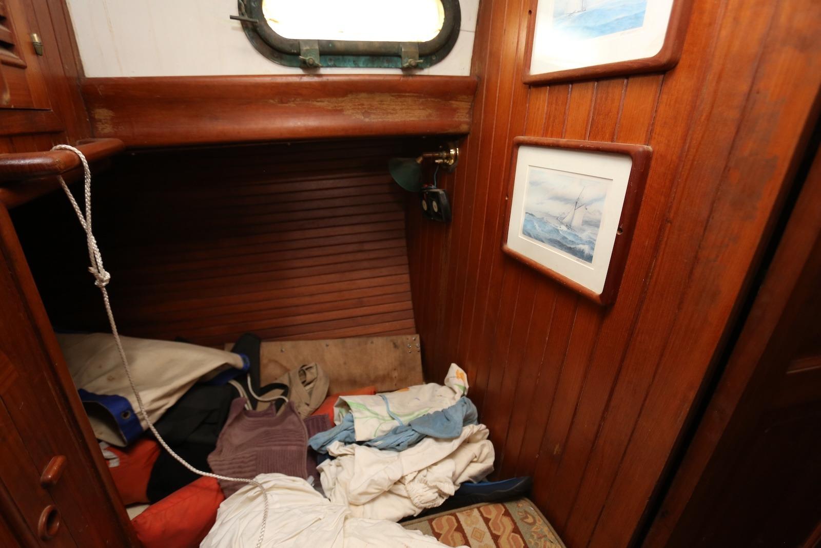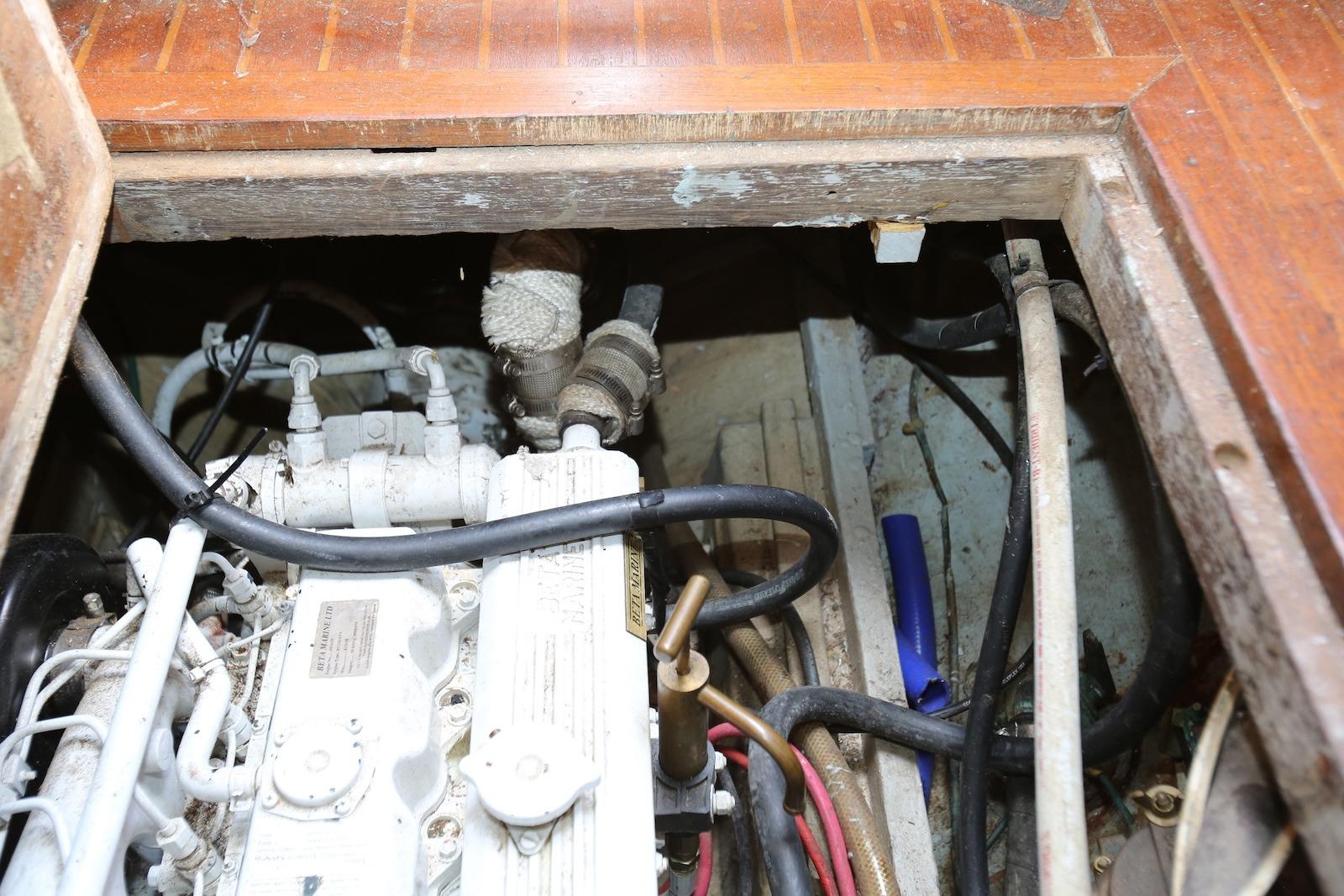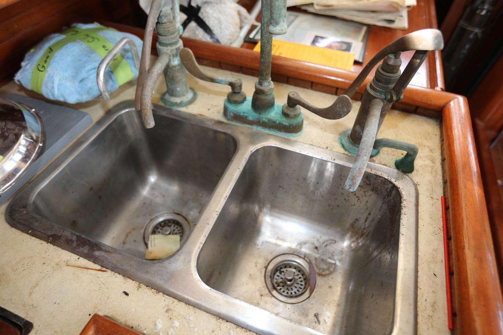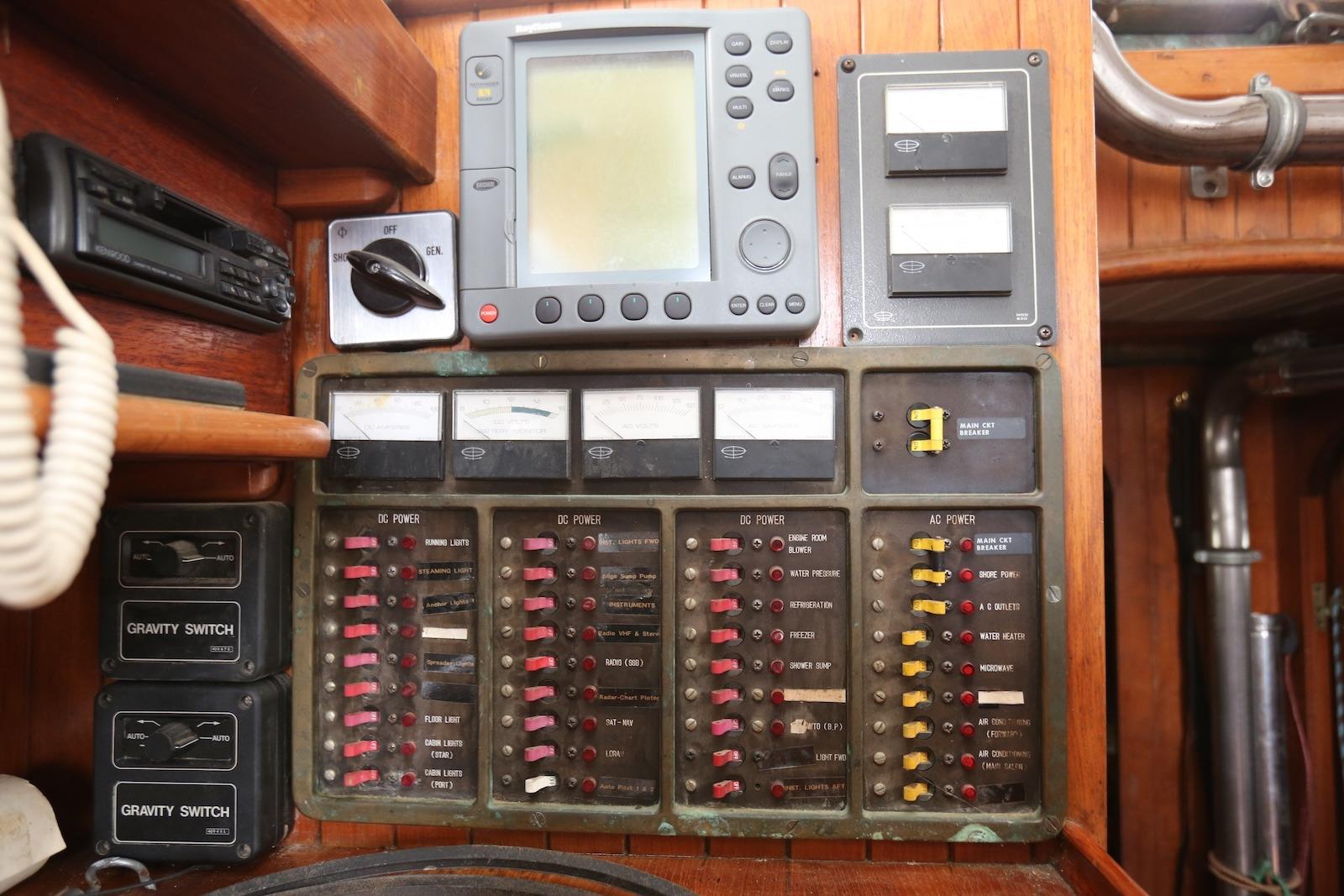 Main pilothouse cabin with helm, convertible double-berth dinette, communications and chart table/ workstation and galley with gimbal 2-burner stove and oven, SS double sink with original brass fixtures, microwave and huge refrigerated icebox, all with ample ambient lighting and ventilation via large wrap-around brass and bronze framed portlights.