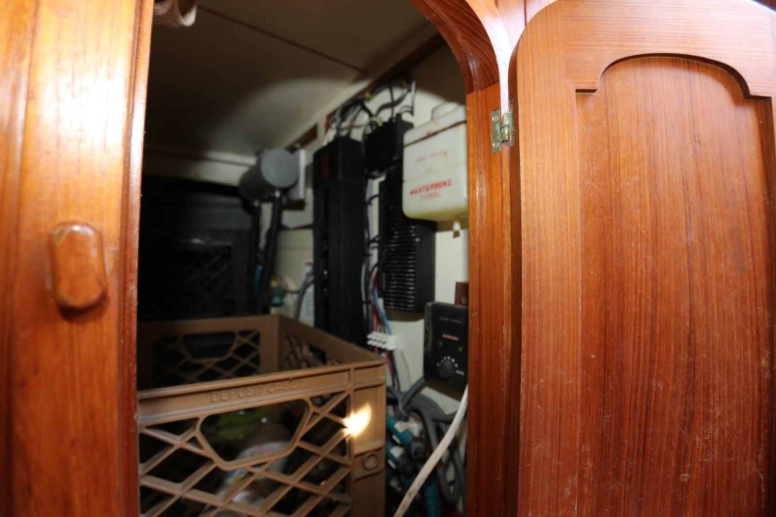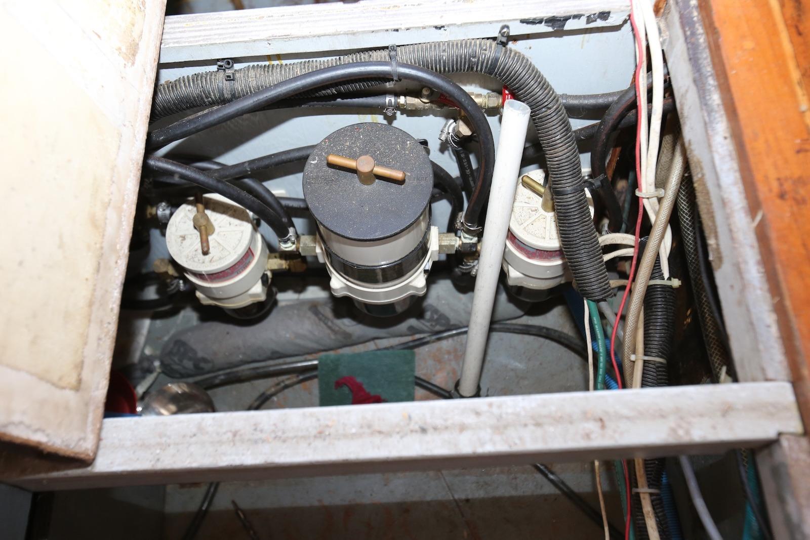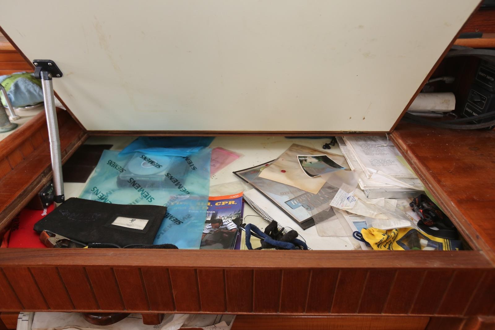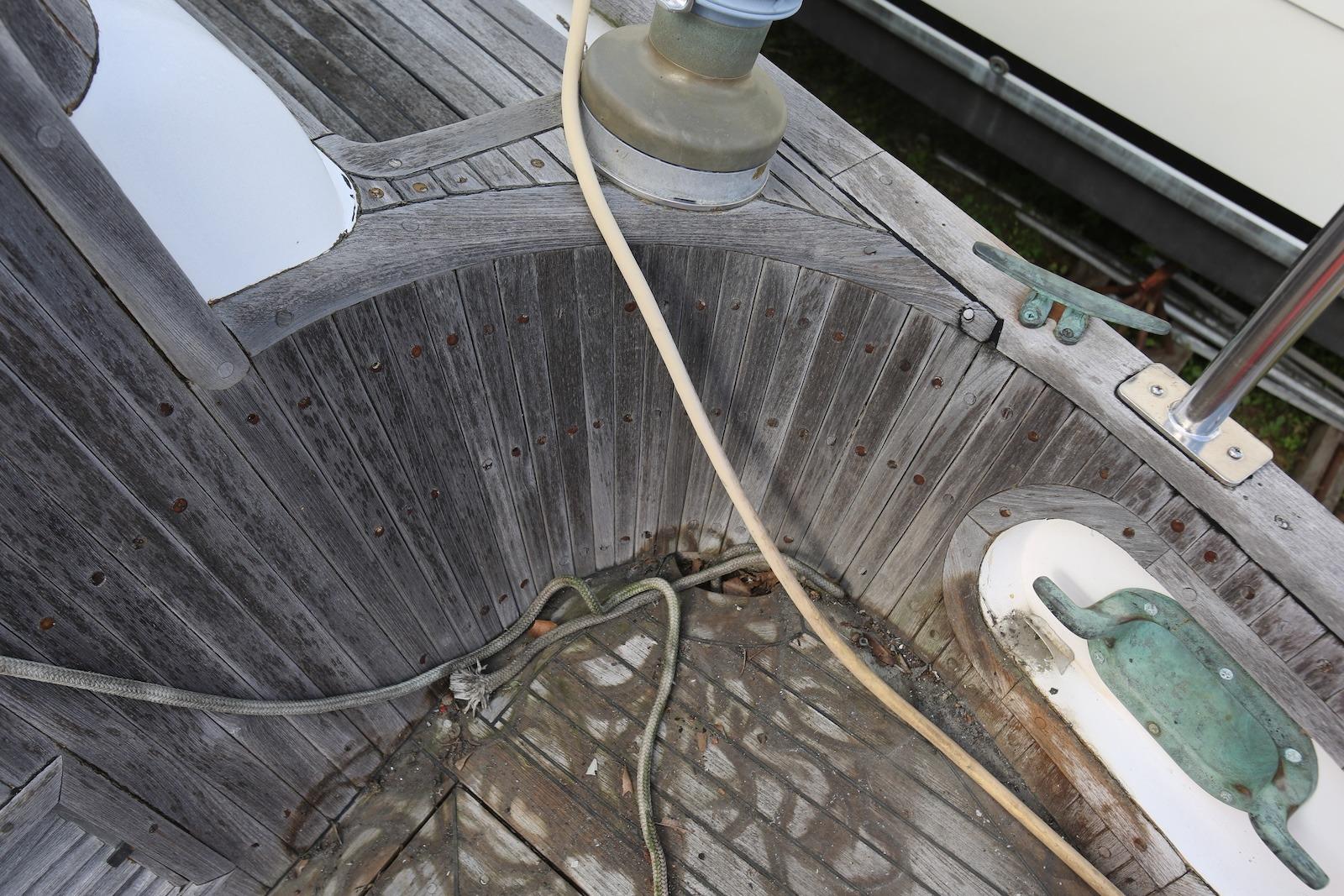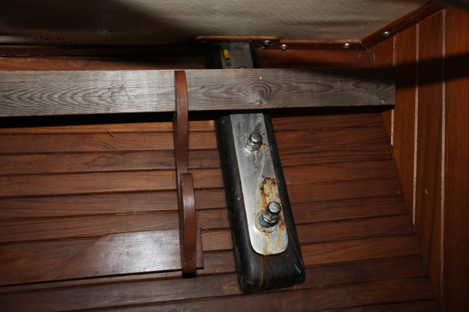Main pilothouse cabin with helm, convertible double-berth dinette, communications and chart table/ workstation and galley with gimbal 2-burner stove and oven, SS double sink with original brass fixtures, microwave and huge refrigerated icebox, all with ample ambient lighting and ventilation via large wrap-around brass and bronze framed portlights.