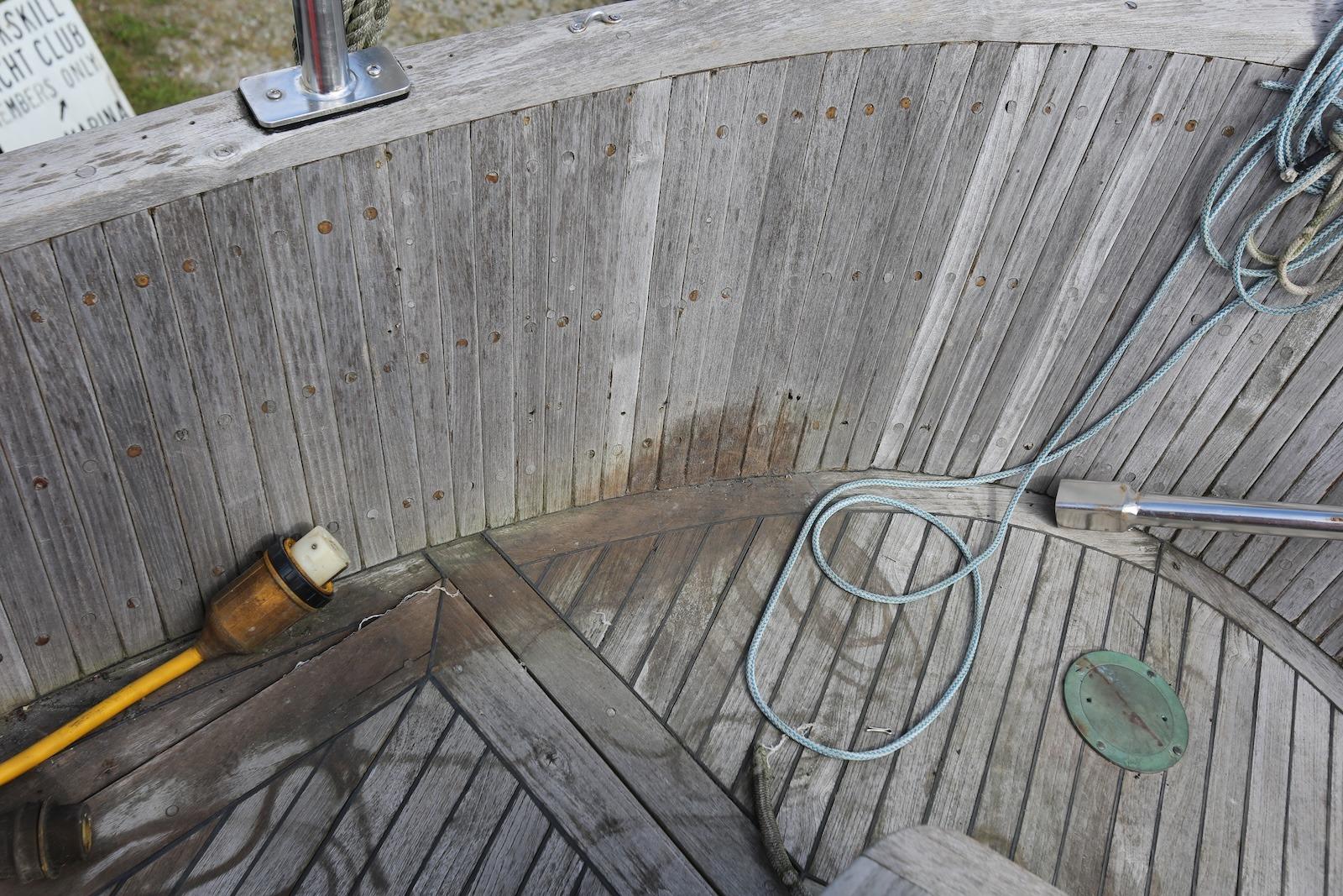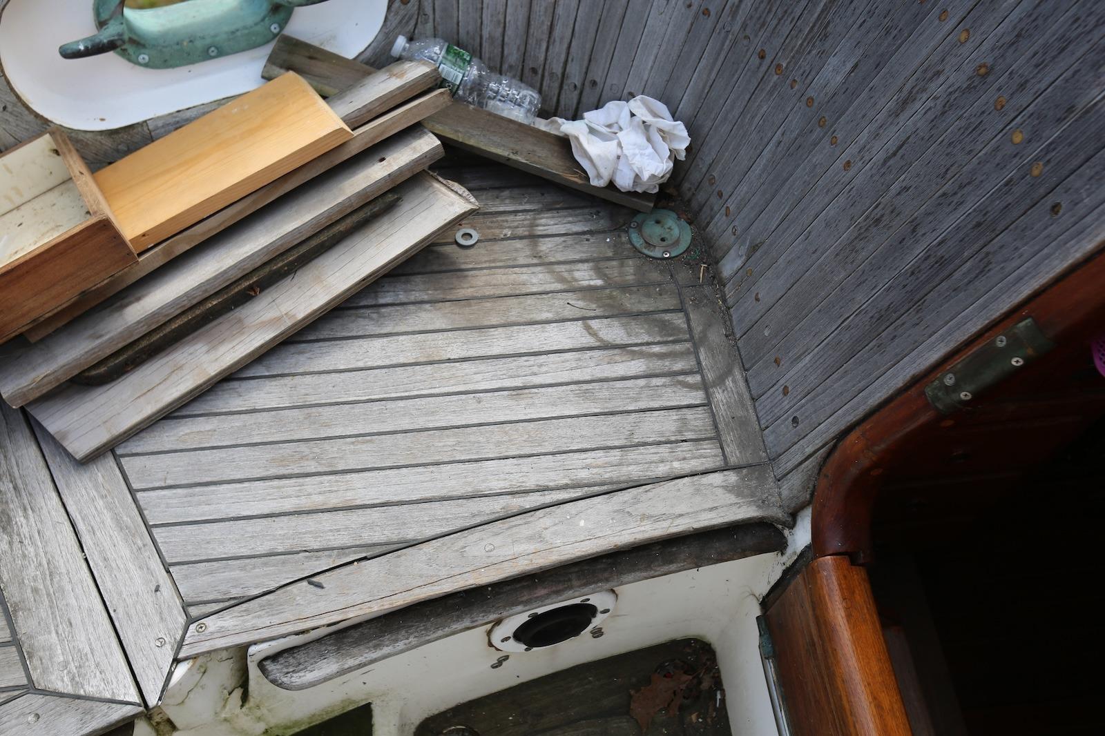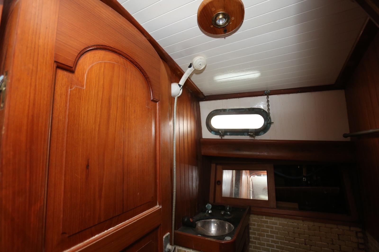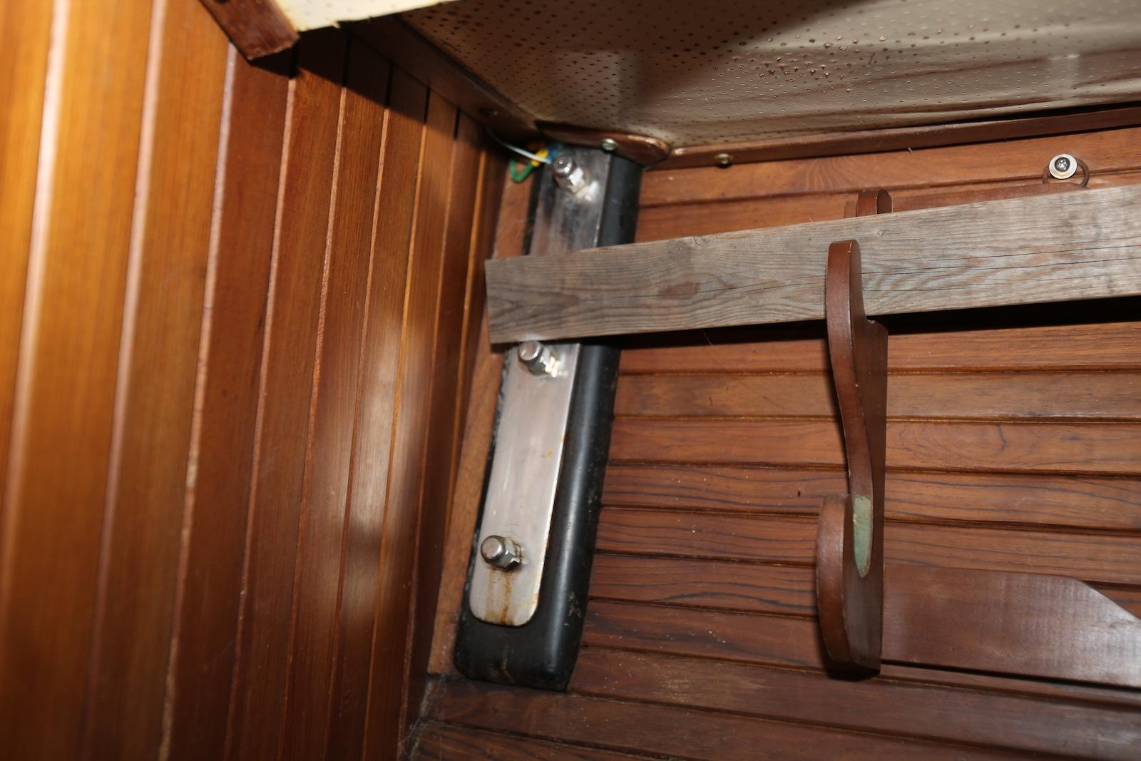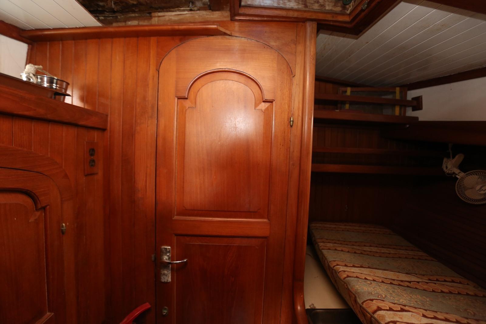 Main pilothouse cabin with helm, convertible double-berth dinette, communications and chart table/ workstation and galley with gimbal 2-burner stove and oven, SS double sink with original brass fixtures, microwave and huge refrigerated icebox, all with ample ambient lighting and ventilation via large wrap-around brass and bronze framed portlights.