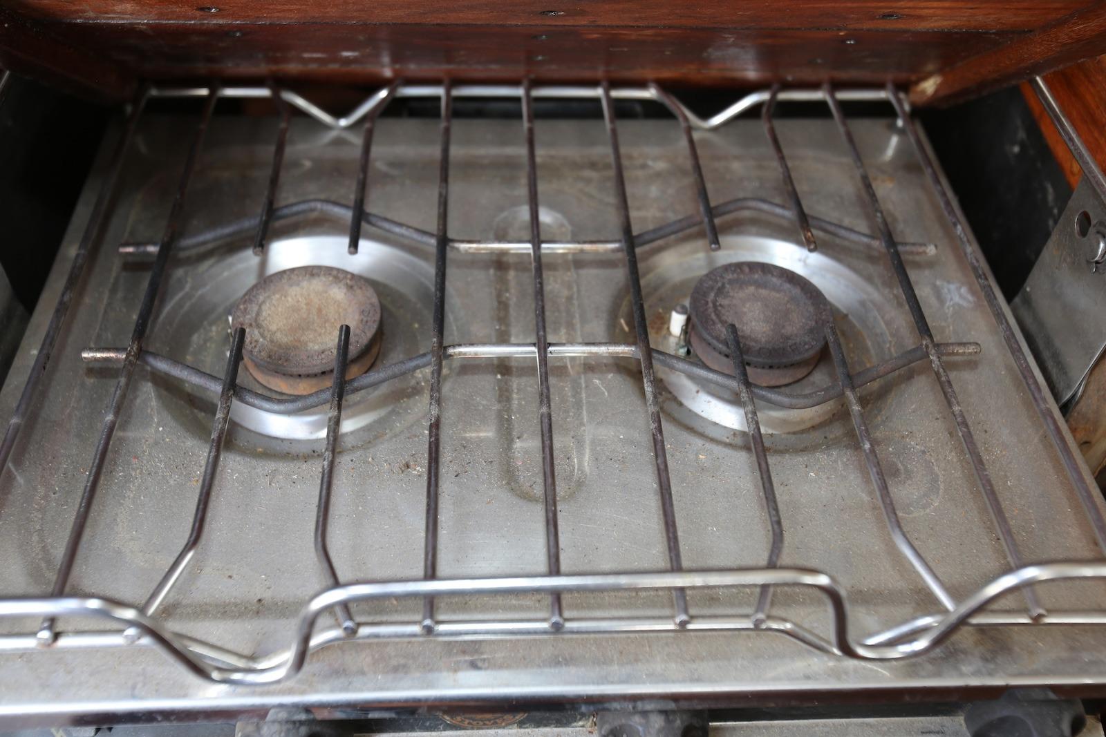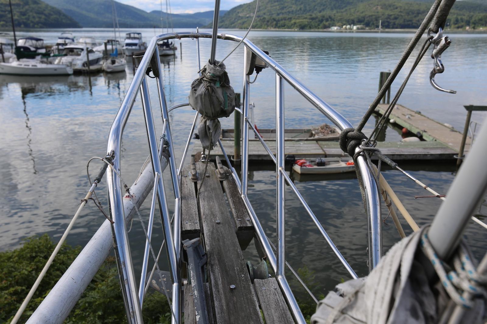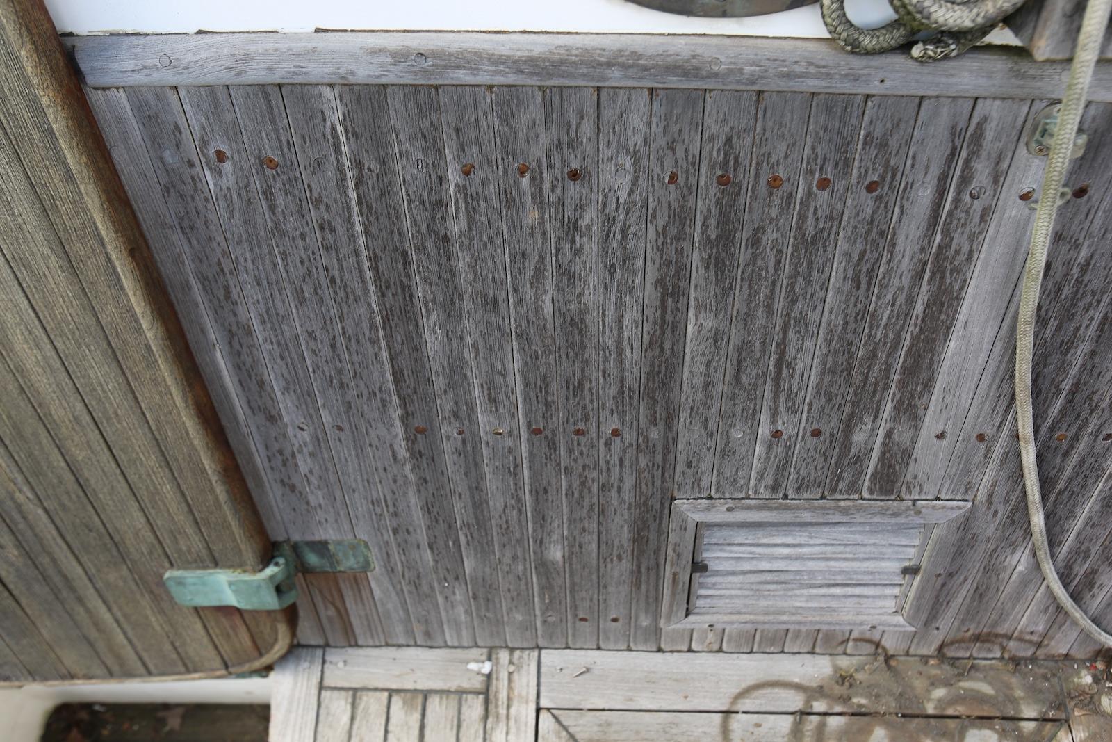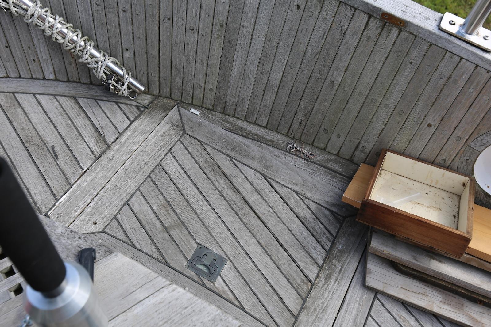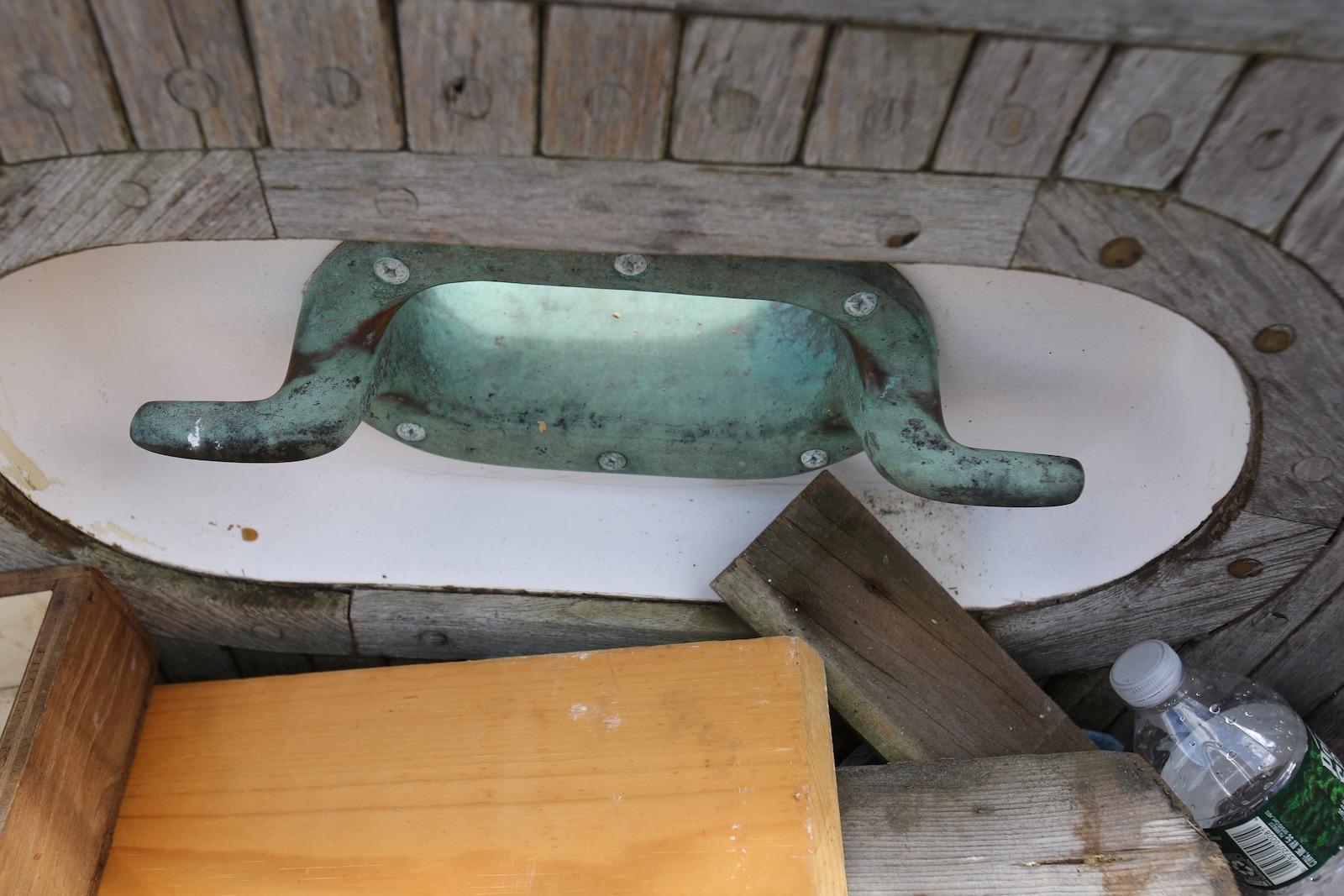 Main pilothouse cabin with helm, convertible double-berth dinette, communications and chart table/ workstation and galley with gimbal 2-burner stove and oven, SS double sink with original brass fixtures, microwave and huge refrigerated icebox, all with ample ambient lighting and ventilation via large wrap-around brass and bronze framed portlights.