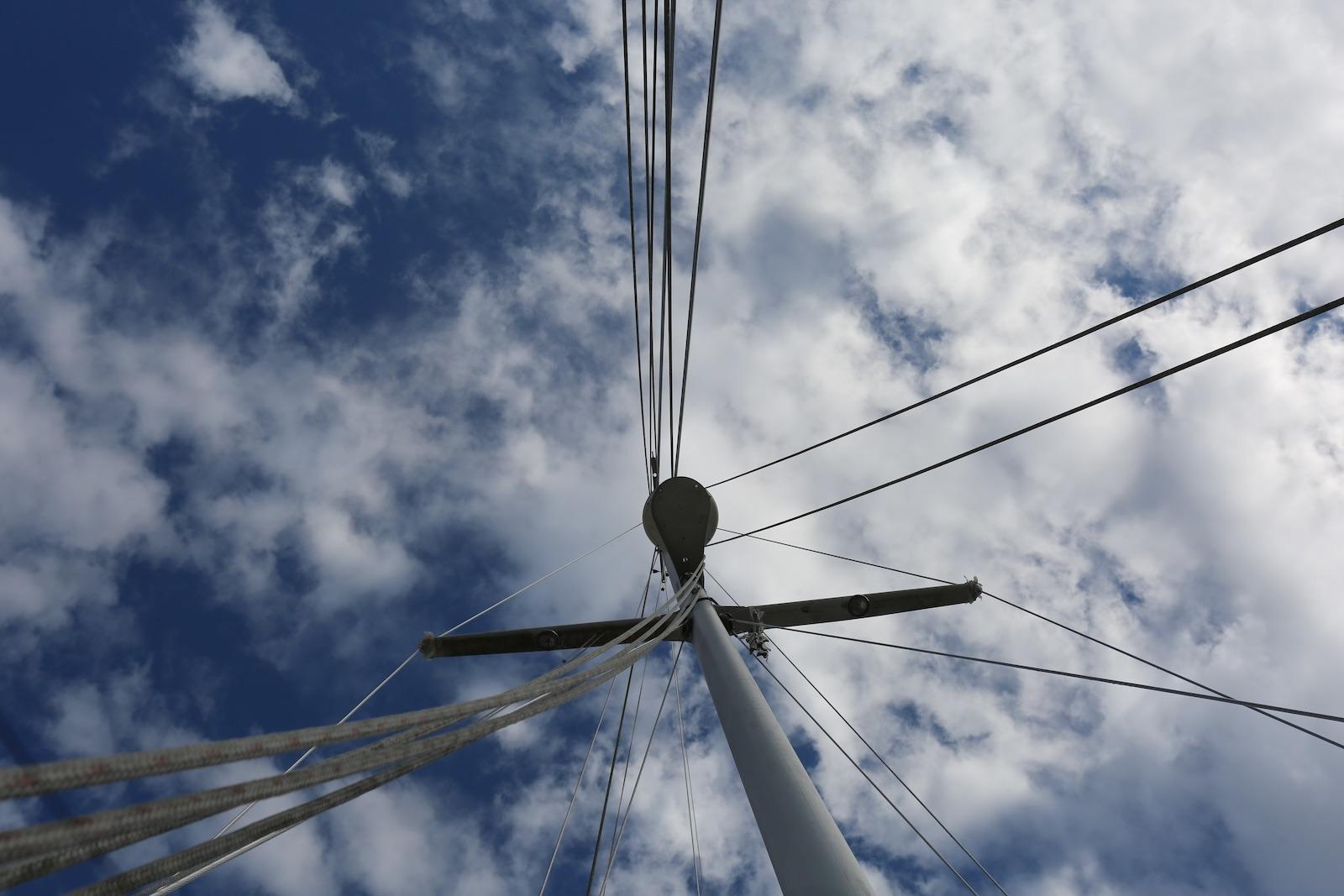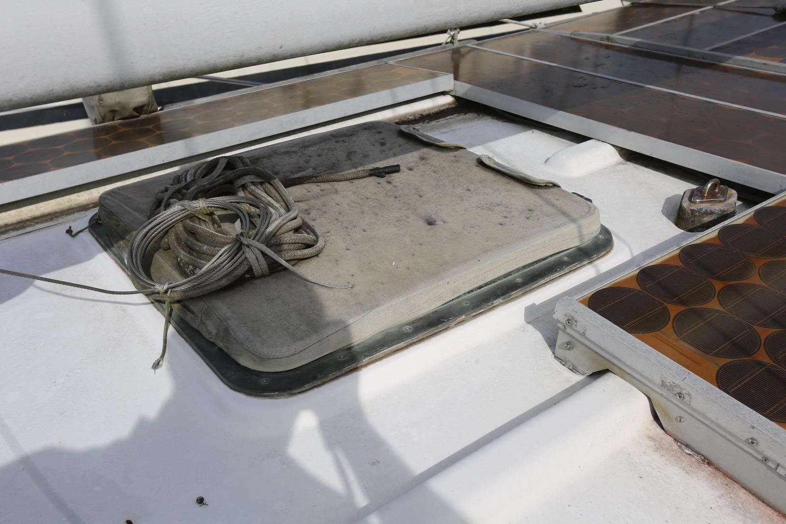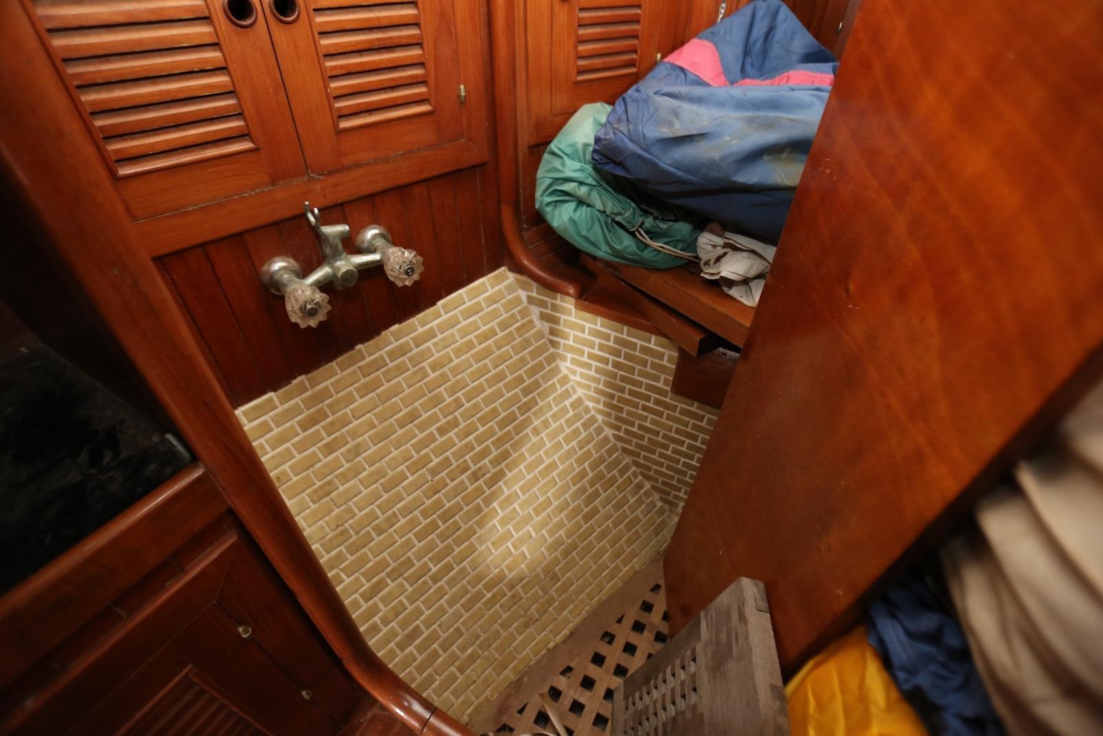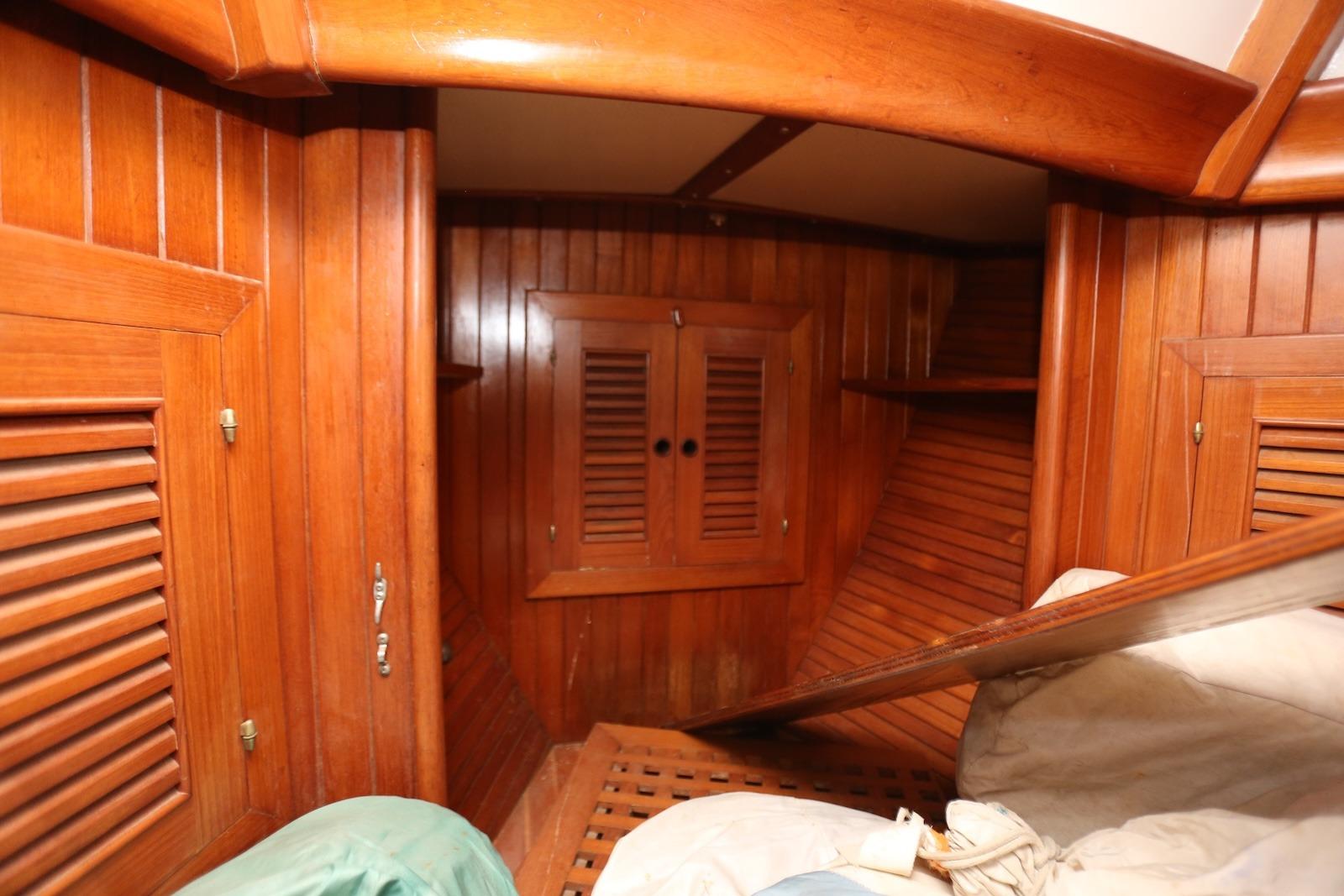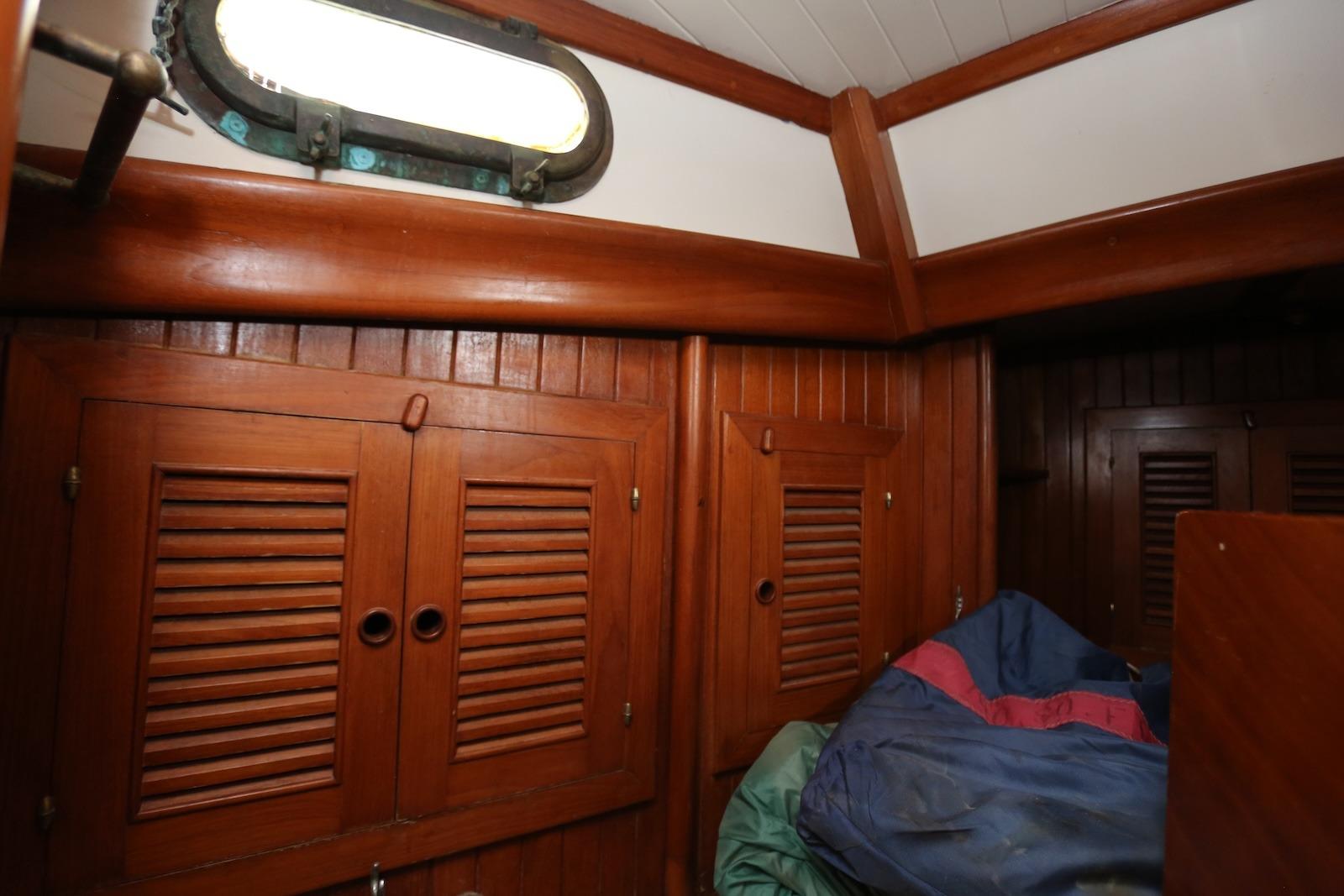 Next forward is a head with toilet and vanity sink to starboard and a quaterberth to port, followed by a double berth cabin with large closet, followed by a full-sized vanity sink to port, and finally the forward compartment which doubles as a sail locker or additional berth.