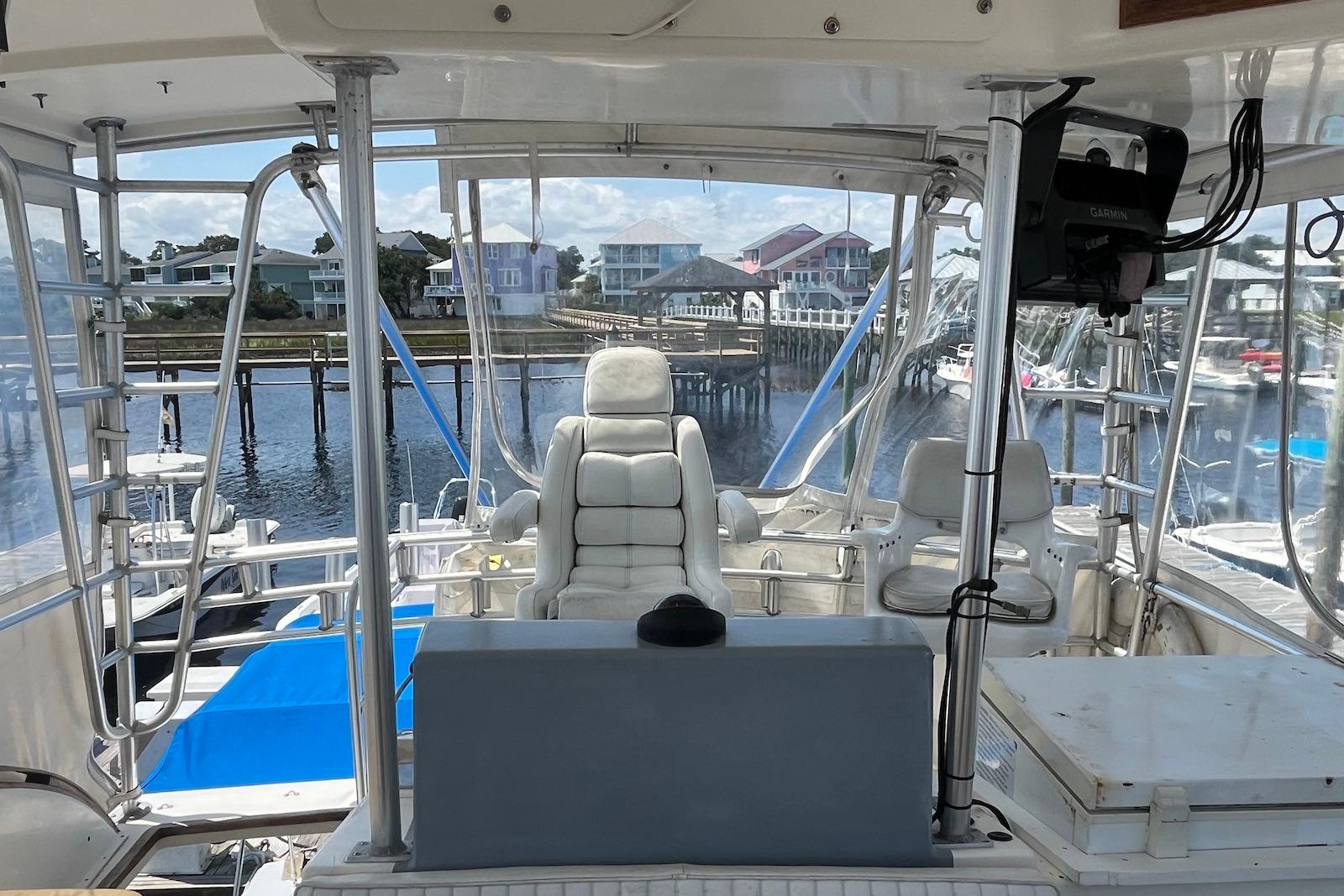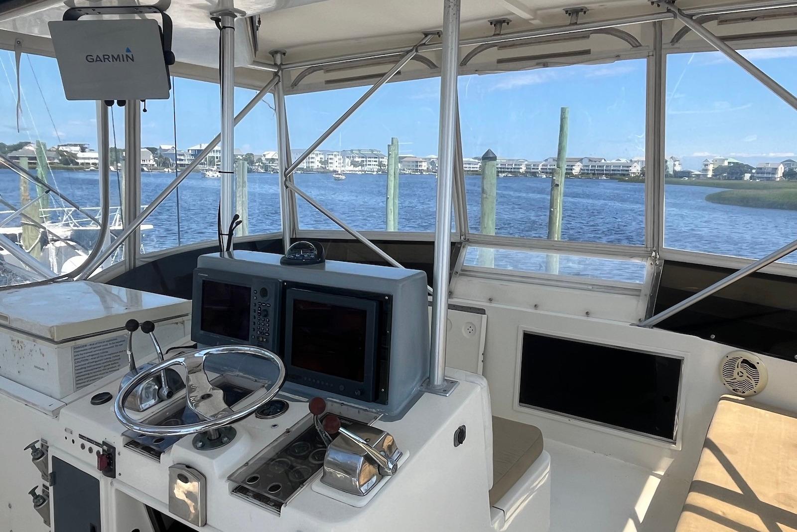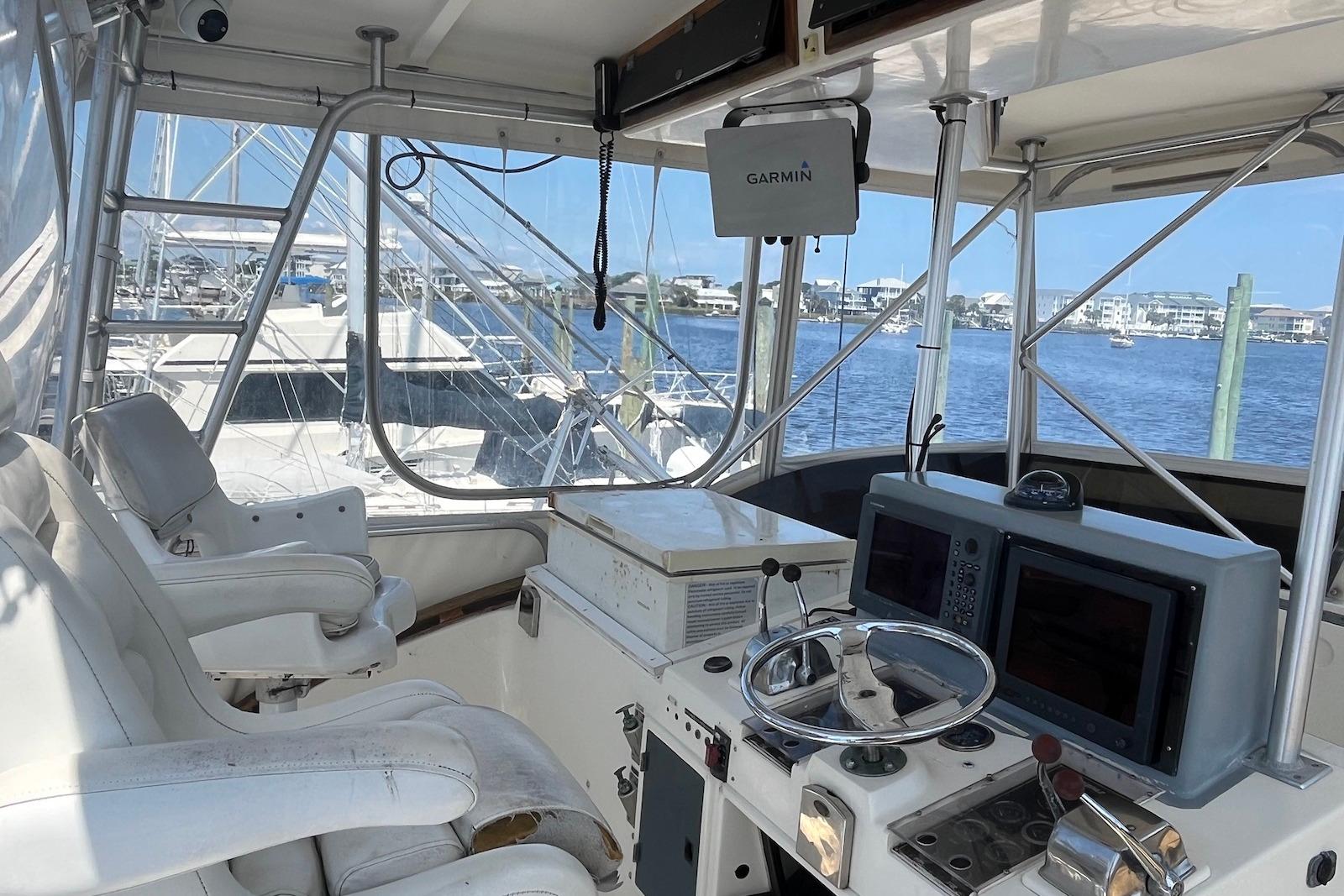 Enclosed flybridge with dual helm chairs and full electronics suite