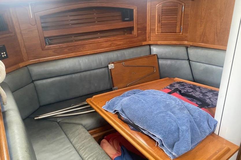 Located midships, the large salon is open and well-ventilated. To port the large u-shaped settee and dining table is to port with a full-length settee to starboard. Aft is the galley, and to starboard a full-sized forward-facing nav station.