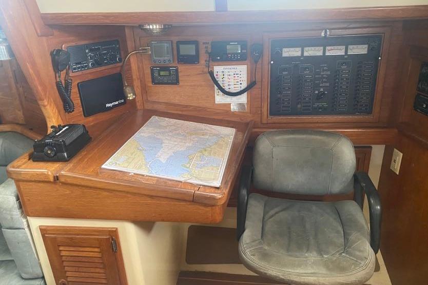 Large and forward facing with plenty of room for electronics. She also features a comfortable swivel armchair for comfortable passage planning.