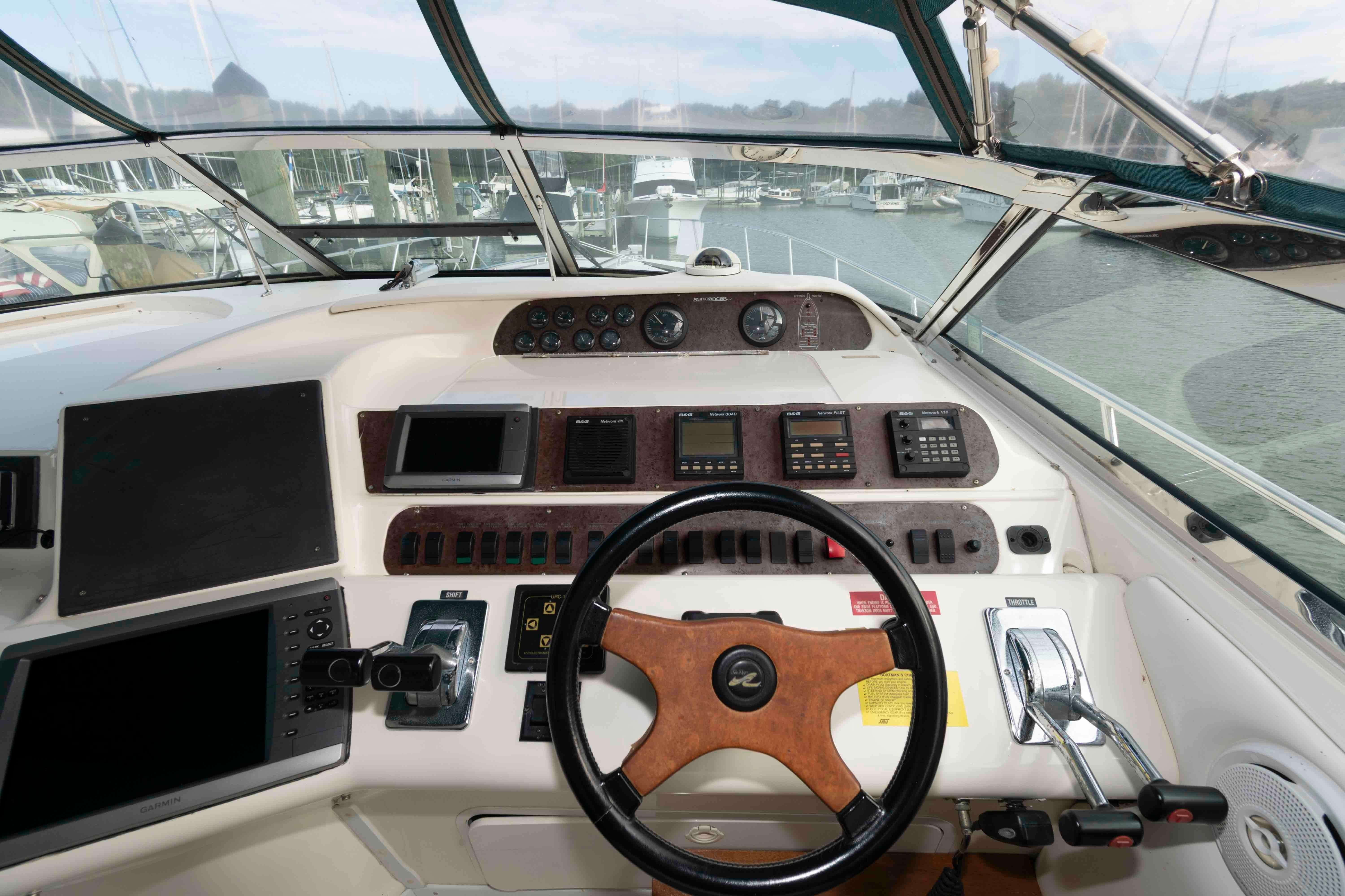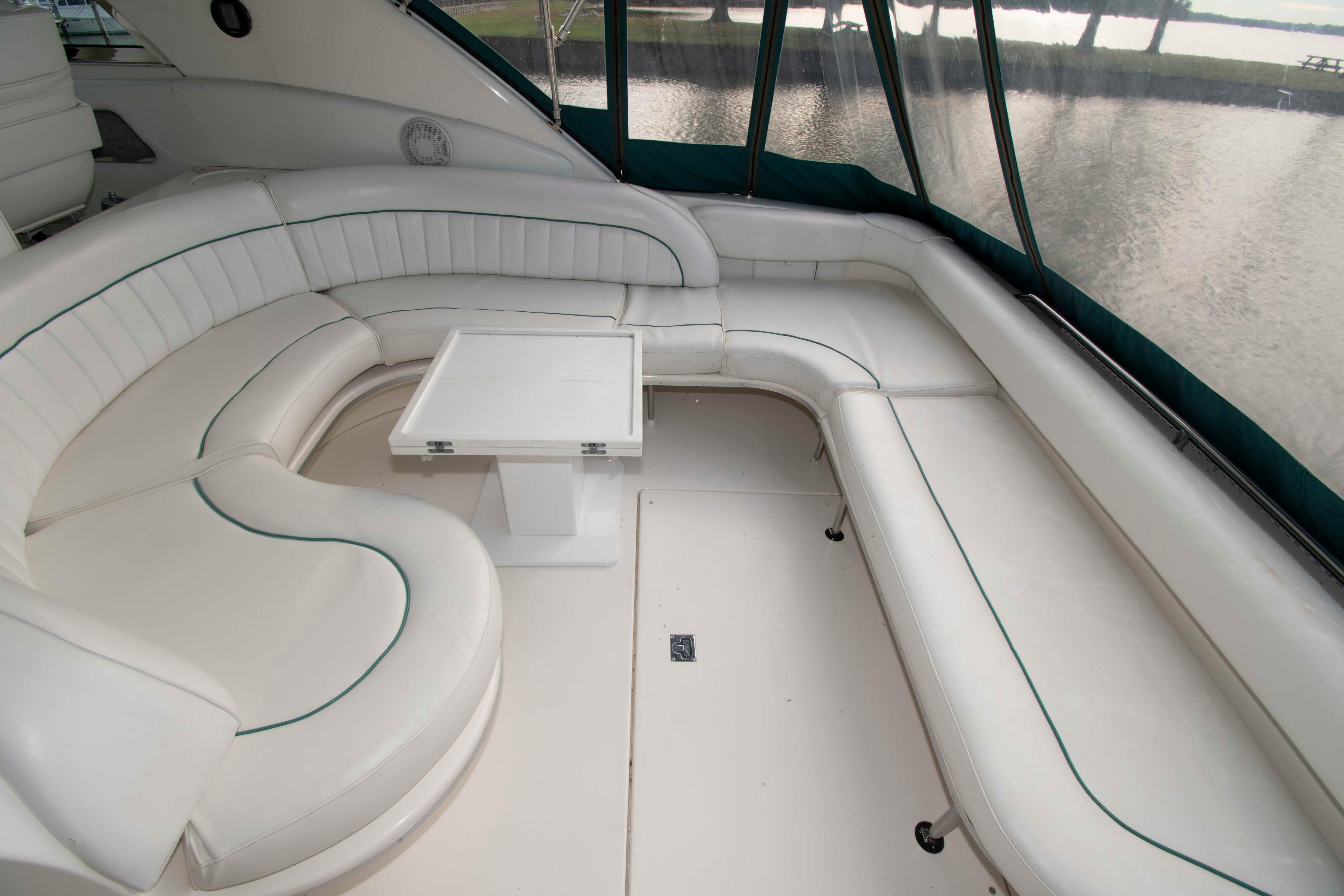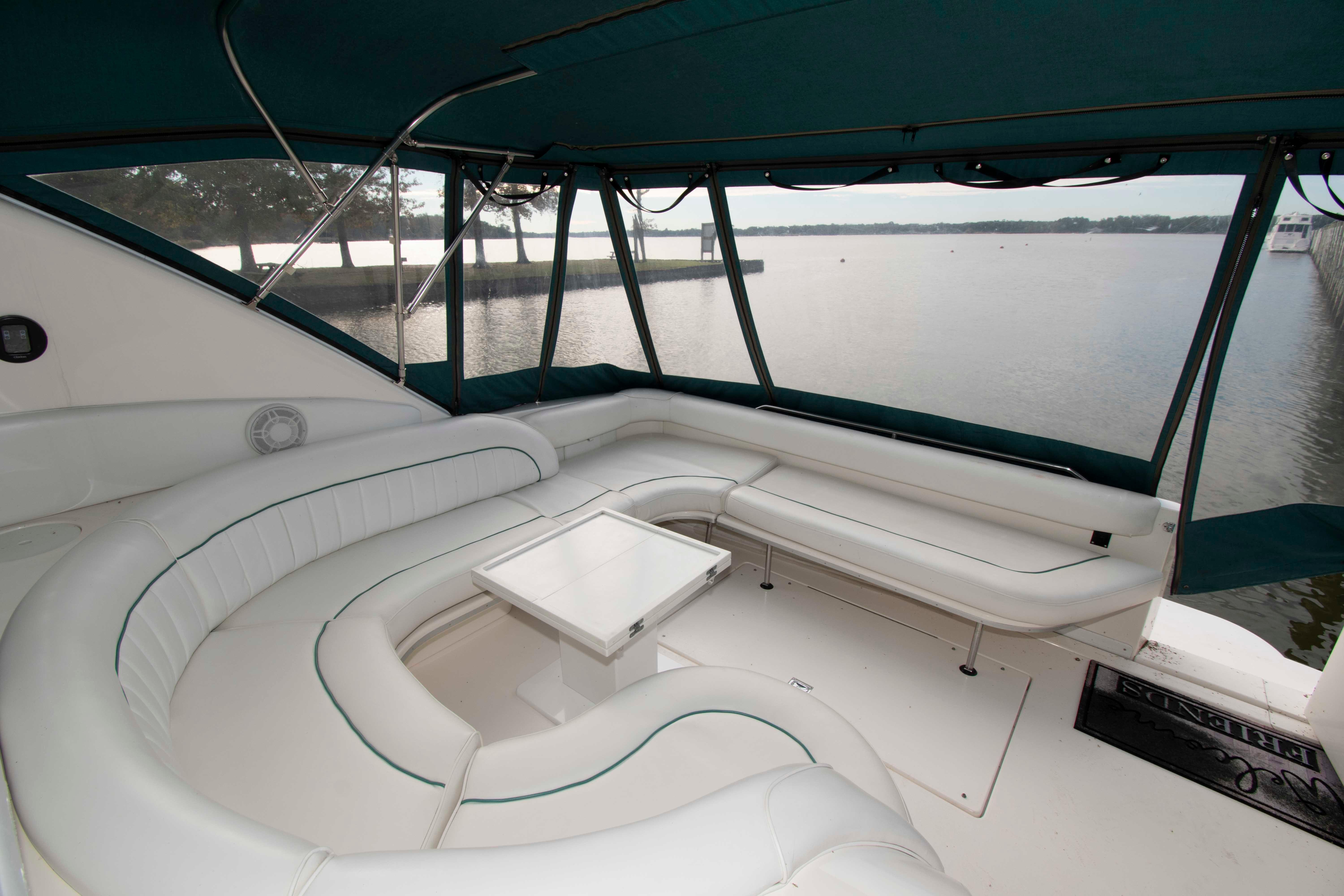 This 440 Sundancer shows really well with cockpit upholstery that shows great and the canvas and isenglass are strong. The interior also shows great with a fresh clean bright interior that does not look old or dated. This boat is well worth the effort to see.