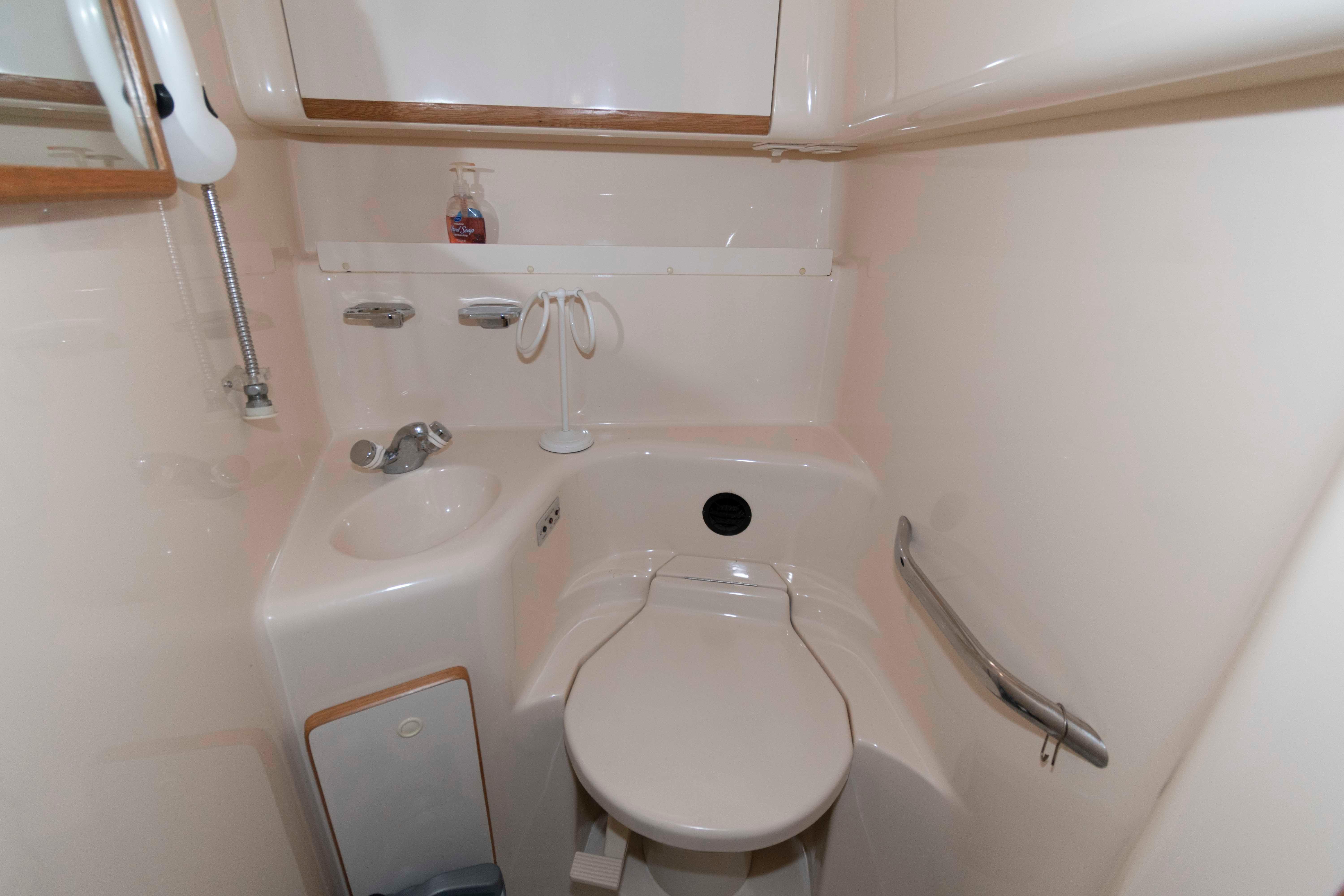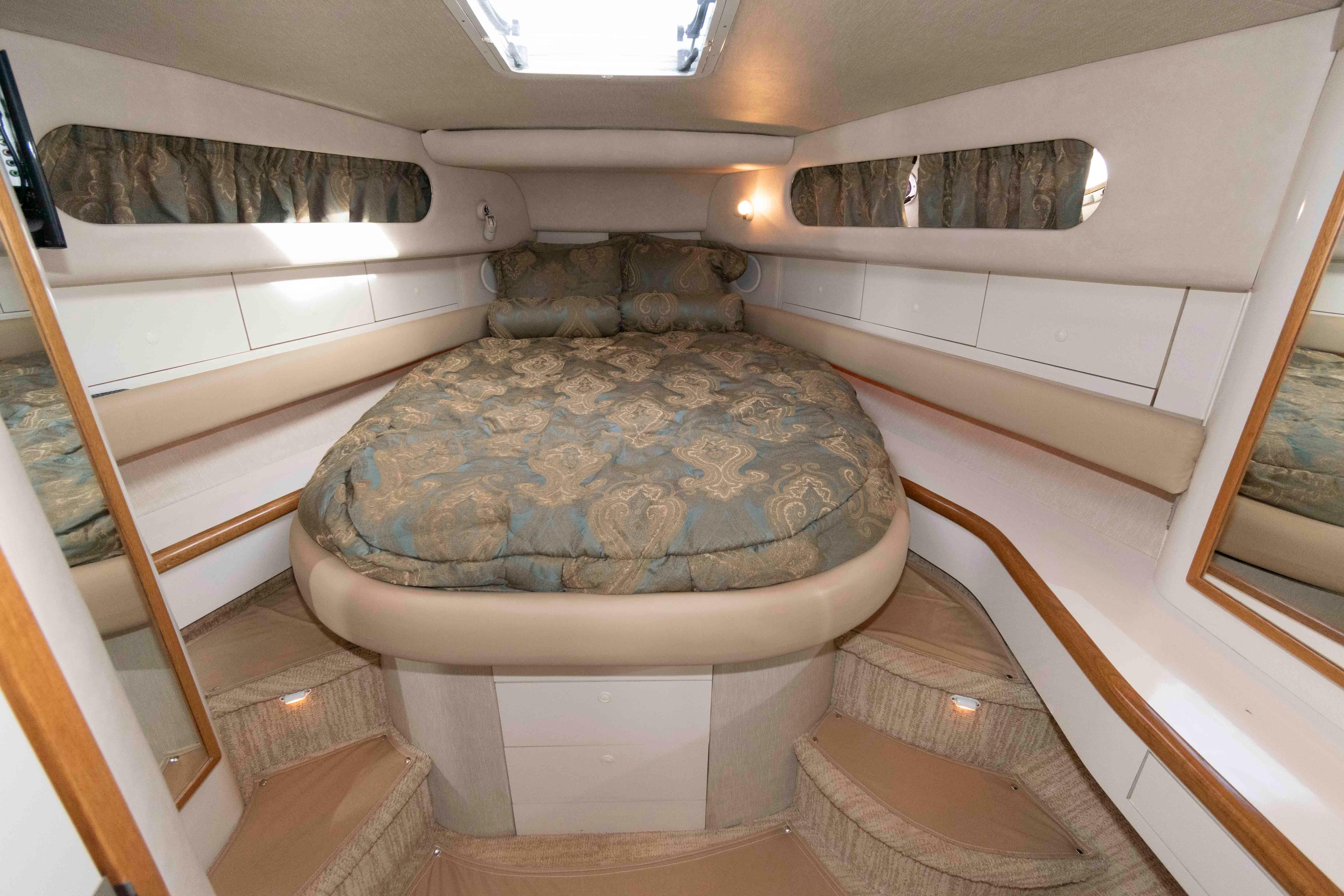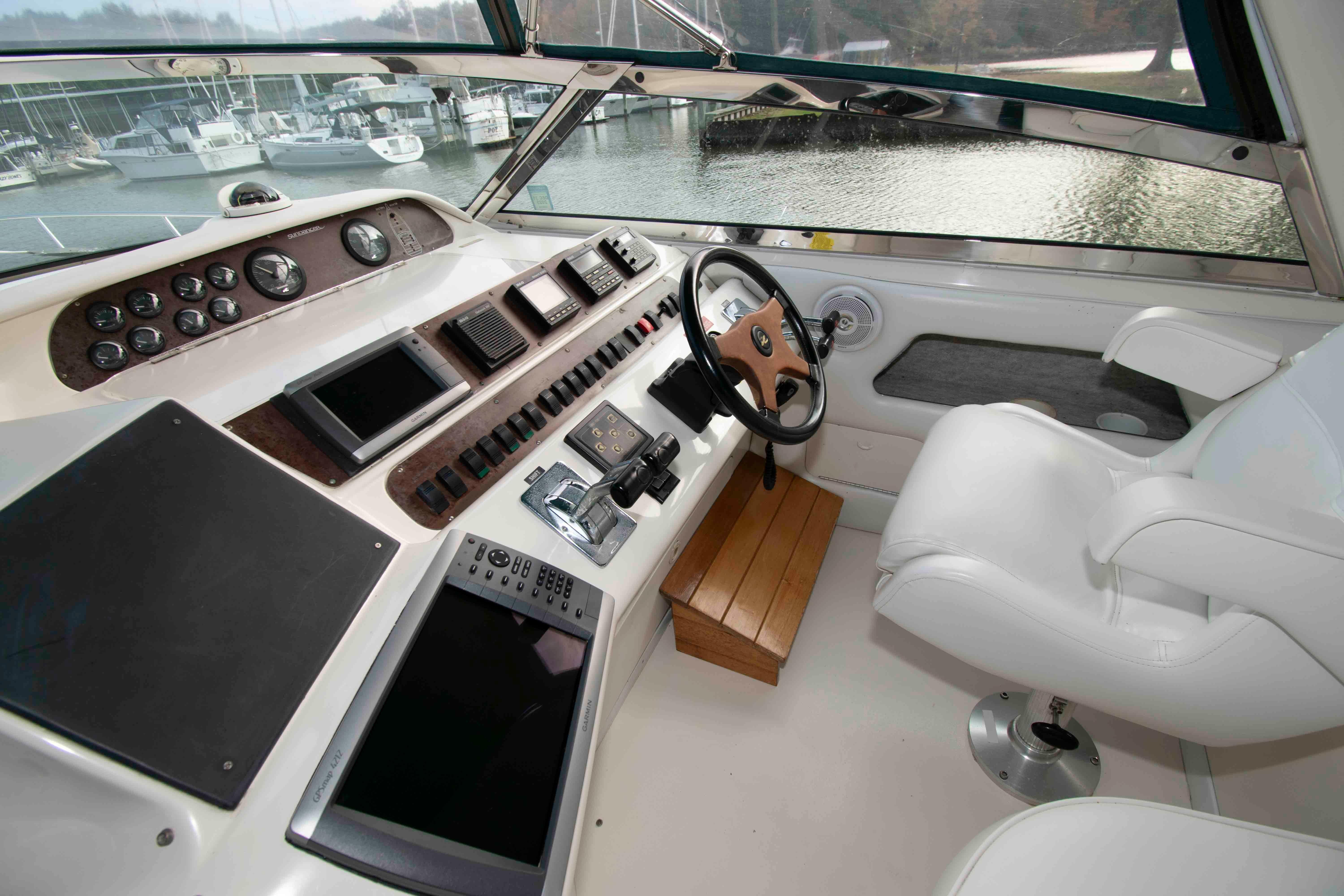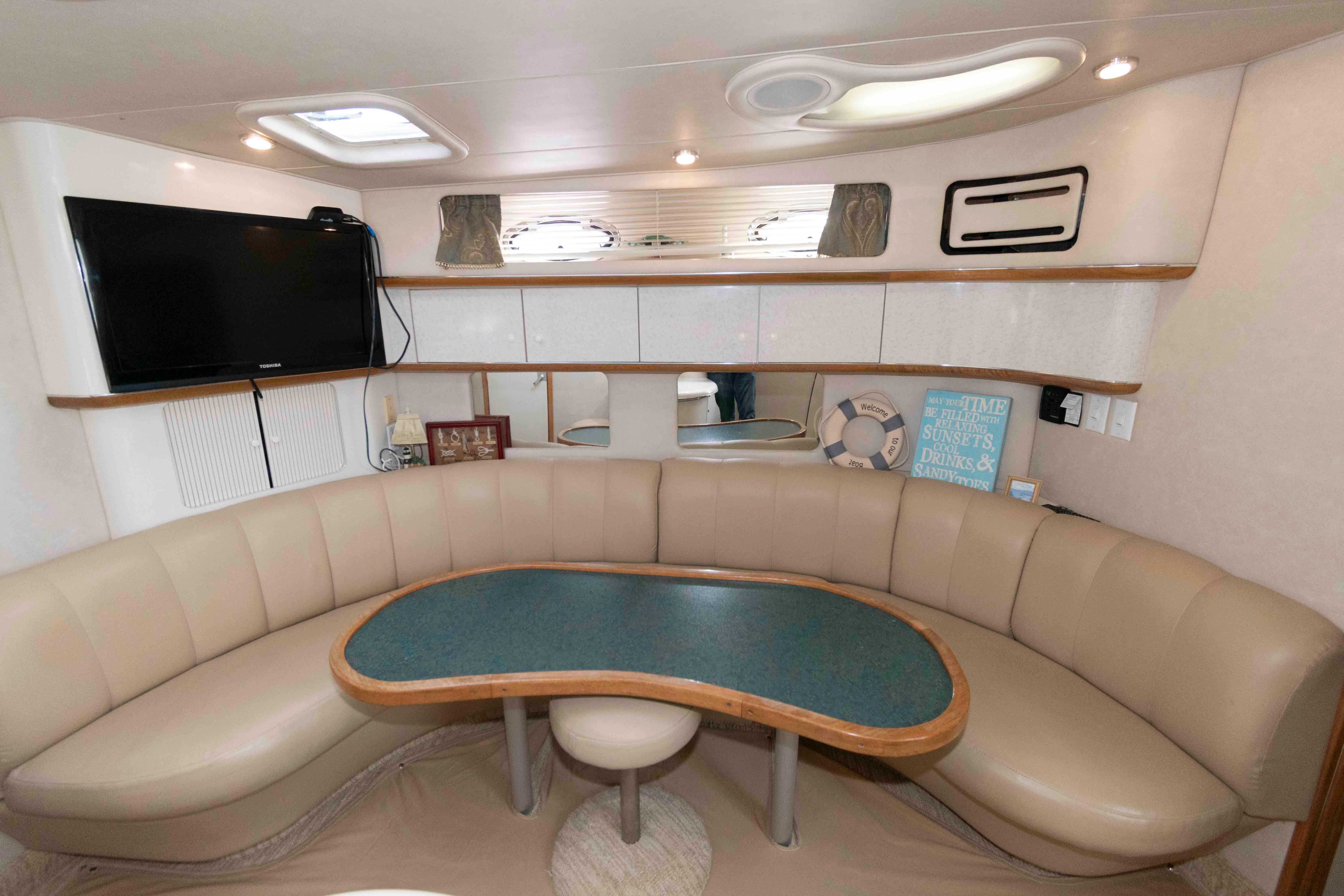 This 440 Sundancer shows really well with cockpit upholstery that shows great and the canvas and isenglass are strong. The interior also shows great with a fresh clean bright interior that does not look old or dated. This boat is well worth the effort to see.