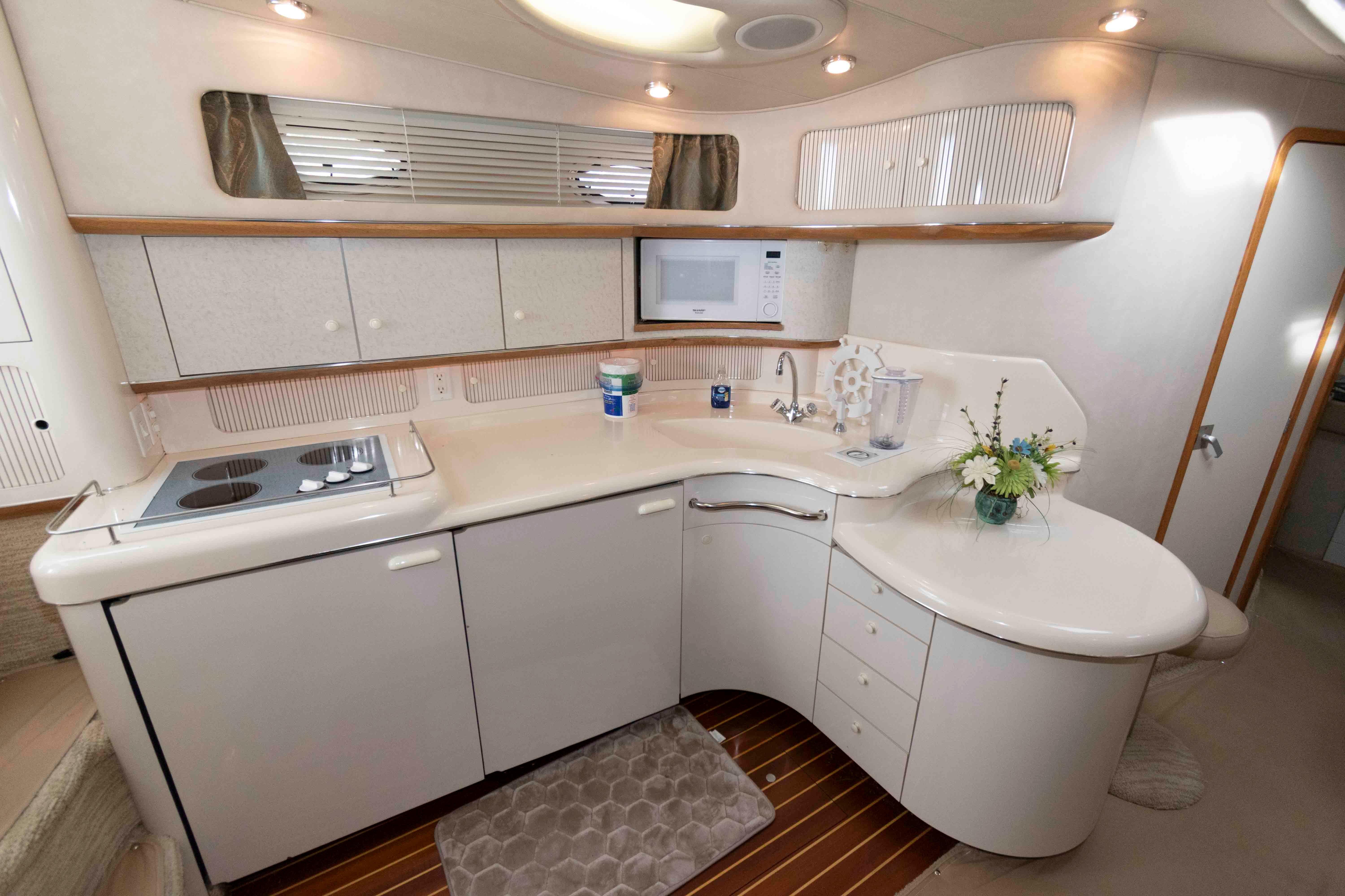 At 44 feet in length, the Sea Ray 440 Sundancer looks more like a cruise liner than a sport yacht. Then again, it has almost as much room. On deck is a spacious cockpit with ample bench seating for friends and family - perfect for relaxing in the sun. There's also a wetbar for refreshment on those hot summer days. Just a few steps below, more relief from the sun comes in the form of an inviting salon with a convertible nine-foot sofa and optional air conditioning. In the master stateroom, there's a queen-sized bed. And for the chef, the fully equipped galley has everything needed to fix a late night snack or a full course meal.