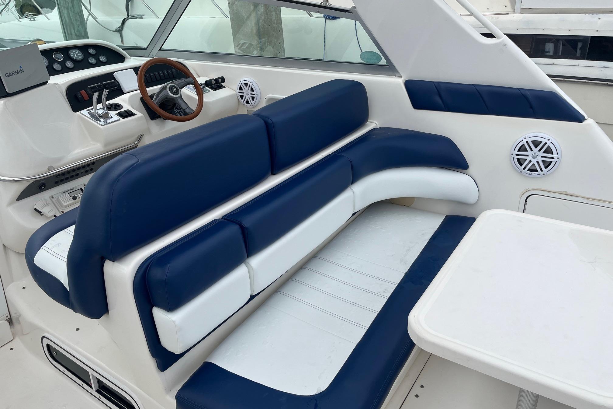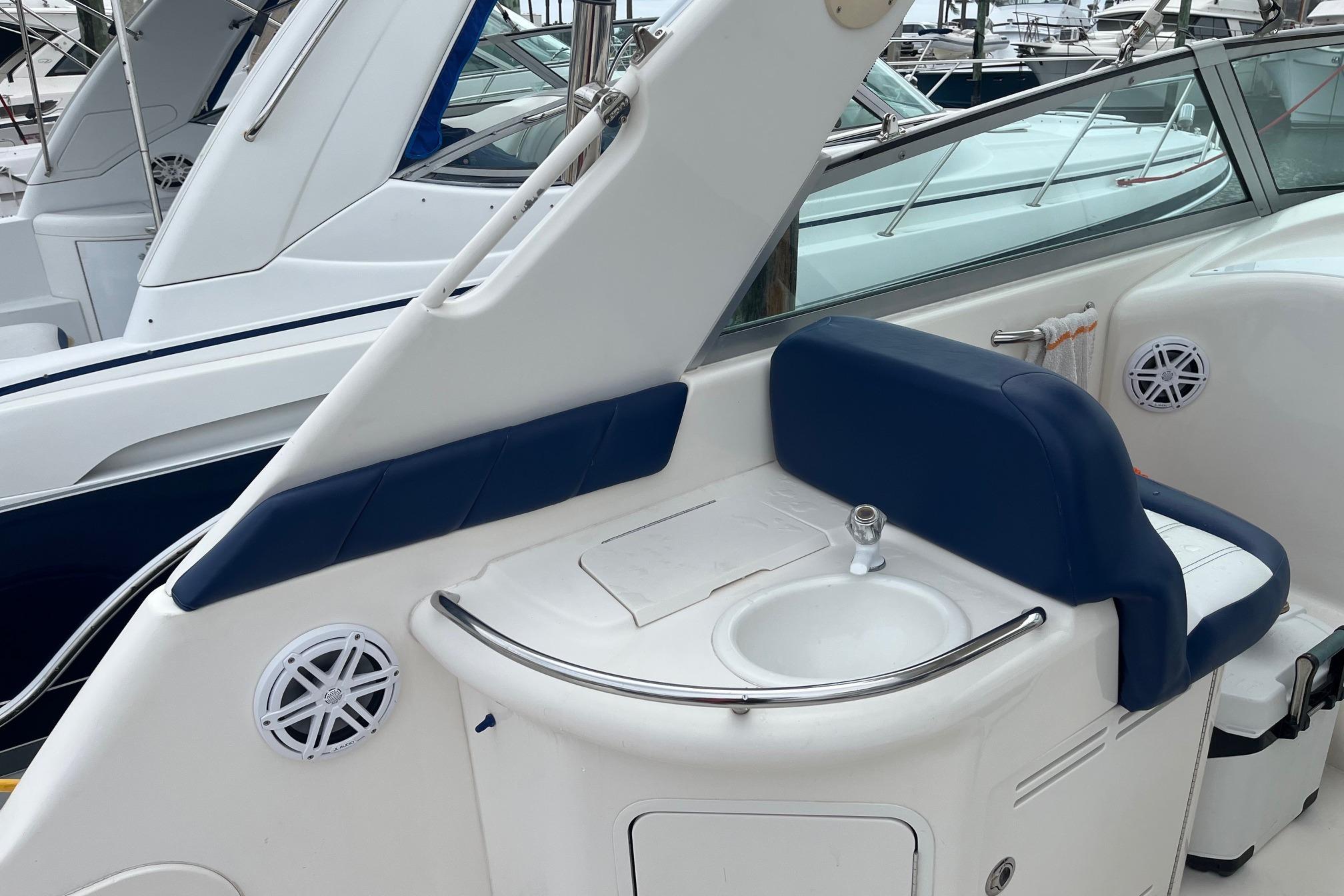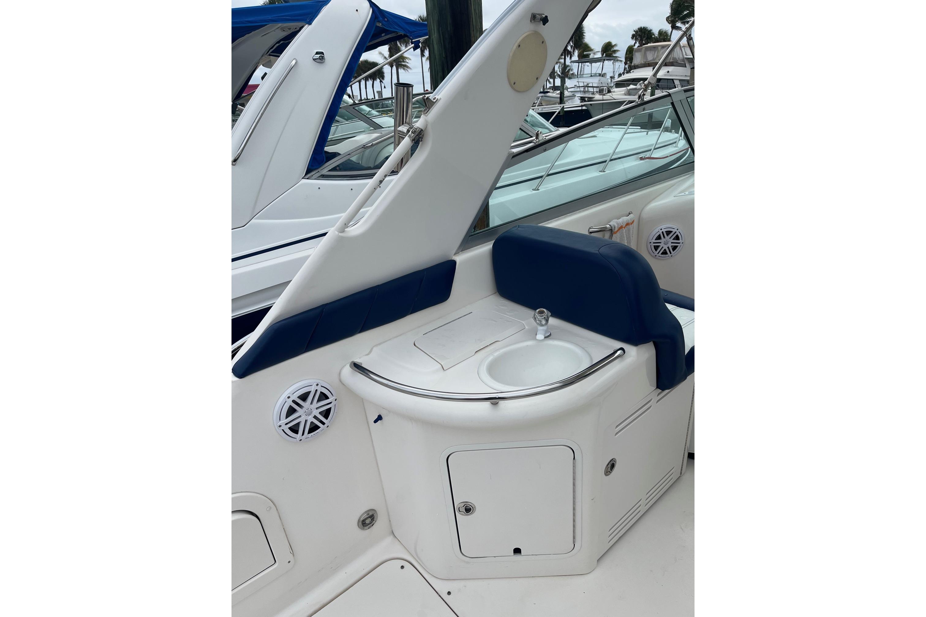 With its distinctive styling, the Sea Ray 330 Sundancer stands apart from the crowd. This 33-footer sleeps six, has a large, versatile cockpit and all the performance anyone ever needs in a family cruiser. With optional twin inboard MerCruiser V-drives in addition to standard twin 7.4L, 310horsepower MerCruiser V-drives, the 330 Sundancer can be equipped for any adventure. The double helm seat gives captain and navigator a clear view of the water through the tempered glass windshield, which is center-vented to catch sea breezes and provide access to the foredeck. All instrumentation is within easy reach, including the standard VHF radio and Lowrance depth finder. A portside wet bar stands ready to accommodate any cockpit refreshment needs. The convenient fold-down step assists passengers in boarding. Lower the cockpit table, add the filler cushion, and create a sunpad for two. The aft seat is hinged so that the electrically actuated cockpit sole rises for instant access to the engines. Standard canvas package includes Sunbrella bimini top - sun shade with interlocking top extrusion, boot and vertical top storage, front bimini curtains, side curtains, and an aft cover to protect the cockpit. Belowdecks to starboard, a plush sofa provides plenty of room to relax as well as a comfortable dining area. Lower the table, add the plump filler cushion and the sofa turns into a double berth. The mid-stateroom functions as a conversation area during waking hours, then converts to a double berth during sleeping hours. A screened sliding window admits plenty of fresh air and light. The forward stateroom features a double berth, two large mirrored hanging lockers, a TV-VCR combination, and a privacy curtain that encloses the entire area. The head is located just inside the cabin door, providing easy access for passengers in the cockpit, as well as the cabin. The compartment includes a VacuFlush toilet, vanity with sink, and shower with curtain. In the galley, appointments include a large sink, refrigerator, flush-mounted two-burner electric stove, and microwave.