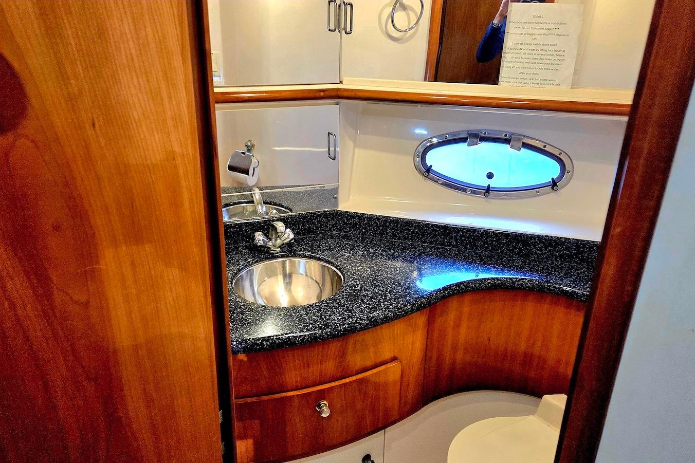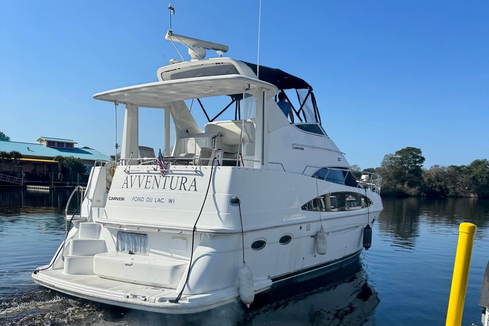 The 2000 Carver 396 Aft Cabin Motor Yacht is a mid-size luxury cruiser designed for comfort, entertaining and extended stays on the water. She is the ideal cruiser for the Great Loop, cruising the Keys and Bahamas or as a weekend condo or live aboard. Built in the late 1990's - early 2000's, she is known for her large interior volume, flybridge helm and two stateroom, two head layout. Her helm is equipped with a variety of electronics including Garmin GPS, depth, and sonar, Simrad autopilot, Standard Verizon VHF and upgraded stereo system. There is plenty of seating on the flybridge as well as a fridge and sink.Below there are two large sofas, one with pullout berth, an entertainment system featuring TV and Sony stereo system adjacent to the cabin stairs. Her galley is furnished with an upgraded refrigerator/freezer, new 4 burner cooktop, convection oven and deep stainless sink with large countertop. Her forward and aft head are Vacu-flush with separate showers. She is powered by twin Cummins diesels and has a 9kw Kohler generator. Her bottom job is about 18 months old.