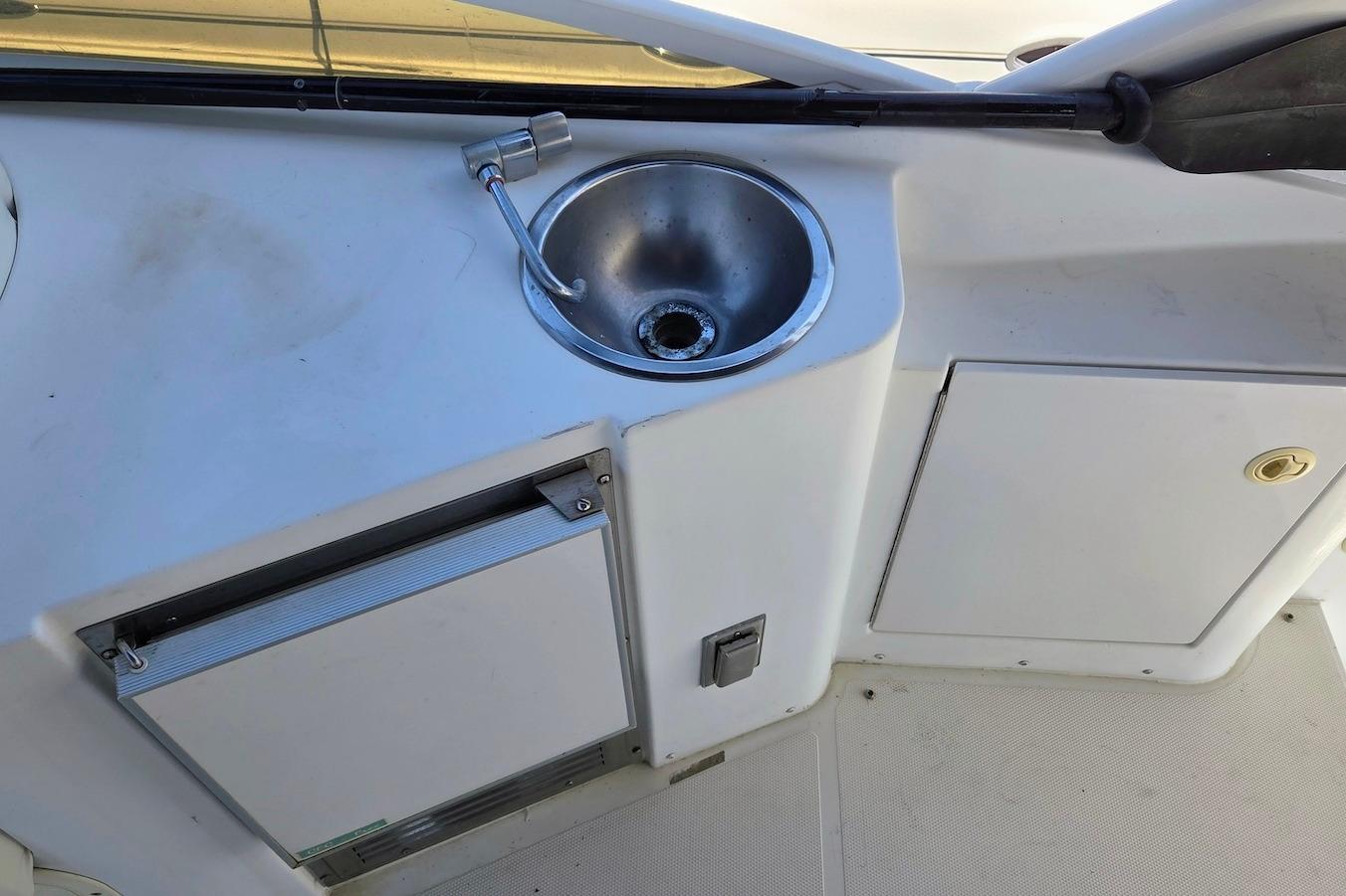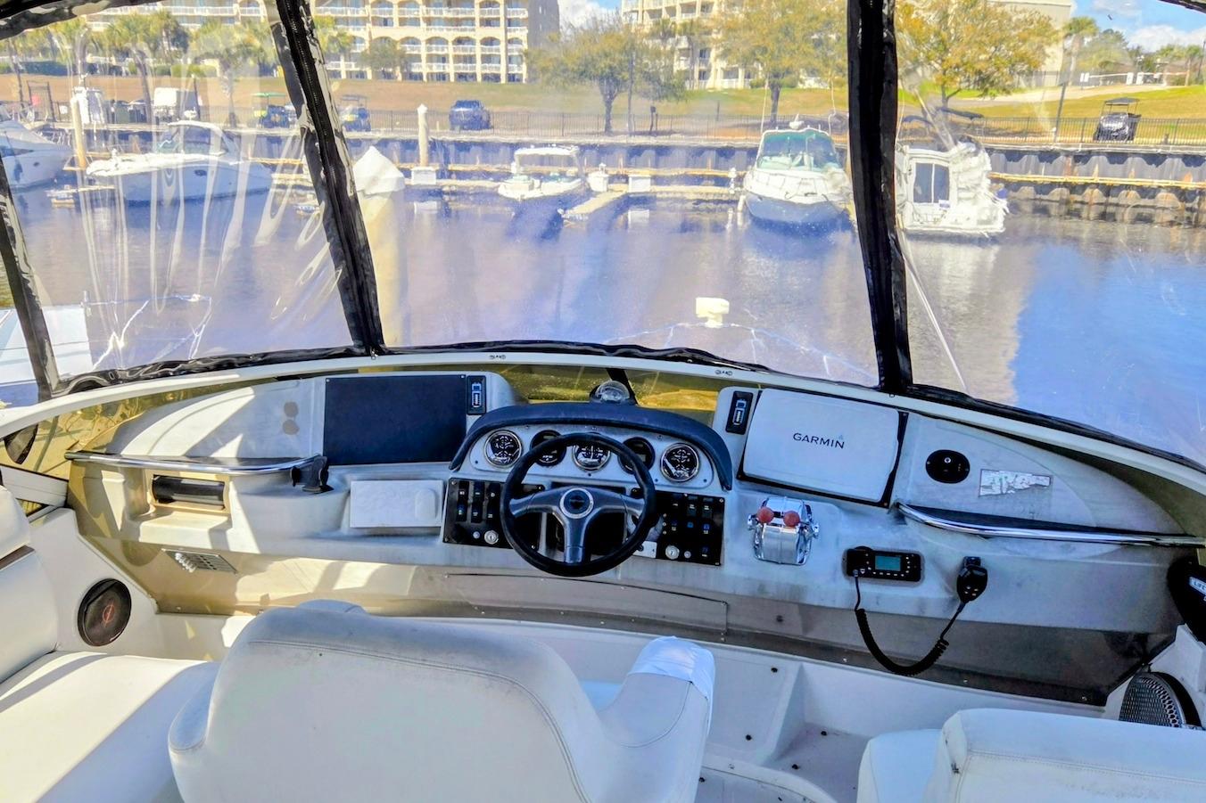 * Large flybridge with L shaped bench seat and 2 captain chairs, fridge and sink* Captains chair needs reupholstery* Canvas top is in good condition* New heavy duty stata glass windshield * Additional strata glass, zippers and webbing is onboard to make side windows* Bar with refrigerator and sink* Helm with instruments and navigation electronics ( see ELECTRONICS )* Hardtop Aft Deck with molded stairs to flybridge and down stairs to main salon* Storage lockers* Side doors on either side for access to side deck access to bow* Outdoor table and chairs for relaxation and/or dining