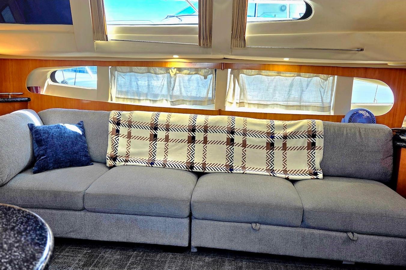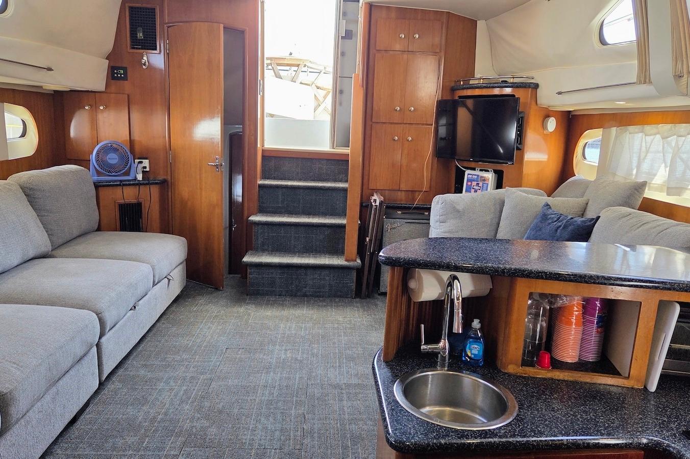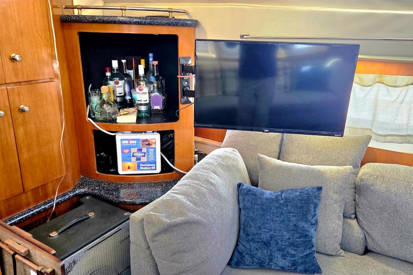 * New carpet* Engine and Generator access* Newly upholstered large sofa with pull out for additional berth* Newly upholstered loveseat opposite sofa* TV on swivel with bar or large shelf behind adjacent to companion stairs* New SONY stereo system with speakers throughout* AC controls* New LED lights throughout