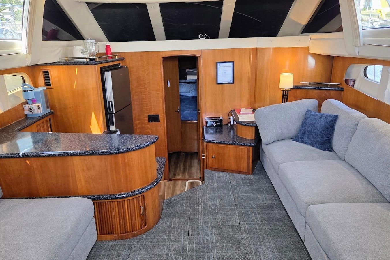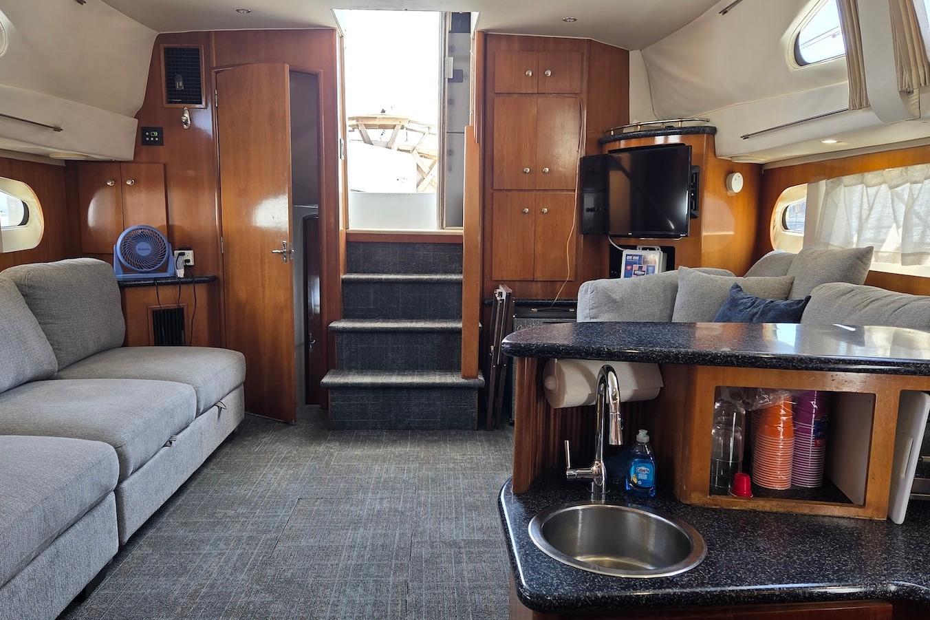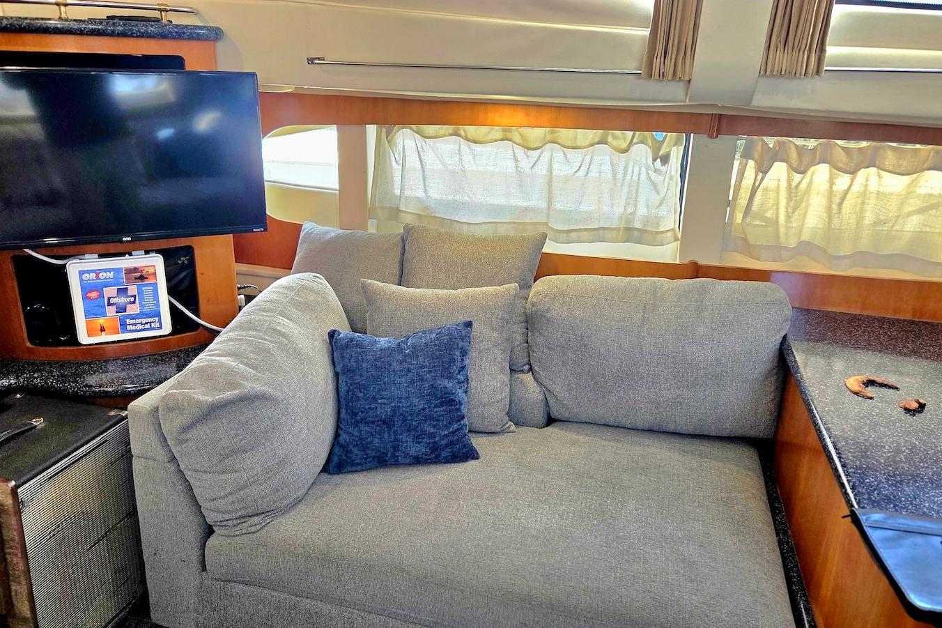 * New carpet* Engine and Generator access* Newly upholstered large sofa with pull out for additional berth* Newly upholstered loveseat opposite sofa* TV on swivel with bar or large shelf behind adjacent to companion stairs* New SONY stereo system with speakers throughout* AC controls* New LED lights throughout