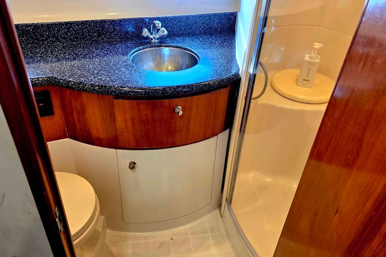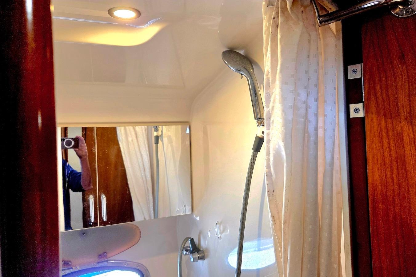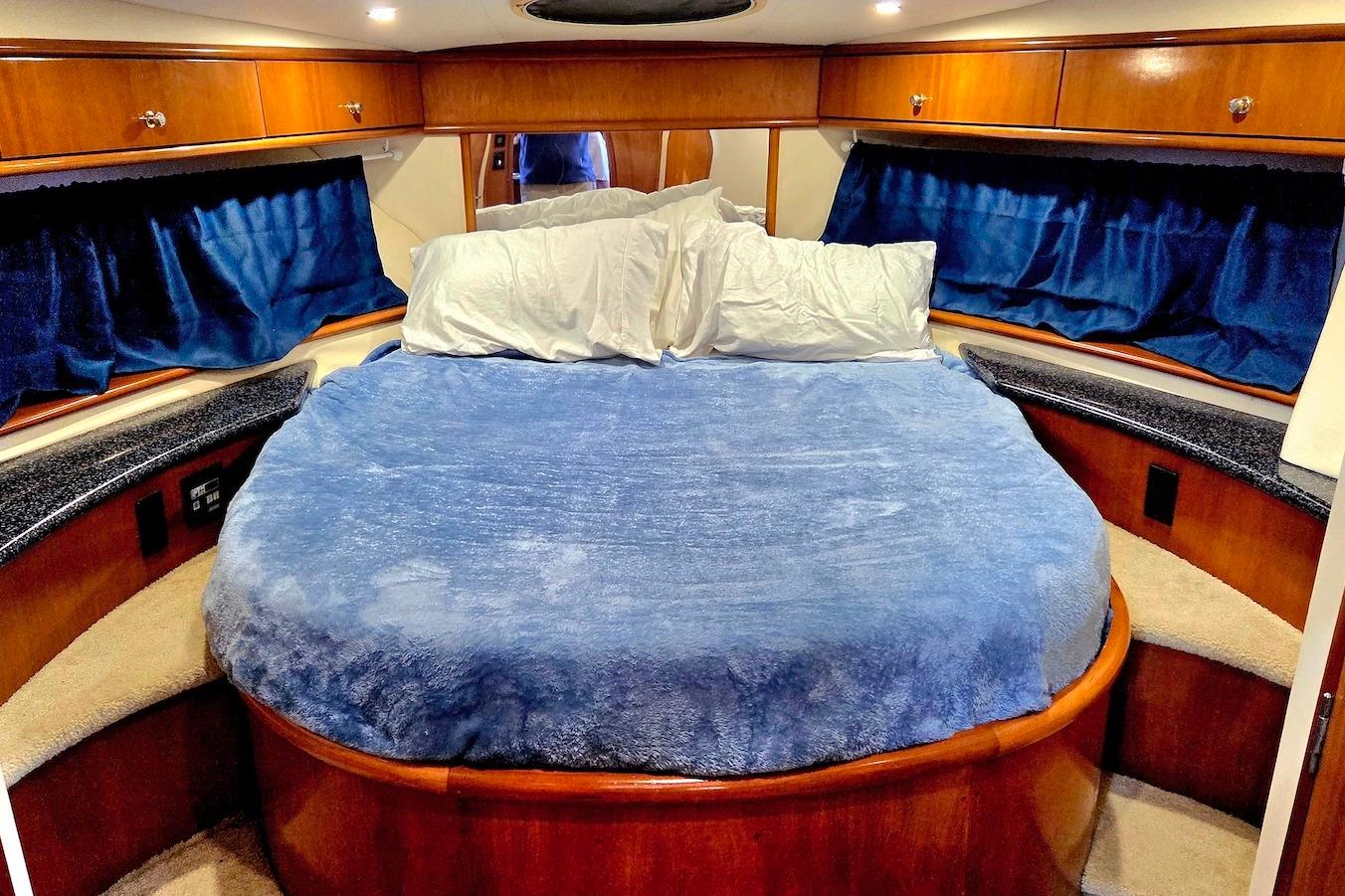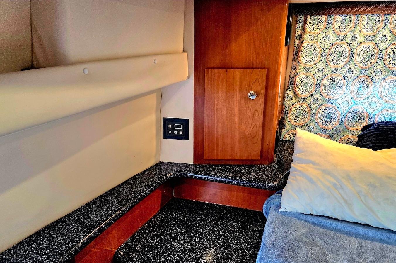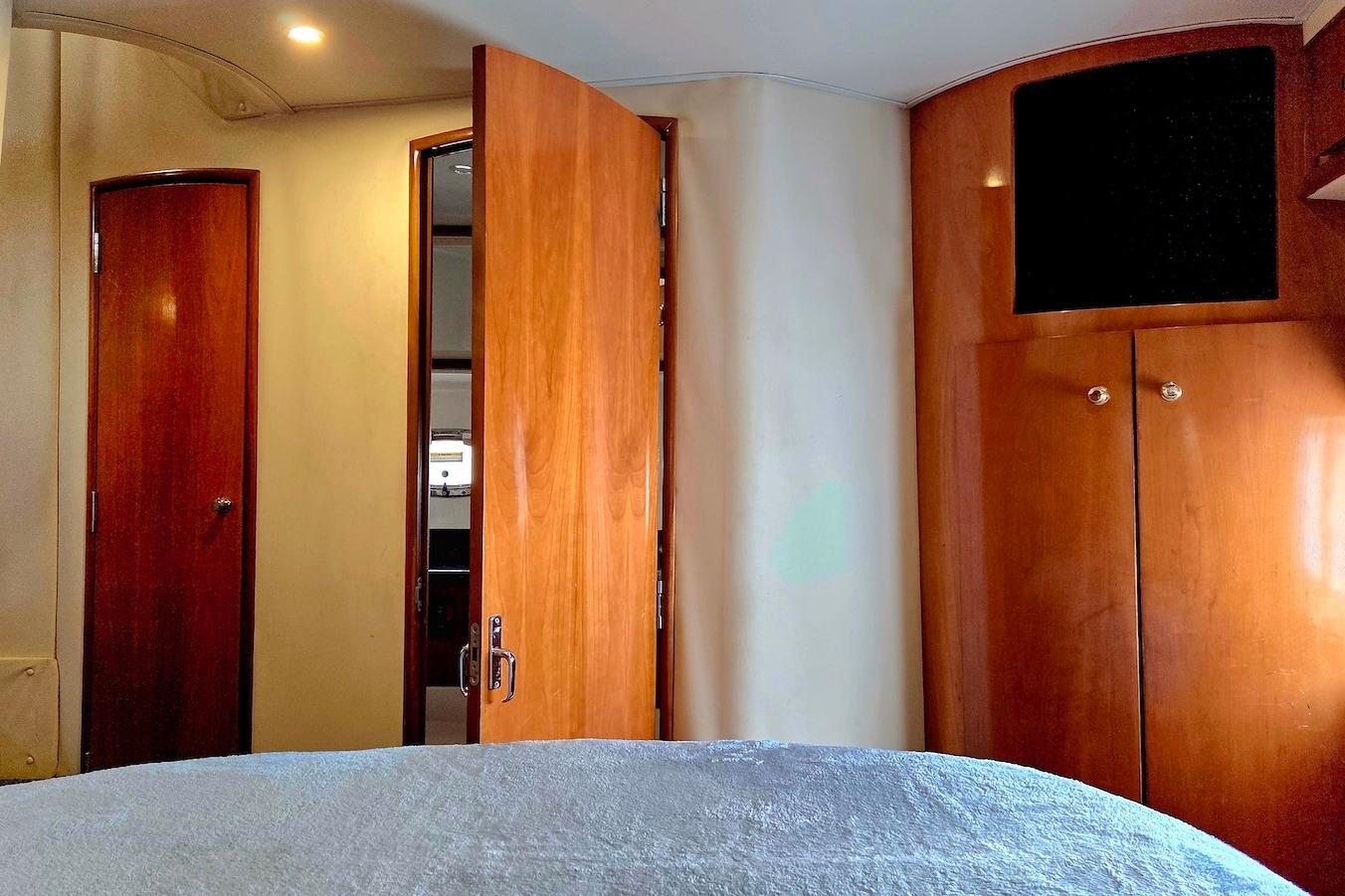 * Queen island bed* drawers, storage on either side* Overhead hatch* TV* AC control* New vinyl headliner and new curtains* Cedar hanging locker* LED lighting* Private Vacu-flush head to starboard and separate shower to port
