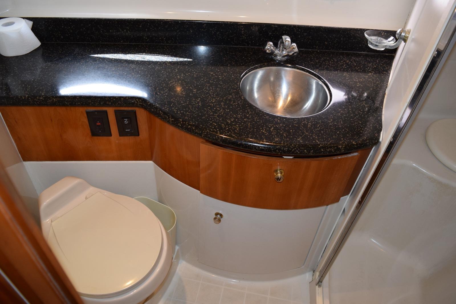 Master Head110V outlet - GFCI protected. Entrance door - secures closed, integral doorstop, stainless steel hardware. Hardware highlights - brass/chrome. Head fan. Lights (2) - halogen, overhead, recessed. Medicine cabinet - mirrored, 2 shelves. Portlights (2) - screened, privacy glass. Rocker light switches. Soap dish - wall-mounted, solid glass. Toilet - electric flush, pedestal. Toilet paper holder - mounted in vanity cabinet. Towel ring. Vanity - solid surface top and backsplash, undermounted stainless steel sink, drawer below, cabinet below with door. SHOWER STALL - Entrance door - secures closed, acrylic in aluminum frame. Integral bench seat. Light - halogen, overhead, recessed. Shower head - adjustable height, detachable for use as handshower. Towel bar - 14".