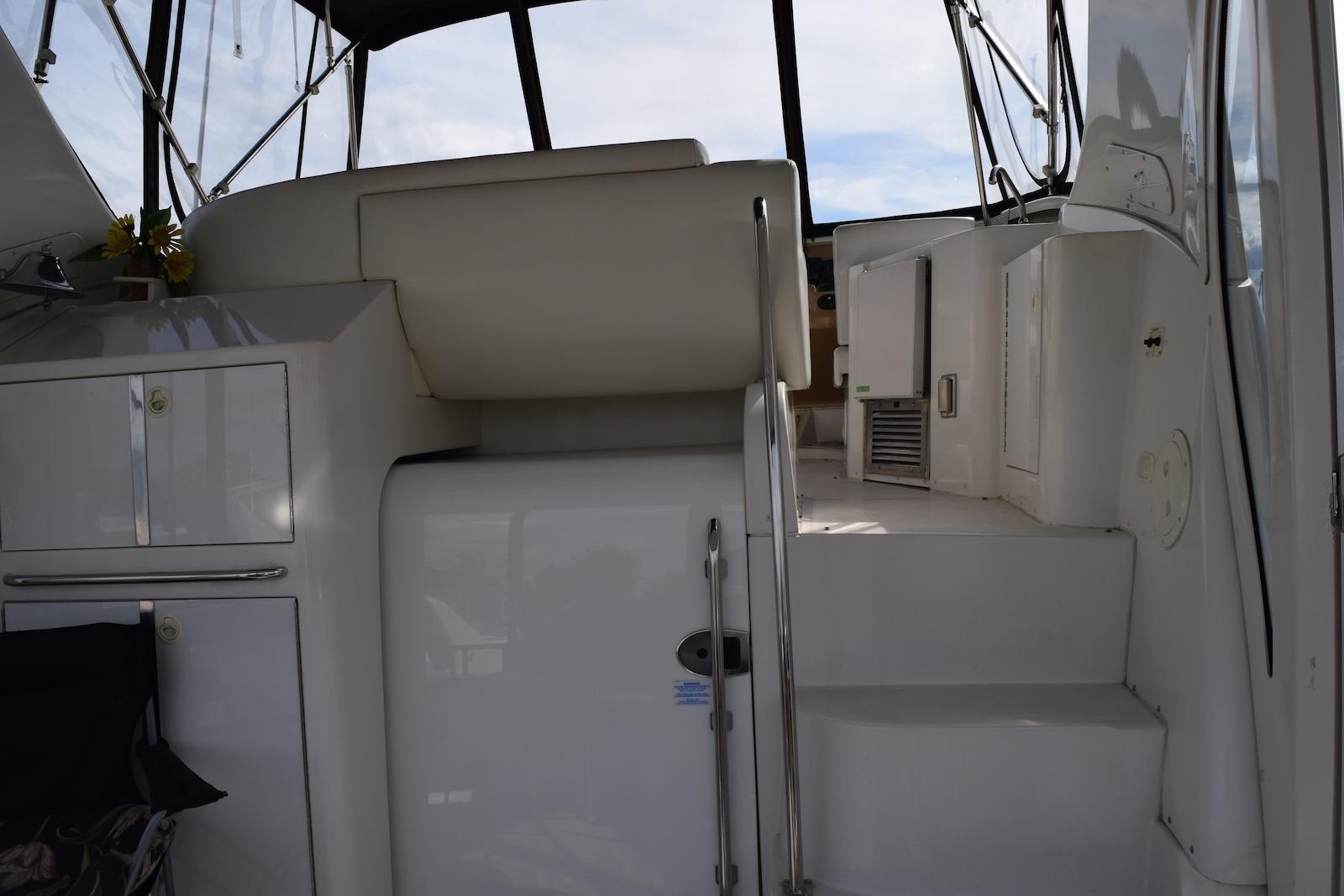 Additional DescriptionAFT DECK - 73 ft2 (approx.), integral to deck, self-draining. Command bridge stairway - integral to deck with stainless steel hand rail. Electronics arch - custom aluminum with acrylic polyurethane surface coating and UV protection. Electronics arch access plates (5) - corrosion-resistant polymer attached with noncorroding screws and waterproof sealant. Grab rail - 25" stainless steel, across lockers. Hand rail - 1.0" OD, stainless steel, around entire aft deck. Hardtop over entire aft deck. Lights (4) - courtesy, recessed, with exterior-mounted switch. Lights (2) - overhead, recessed, with exterior-mounted switch. Lockers (2) - upper and lower, double doors, interior stainless steel restraining rail. Stereo speakers (2). Transom door - aluminum, stainless steel hardware, with 22" grab rail across top. Wing doors (2) - secure open and closed, acrylic in aluminum frame, stainless steel hardware, provide access to the side decks. SIDE DECKS - Bow rail - 1.0" O.D., lineal-buffed, welded stainless steel, with additional intermediate rail amidships and forward. Bow rail stanchions - double-welded (inside and outside), stainless steel, anchored to aluminum backing plates laminated into deck. Cleats (4) - 10" spring, stainless steel, through-bolted through aluminum backing plate. Deck toe rail. Grab rail - stainless steel, over cabin windows, running length of cabin and above windshields. Rub rail molding - heavy-duty, stainless steel insert. FORE DECK - Cleats (2) - 10" stainless steel, through-bolted through aluminum backing plate. Cleat - 10" stainless steel for anchor line, through-bolted through aluminum backing plate. Locker - in-deck, self-draining, for fender storage and anchor chain. Over-the-stem anchor roller.