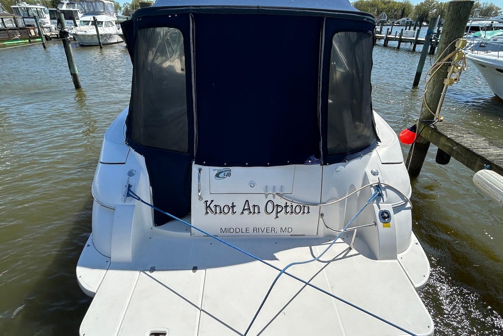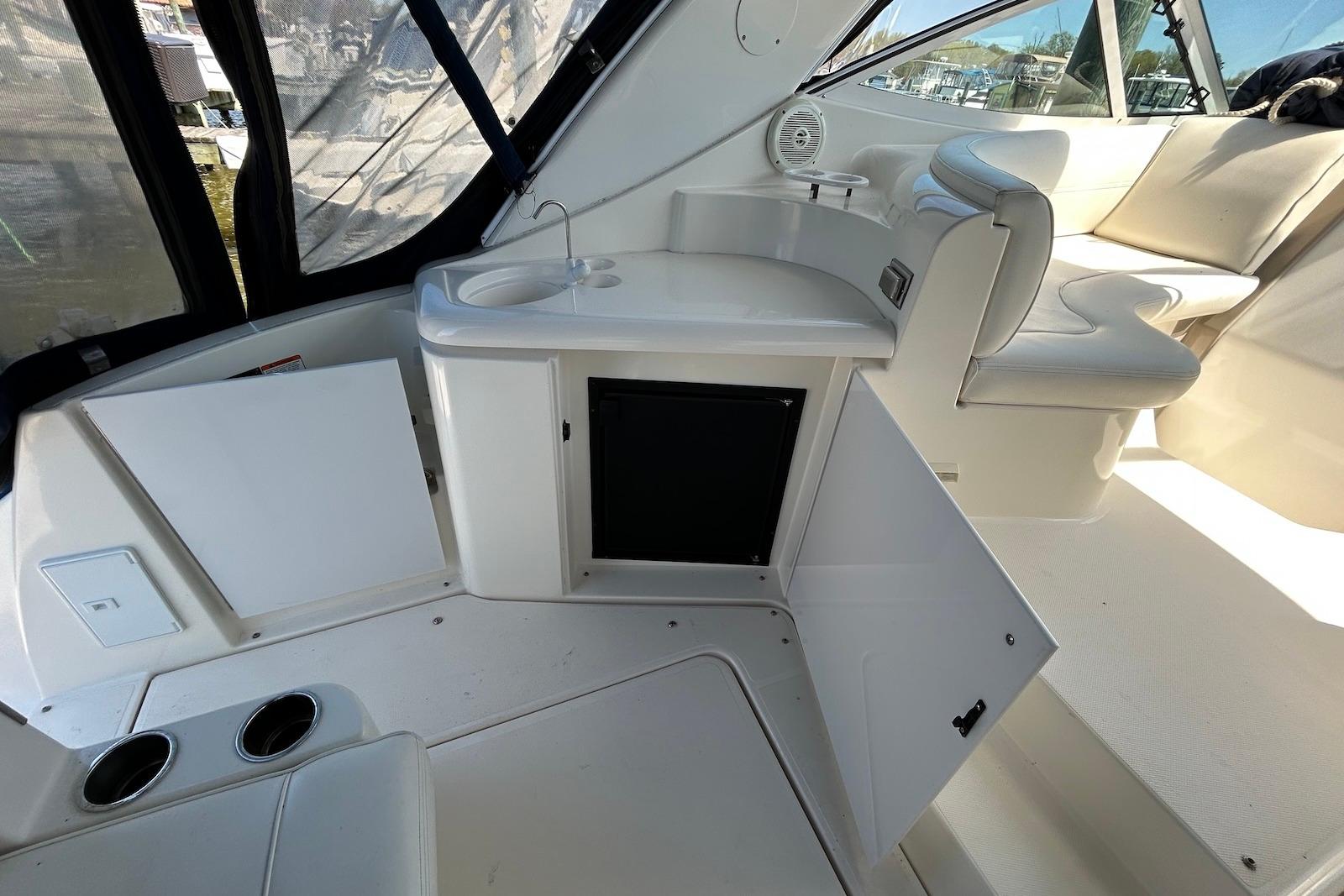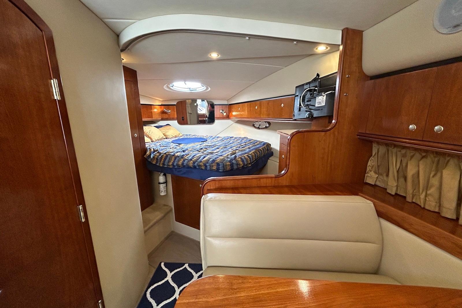 The Cruisers 340 Express offers unbeatable performance in an expertly designed, luxurious cruising package. Her interior accommodations will sleep five comfortably. The forward stateroom features a large double bed with easy access, and the stateroom can be closed off from the salon by a privacy curtain or an optional bulkhead and door. Aft, owners can select either a fixed double berth, maximizing overnight accommodations for guests, or an alternate layout with a circular settee that can also be converted to a double berth. With the settee layout, this area can effectively lengthen the salon into one wide open living space or, with the privacy curtain, it can serve as a comfortable midcabin. The facing dinette - or available crescent-shaped, convertible dinette - to starboard provides an additional berth. Located just to port of the companionway is a full-service galley with all the amenities, including a large refrigerator/freezer, microwave and double-burner electric stove. For additional onboard convenience while cruising or living aboard, the 340 also provides a feature unusual for a boat in this class: a spacious head with a large, separate shower stall and full standing headroom. Abovedecks, the 340 has a generous cockpit seating arrangement that is ideal for dockside or on-the-water entertaining. She also features a wet bar, cockpit shower and available cockpit refrigerator or ice maker - perfect for fun-filled summer afternoons with family and friends. A custom-fitted enclosure will keep everyone protected from the hot sun or inclement weather. And, the 340 Express boasts a wide variety of power options, as she is available with either stern drive or inboard power.