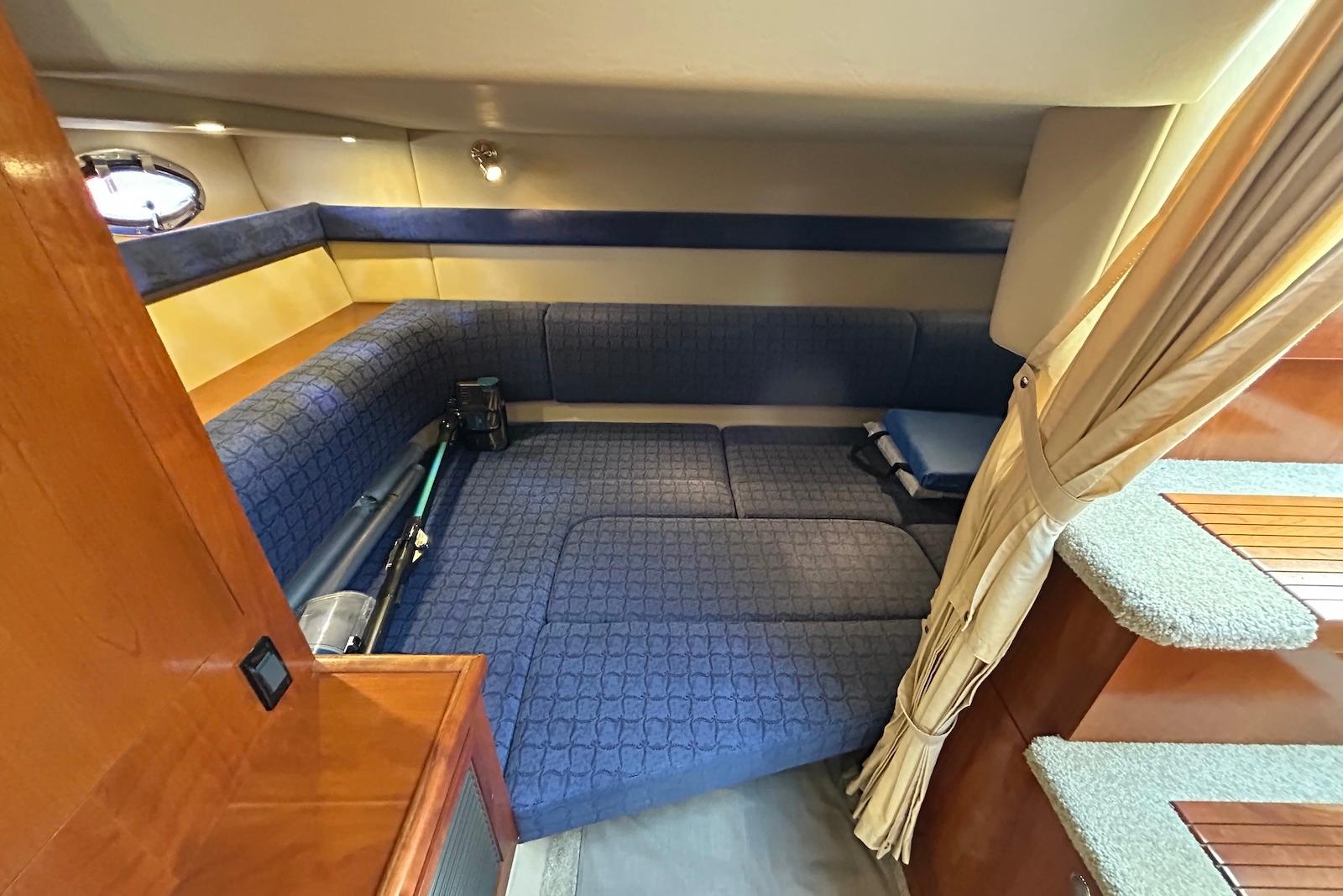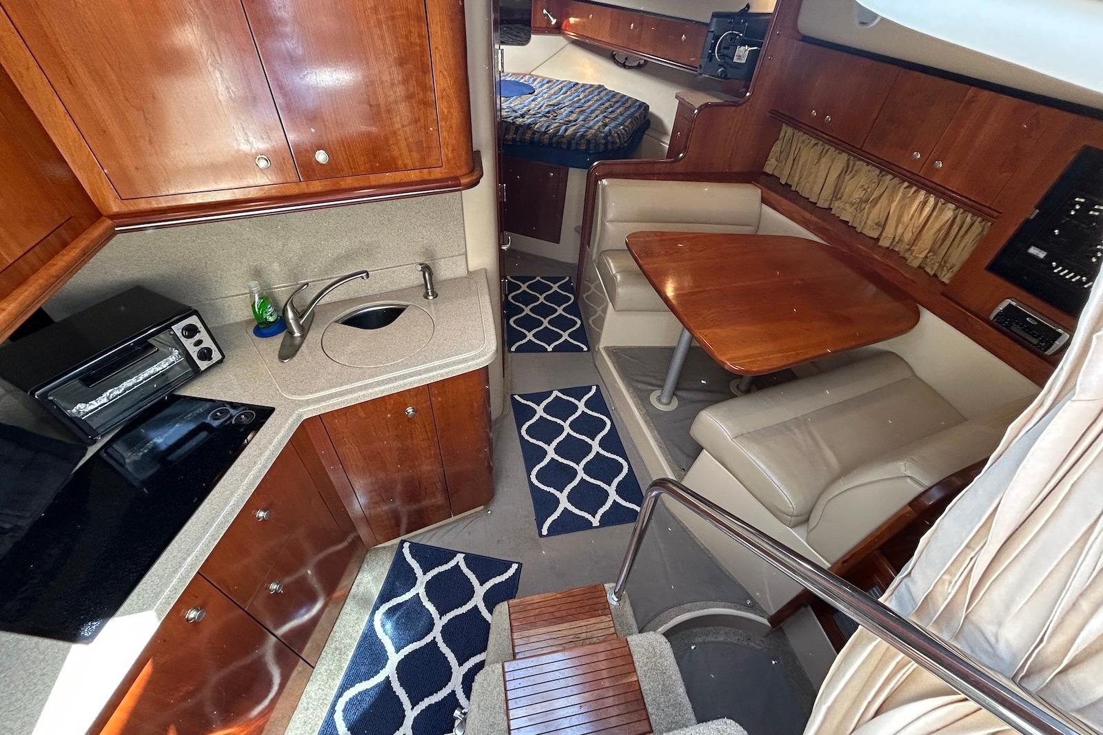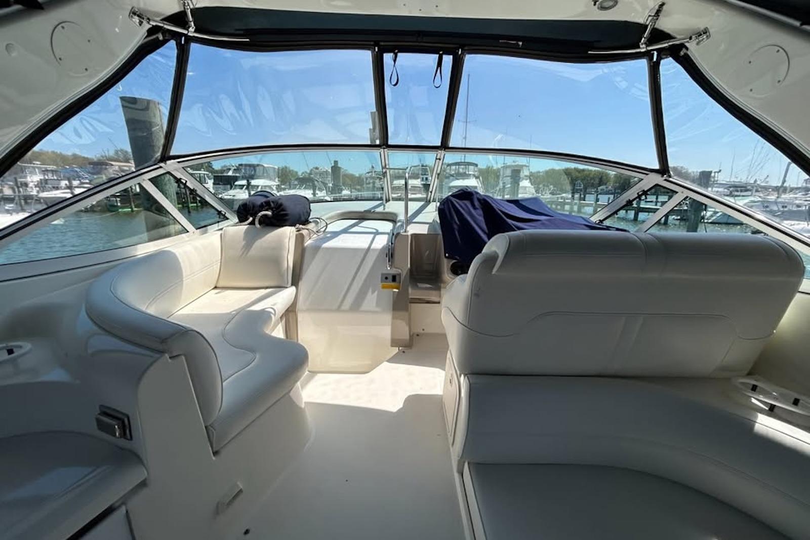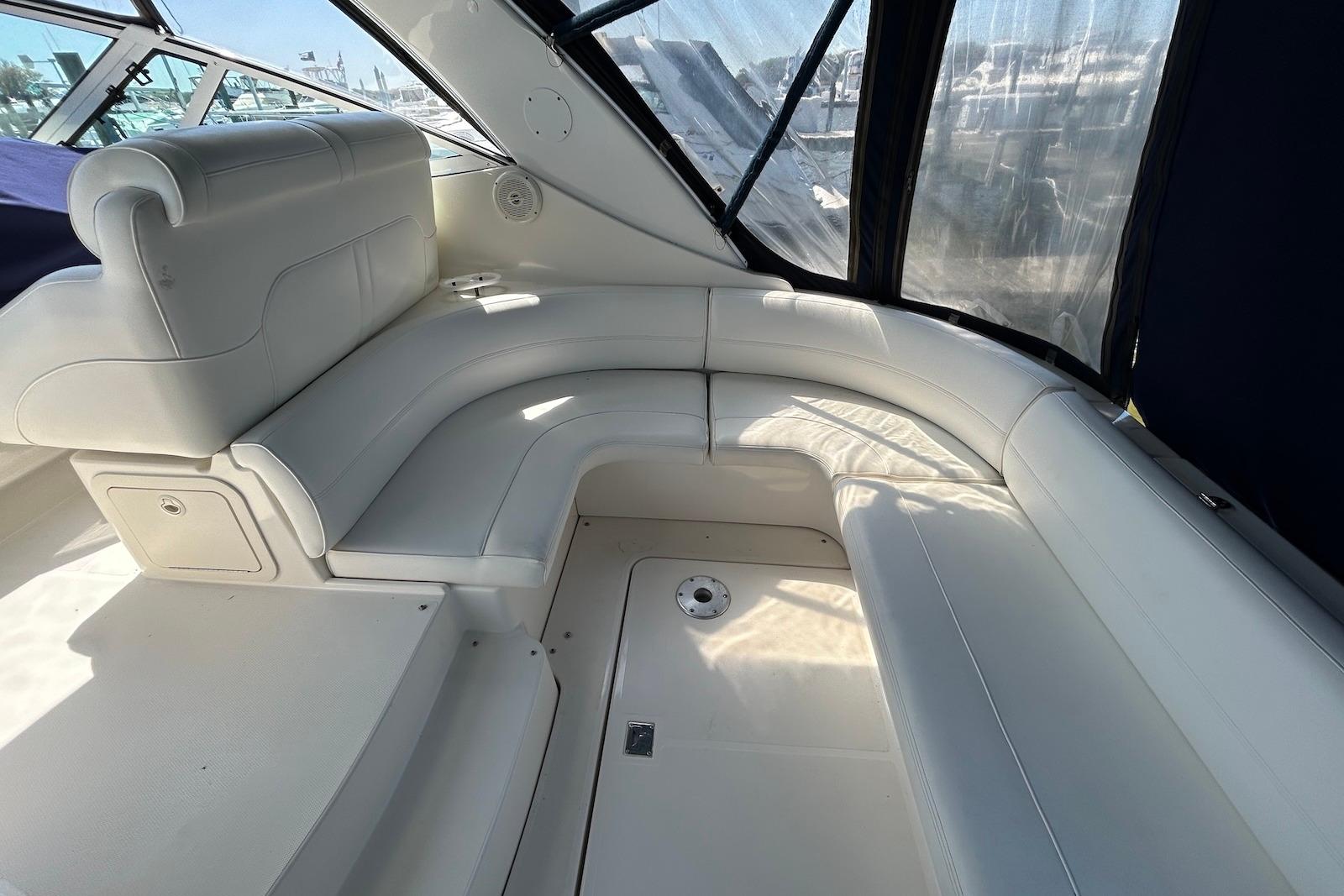 The Cruisers 340 Express offers unbeatable performance in an expertly designed, luxurious cruising package. Her interior accommodations will sleep five comfortably. The forward stateroom features a large double bed with easy access, and the stateroom can be closed off from the salon by a privacy curtain or an optional bulkhead and door. Aft, owners can select either a fixed double berth, maximizing overnight accommodations for guests, or an alternate layout with a circular settee that can also be converted to a double berth. With the settee layout, this area can effectively lengthen the salon into one wide open living space or, with the privacy curtain, it can serve as a comfortable midcabin. The facing dinette - or available crescent-shaped, convertible dinette - to starboard provides an additional berth. Located just to port of the companionway is a full-service galley with all the amenities, including a large refrigerator/freezer, microwave and double-burner electric stove. For additional onboard convenience while cruising or living aboard, the 340 also provides a feature unusual for a boat in this class: a spacious head with a large, separate shower stall and full standing headroom. Abovedecks, the 340 has a generous cockpit seating arrangement that is ideal for dockside or on-the-water entertaining. She also features a wet bar, cockpit shower and available cockpit refrigerator or ice maker - perfect for fun-filled summer afternoons with family and friends. A custom-fitted enclosure will keep everyone protected from the hot sun or inclement weather. And, the 340 Express boasts a wide variety of power options, as she is available with either stern drive or inboard power.