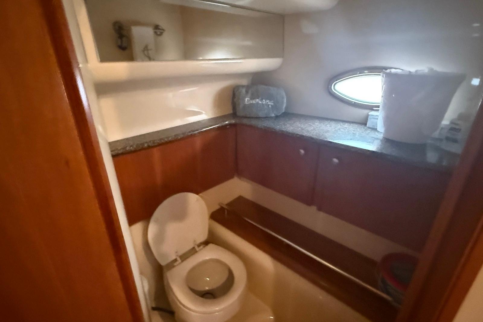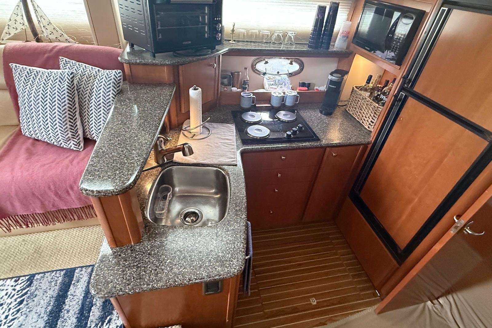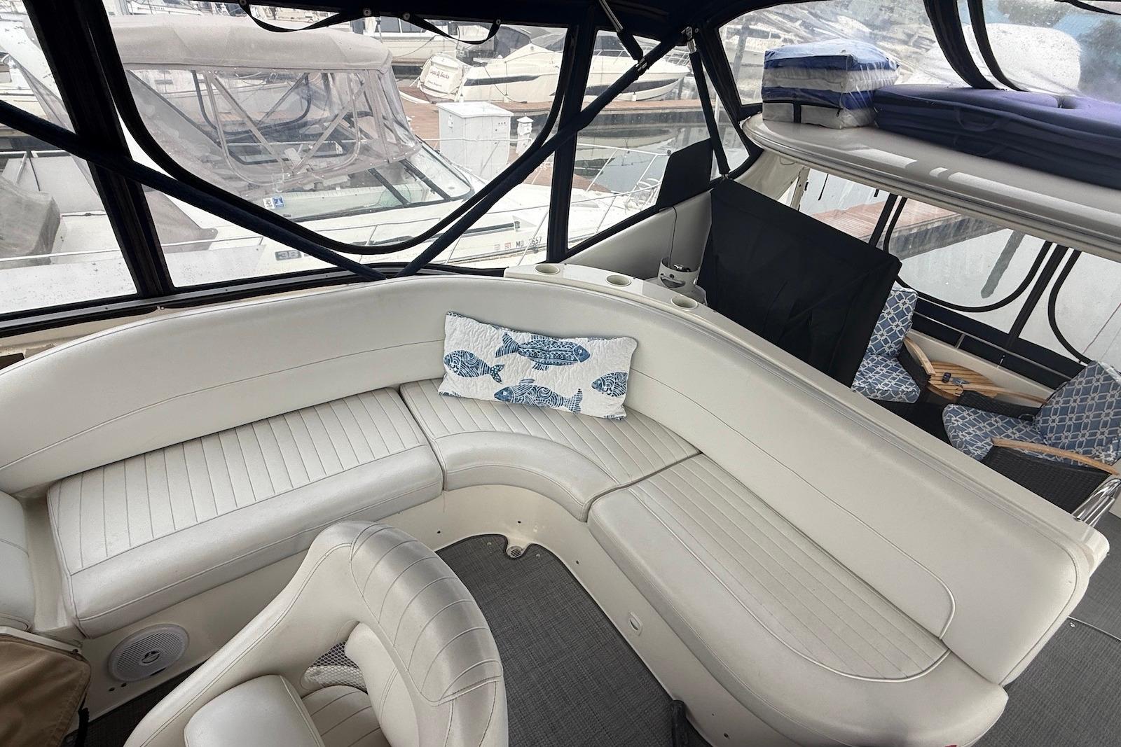 With a hull design that maximizes performance and a deck design that optimizes space, the Meridian 408's aft cabin configuration has plenty of room for family and friends. Exceptional interior visibility gives everyone views of the magnificent surroundings. A full-beam salon lets you entertain with ease, while the salon media center features a 24-inch television, VCR, AM/FM stereo and CD player to deliver entertainment in style. A forward head can be accessed from the forward stateroom and salon, for use as a day head. A full-beam master stateroom with regular queen innerspring mattress lets you sleep in luxurious comfort.