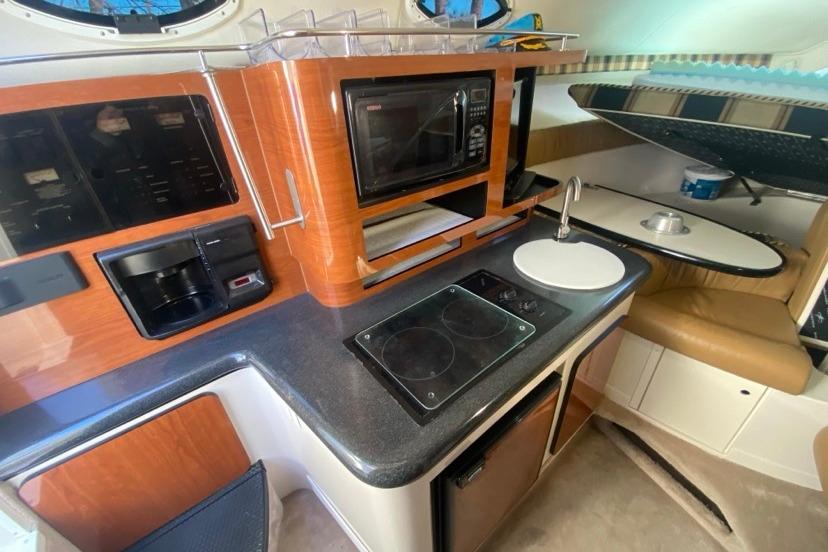*downstairs 1 22” TV, coffee maker, dual stove top, microwave and fridge.all work excellent.windlass anchor, spot light, train horn and stern wash down hose