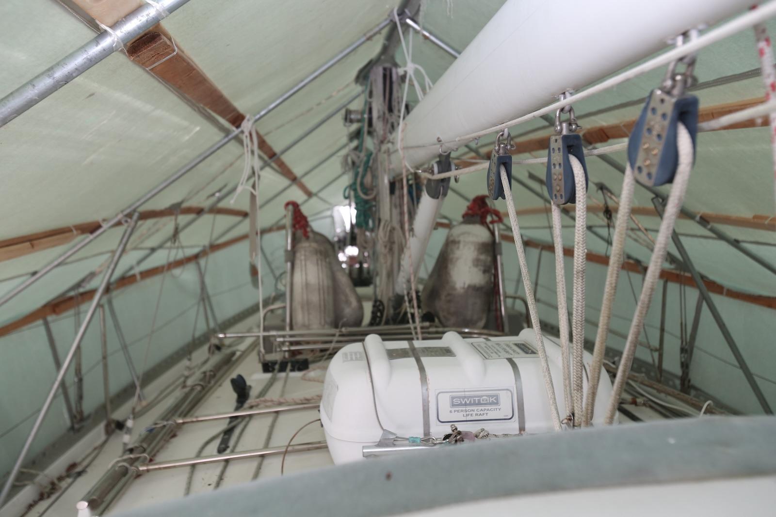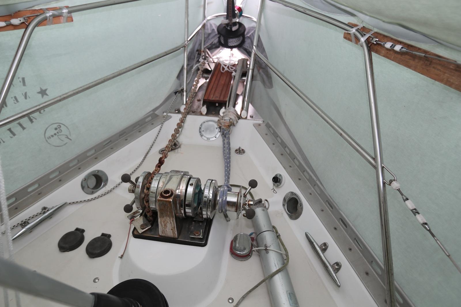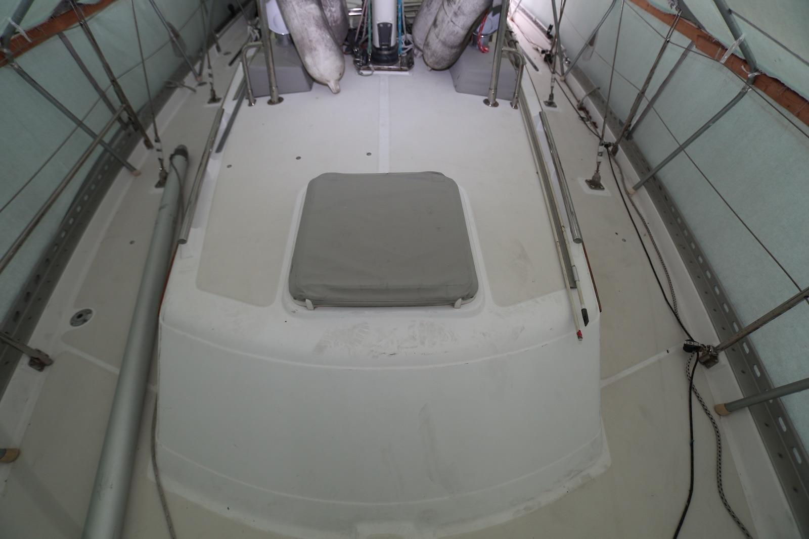 Stainless steel bow sprit with bobstay, two anchor rollers, divided bow chain locker for two anchor rodes