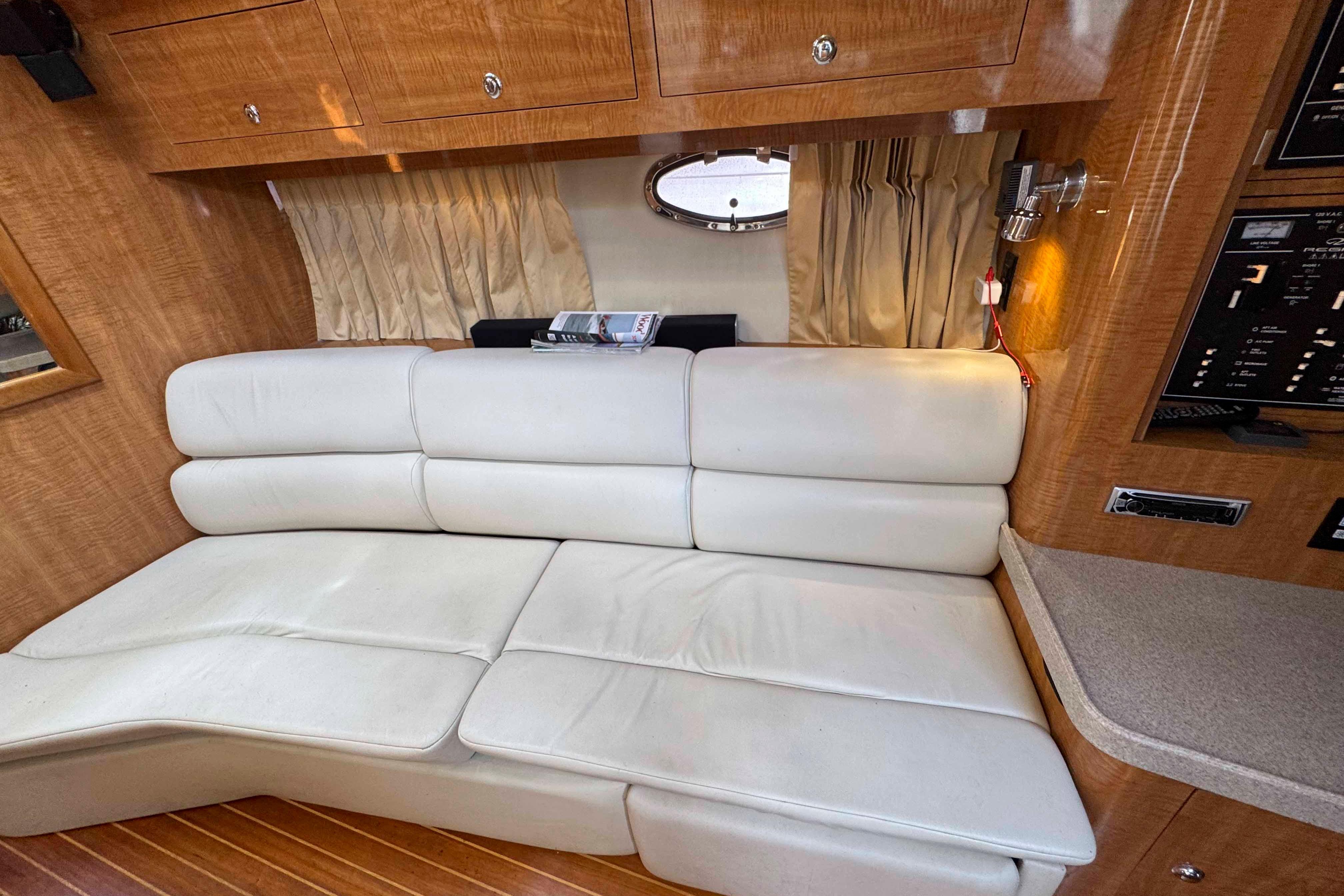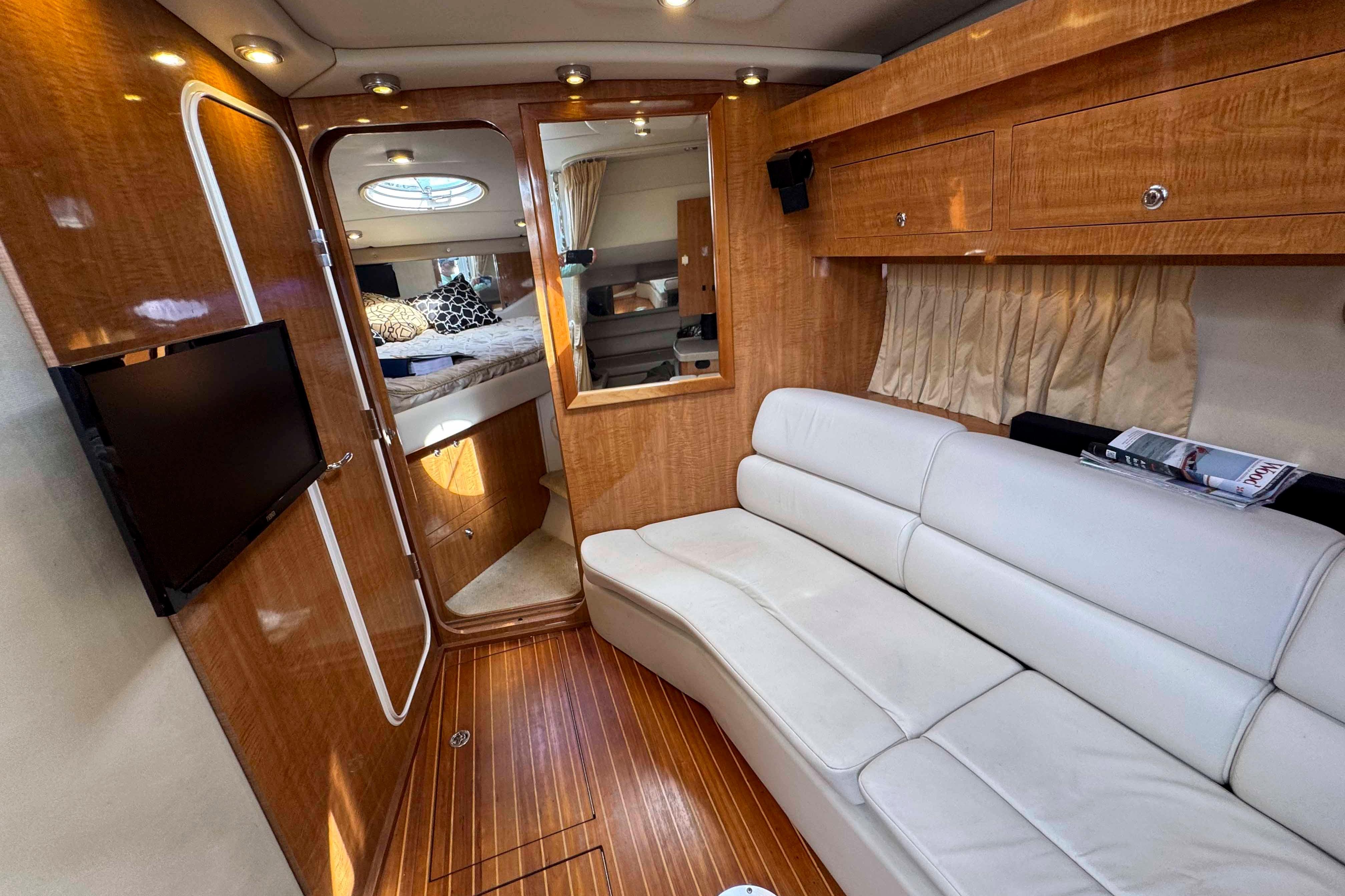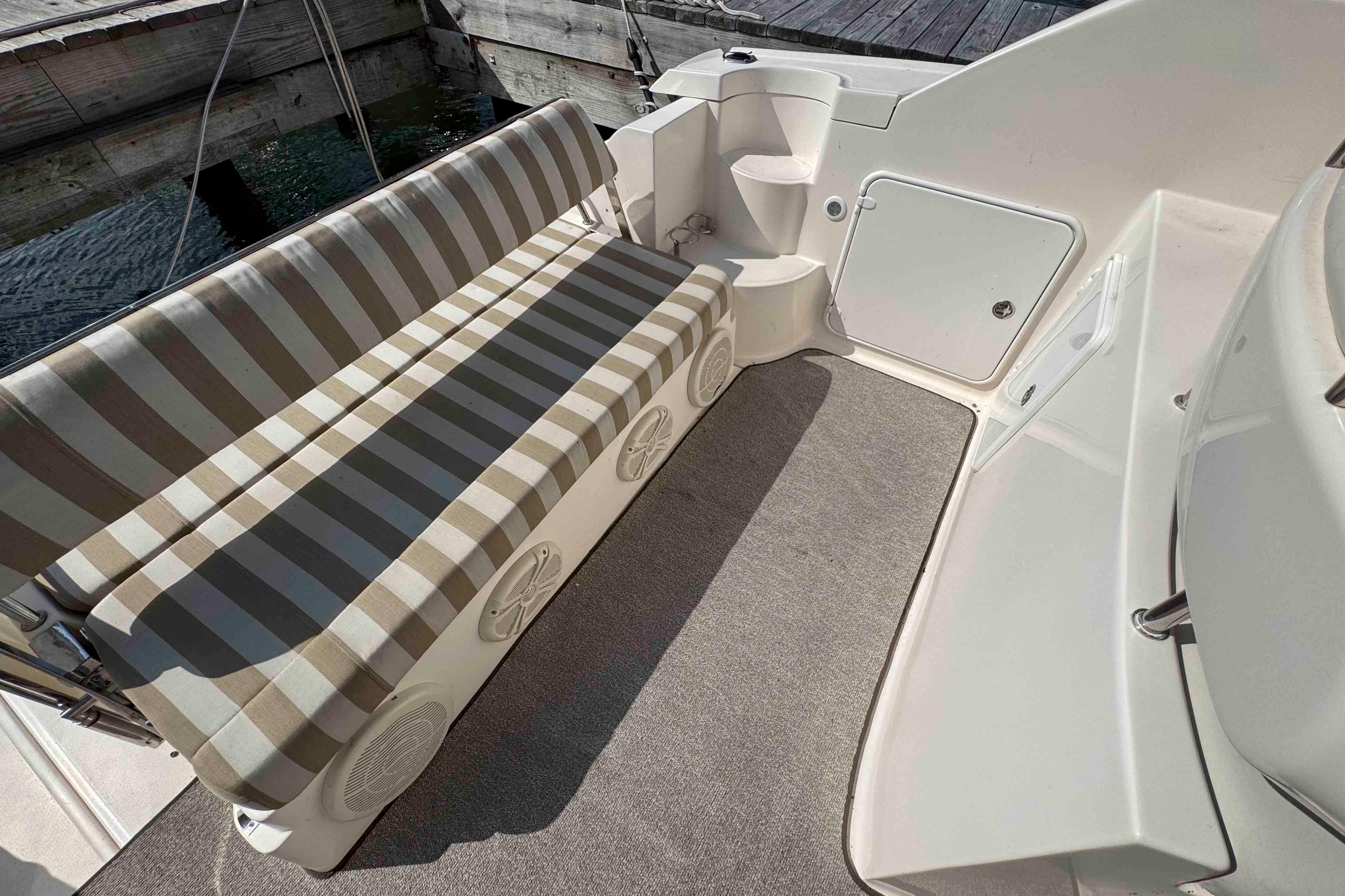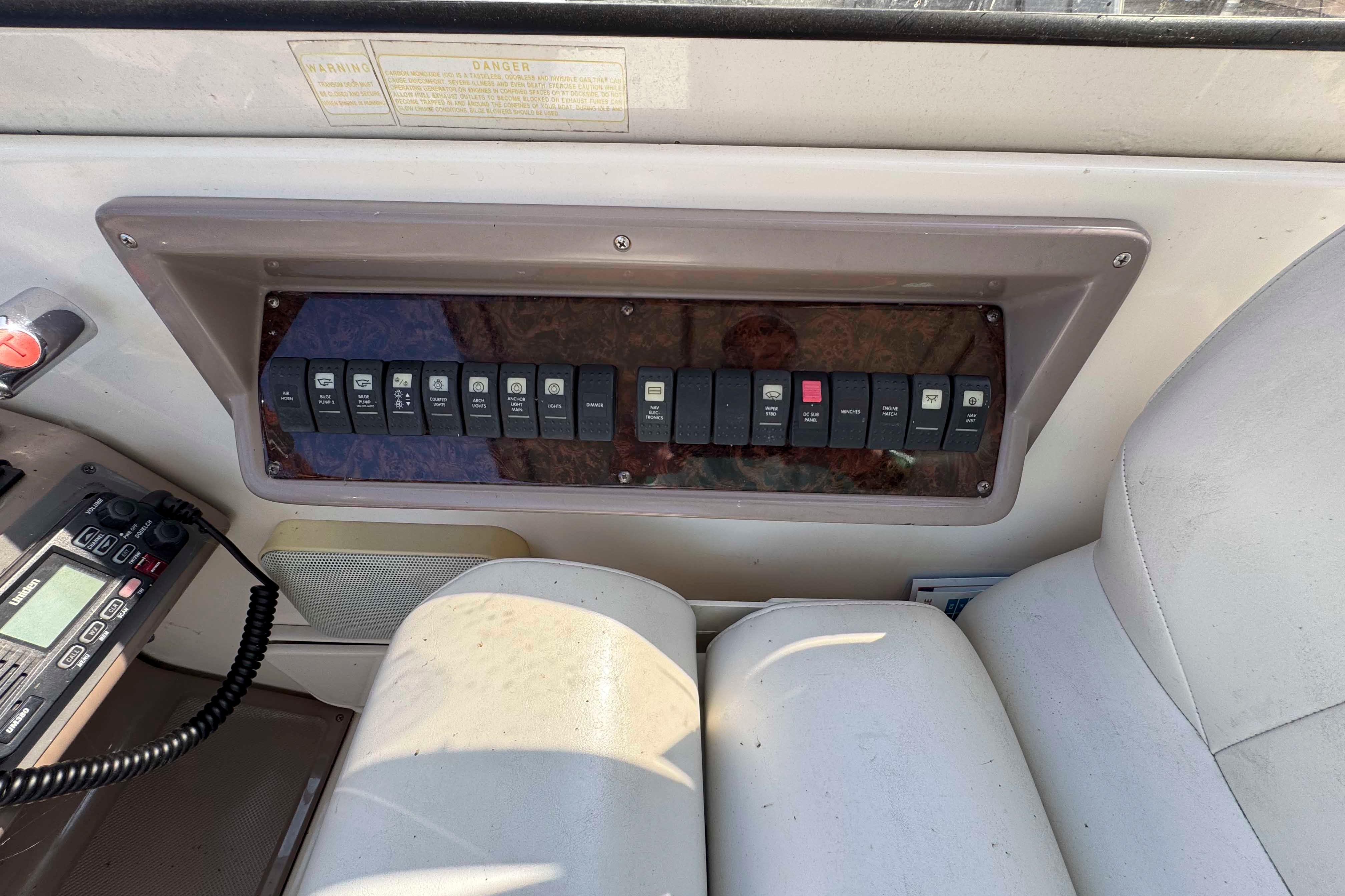 Boarding through the swim platform, as you proceed to the helm area, you will pass the rear foldaway seat which lifts electronically for access to the engine compartment. Next is a large horseshoe shaped lounge opposite the helm. From here you may go below through the companionway. There you will find the galley to port and a large settee to starboard. Going aft is a lounge area that converts to a second stateroom. Going forward, a pocket door separates the master stateroom from the salon. Head and shower are forward to port. Entire interior is done in Cherry paneling with Corian countertops. Stylish and comfortable describe this interior.