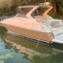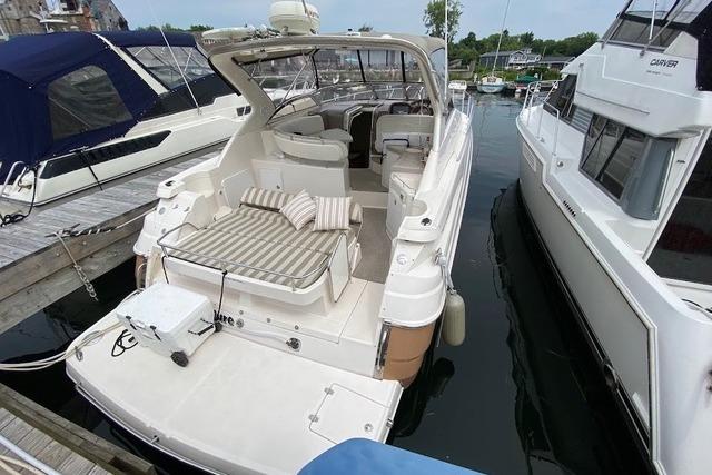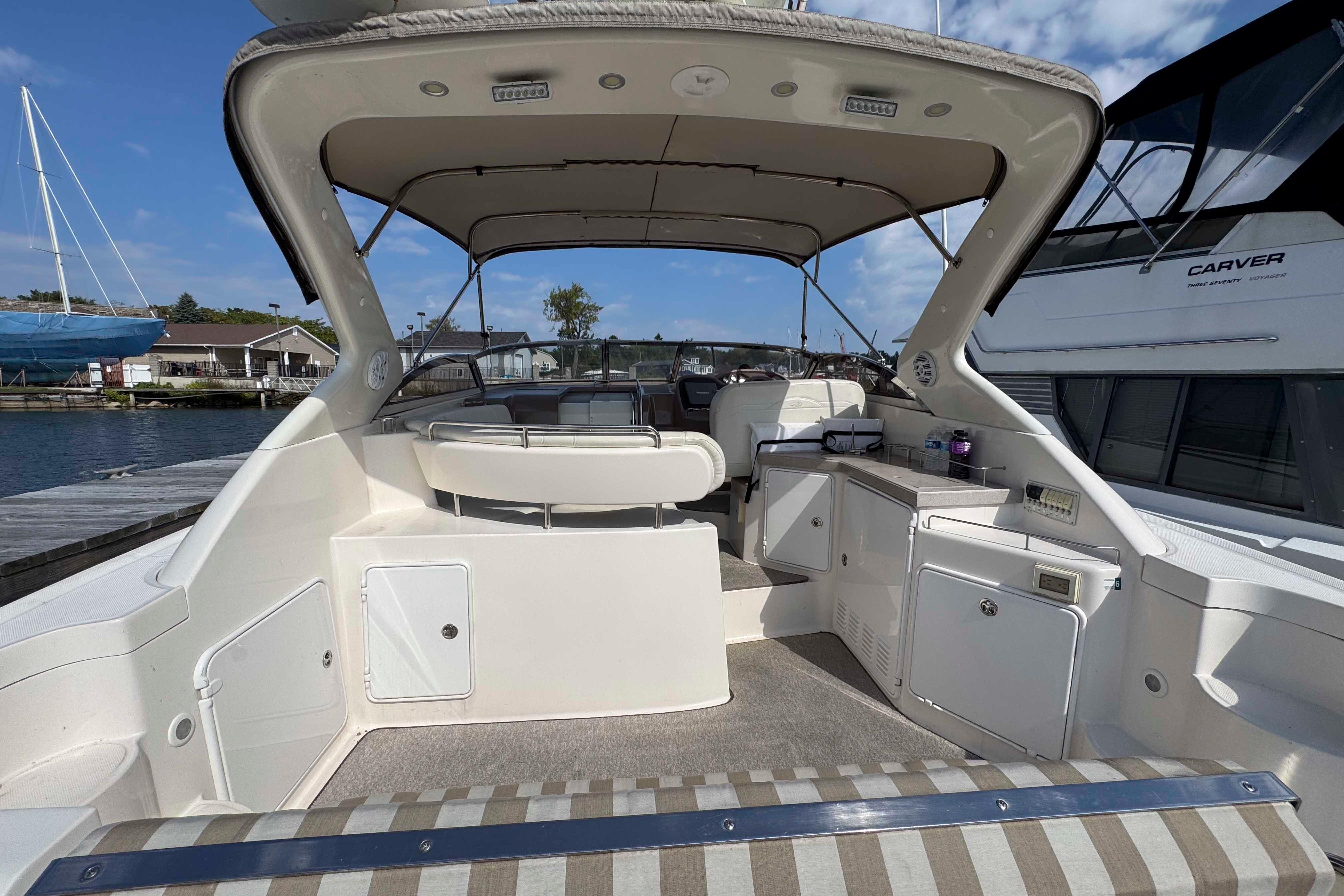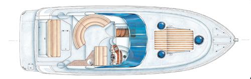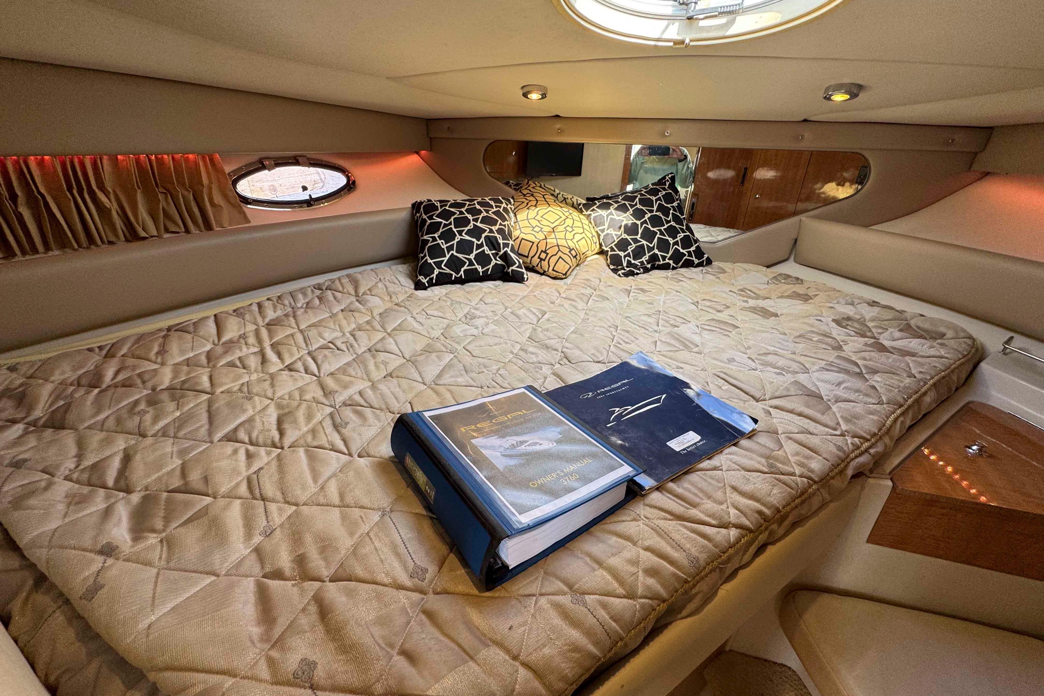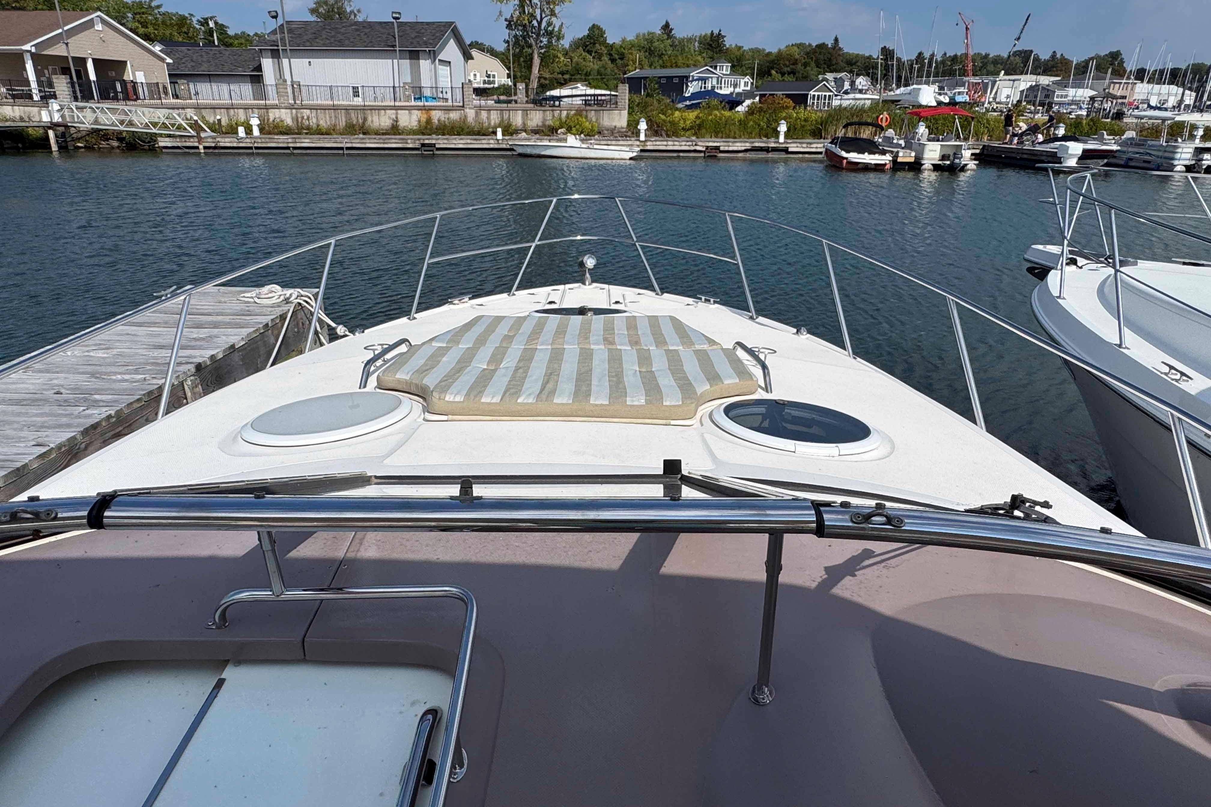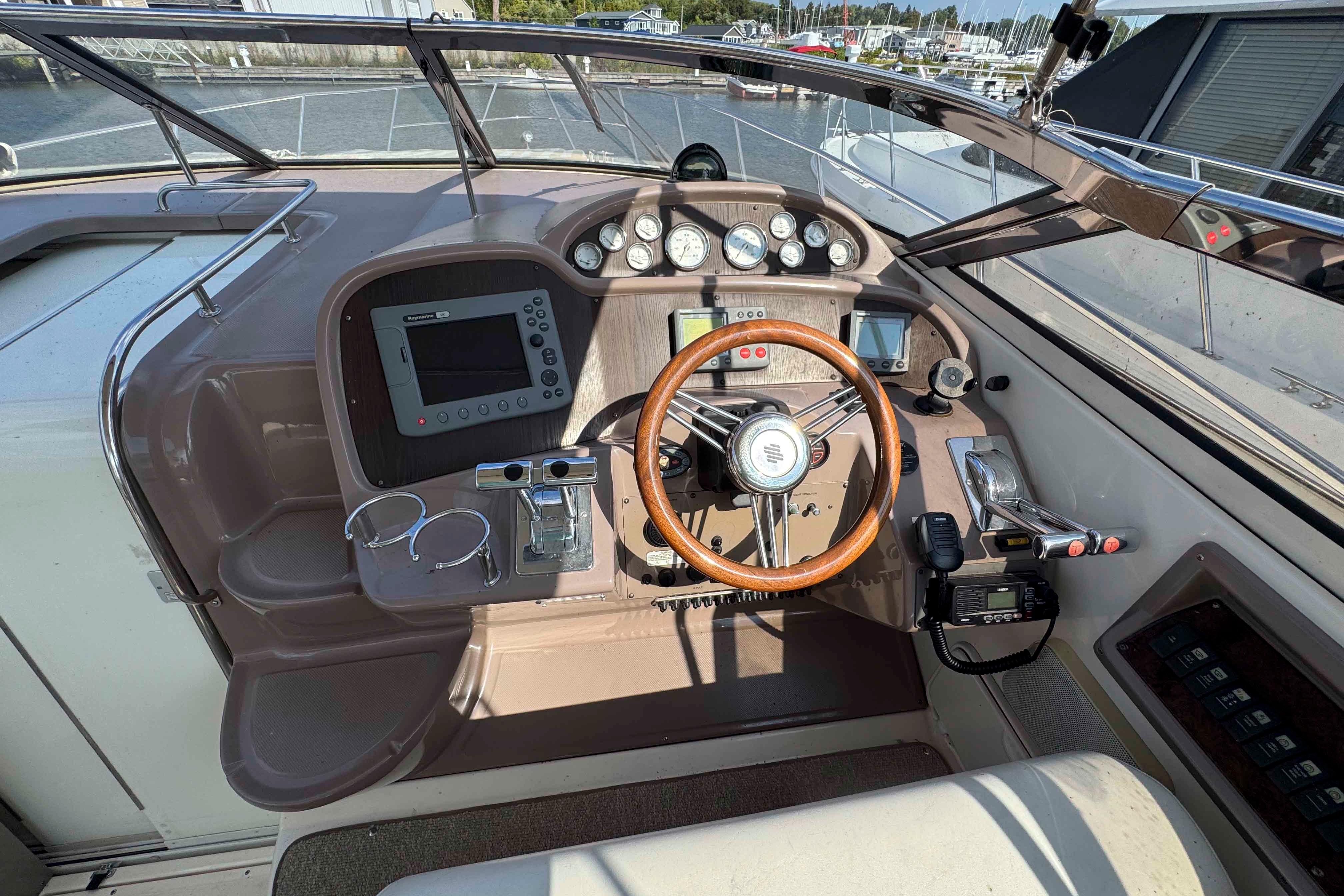 Boarding through the swim platform, as you proceed to the helm area, you will pass the rear foldaway seat which lifts electronically for access to the engine compartment. Next is a large horseshoe shaped lounge opposite the helm. From here you may go below through the companionway. There you will find the galley to port and a large settee to starboard. Going aft is a lounge area that converts to a second stateroom. Going forward, a pocket door separates the master stateroom from the salon. Head and shower are forward to port. Entire interior is done in Cherry paneling with Corian countertops. Stylish and comfortable describe this interior.