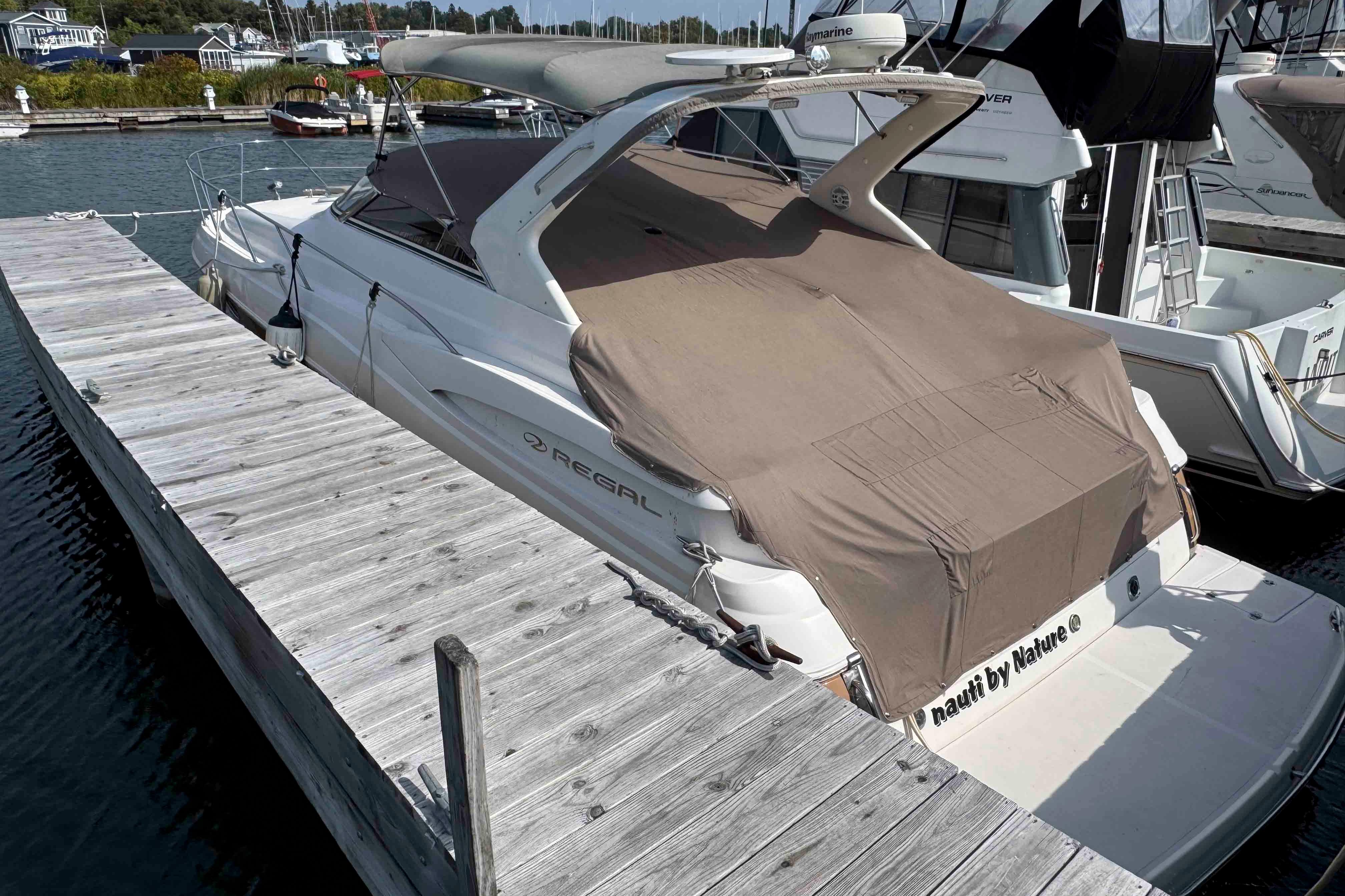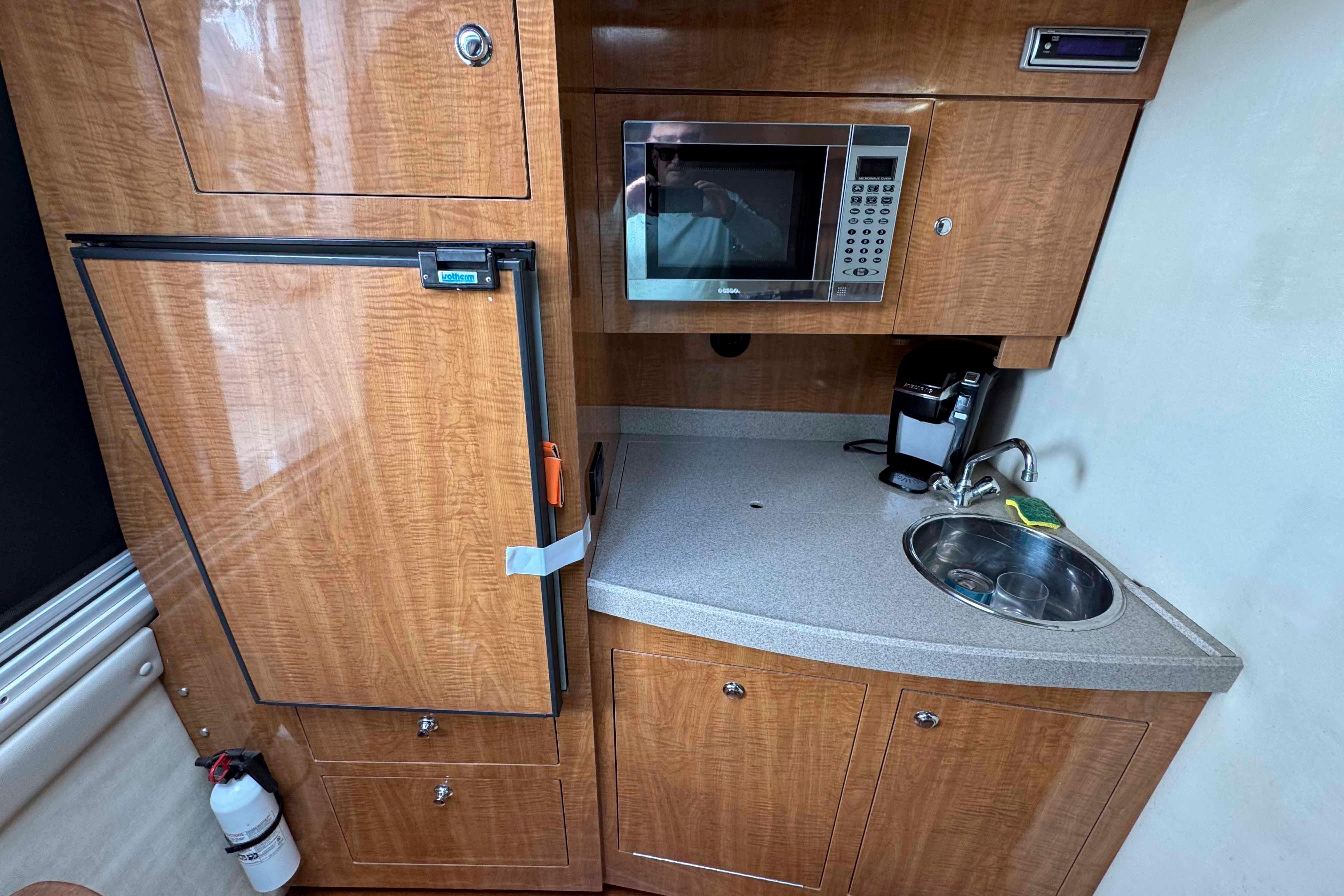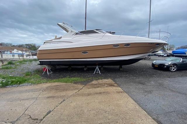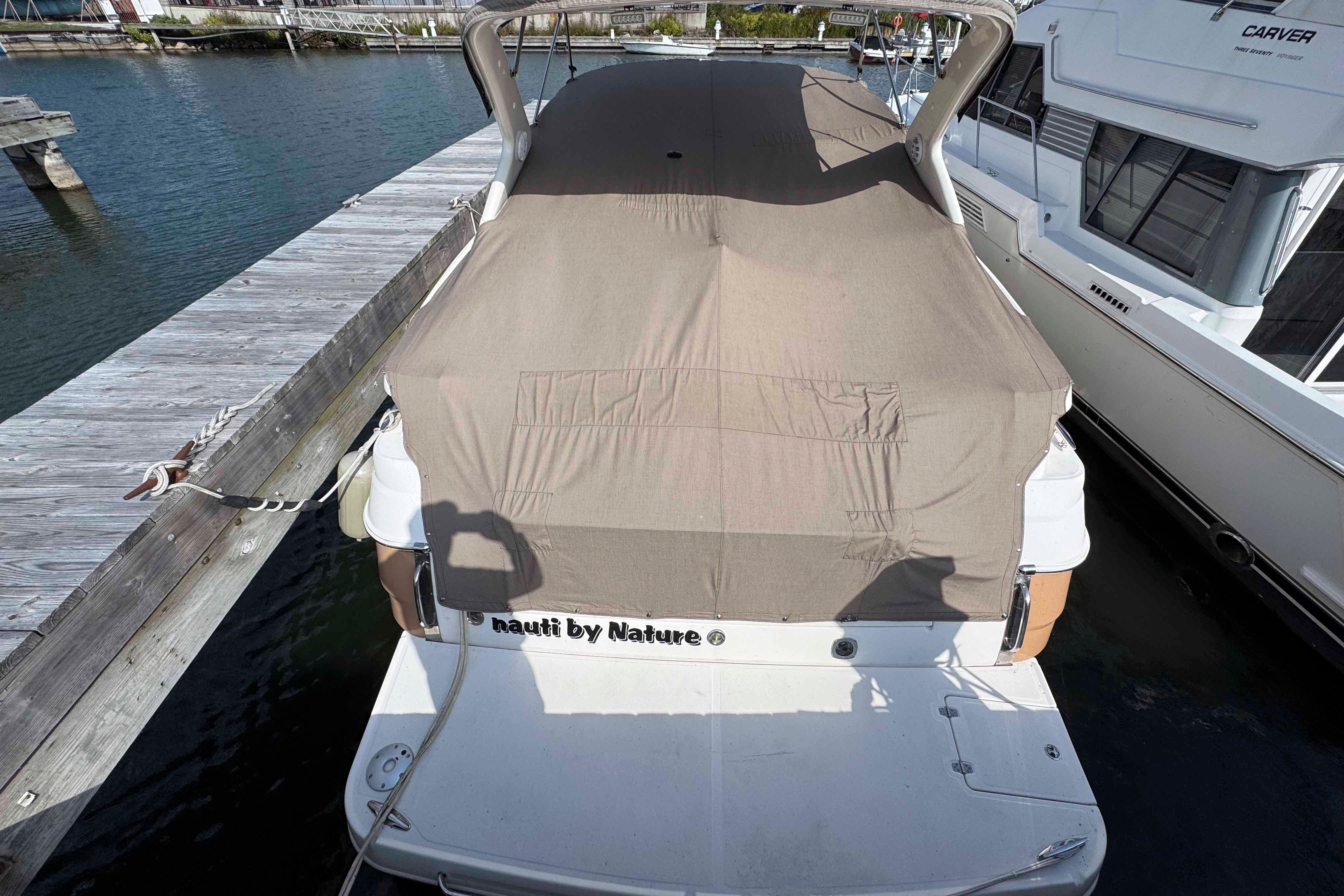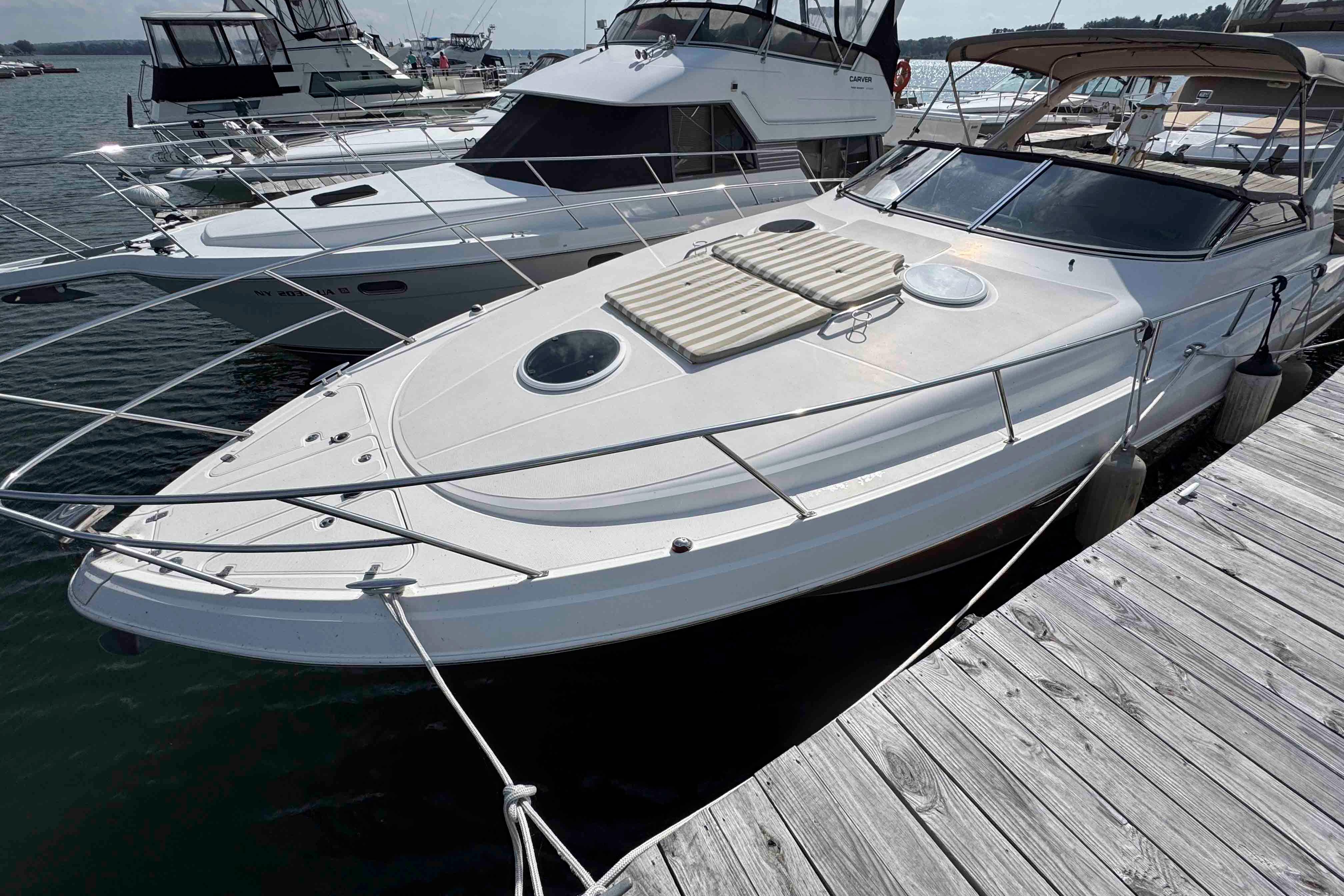 Boarding through the swim platform, as you proceed to the helm area, you will pass the rear foldaway seat which lifts electronically for access to the engine compartment. Next is a large horseshoe shaped lounge opposite the helm. From here you may go below through the companionway. There you will find the galley to port and a large settee to starboard. Going aft is a lounge area that converts to a second stateroom. Going forward, a pocket door separates the master stateroom from the salon. Head and shower are forward to port. Entire interior is done in Cherry paneling with Corian countertops. Stylish and comfortable describe this interior.