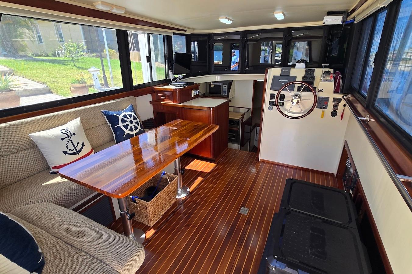 The bright and spacious salon features large panoramic windows, comfortable seating, and excellent visibility from the helm. The thoughtfully designed galley offers ample storage and counter space, making meal preparation easy whether underway or at anchor.