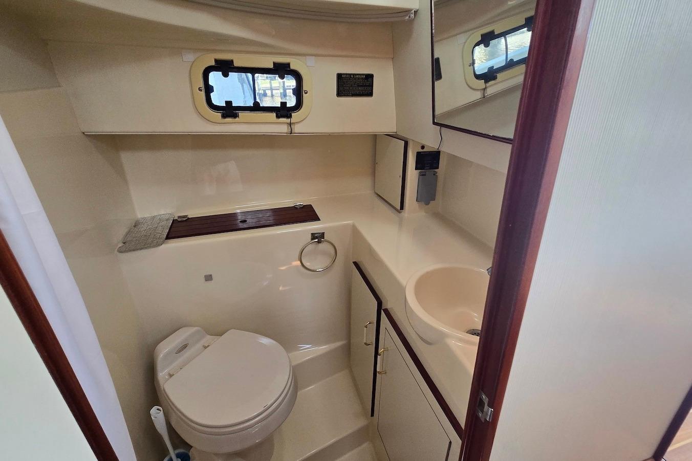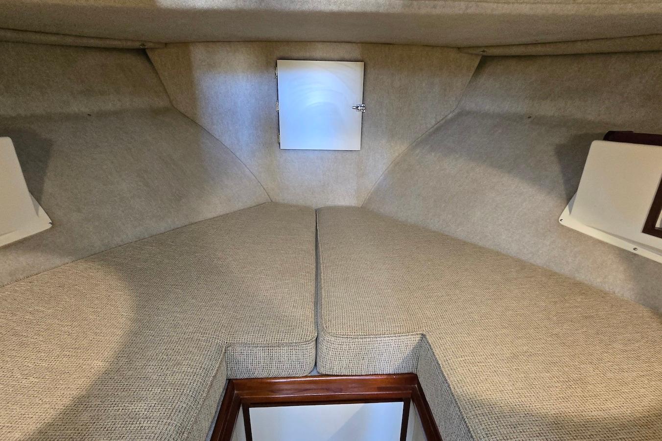 Below deck, the private forward stateroom features a comfortable v-berth with generous storage. The vessel also includes a full head with with shower, providing comfort and convenience for extended cruising.