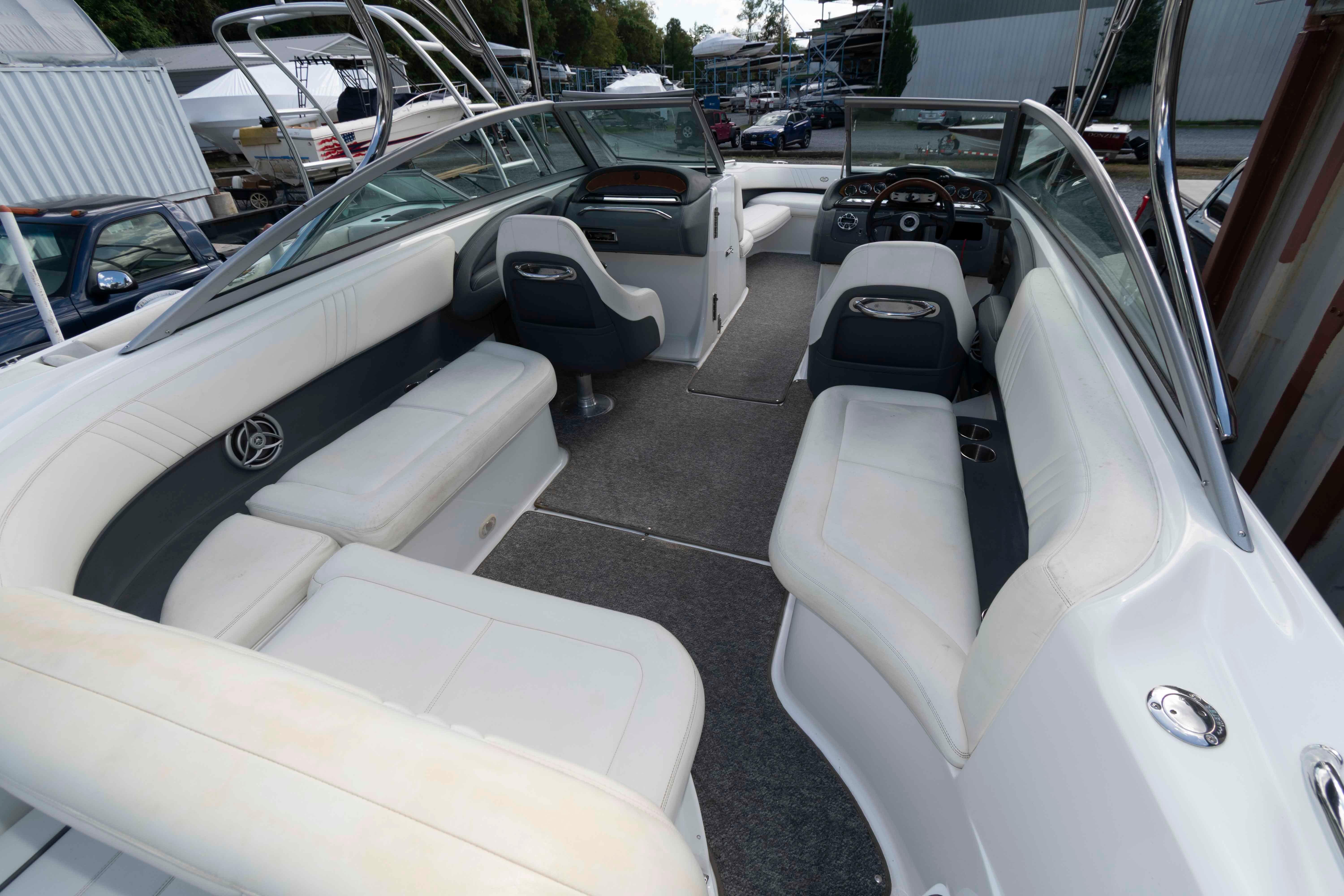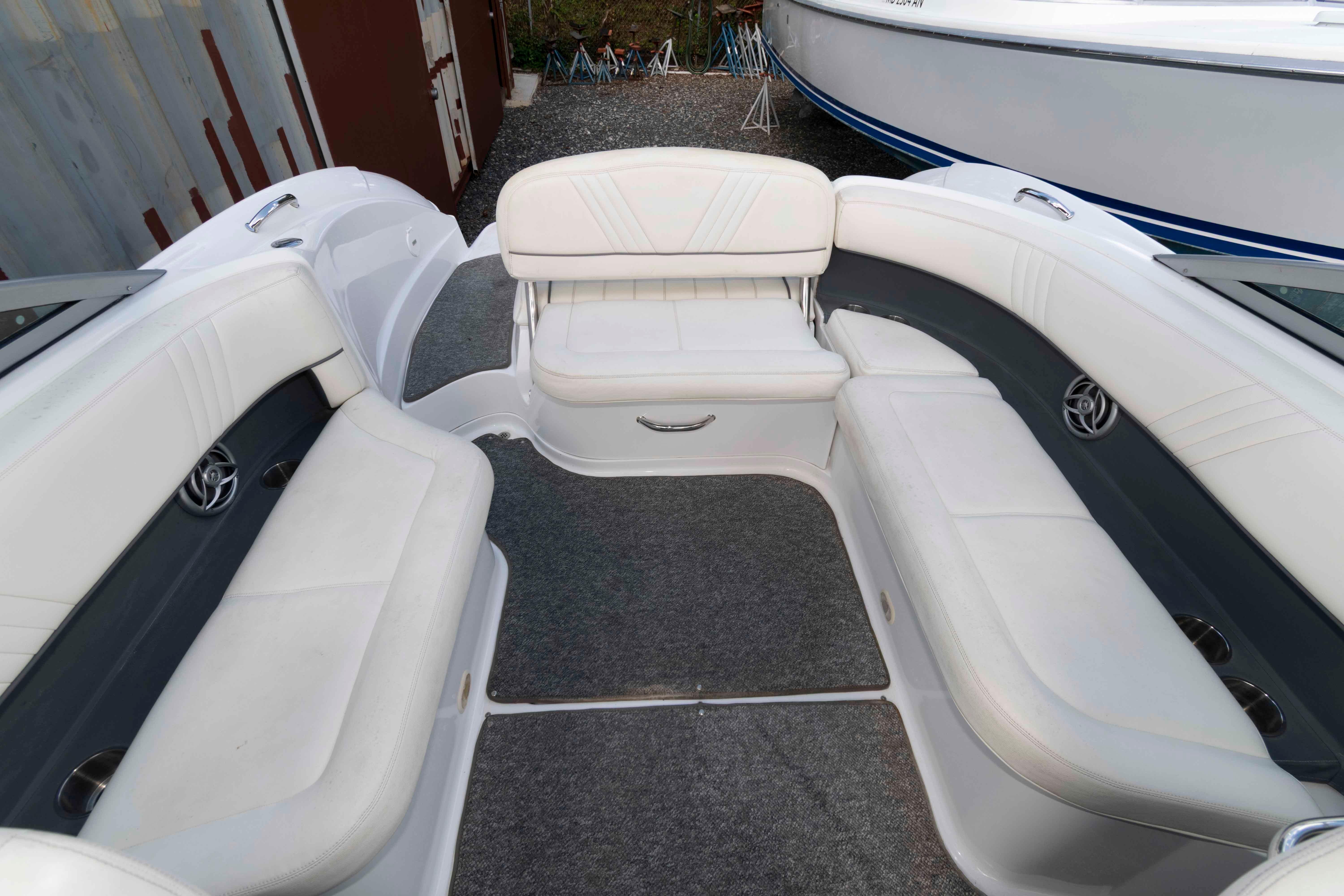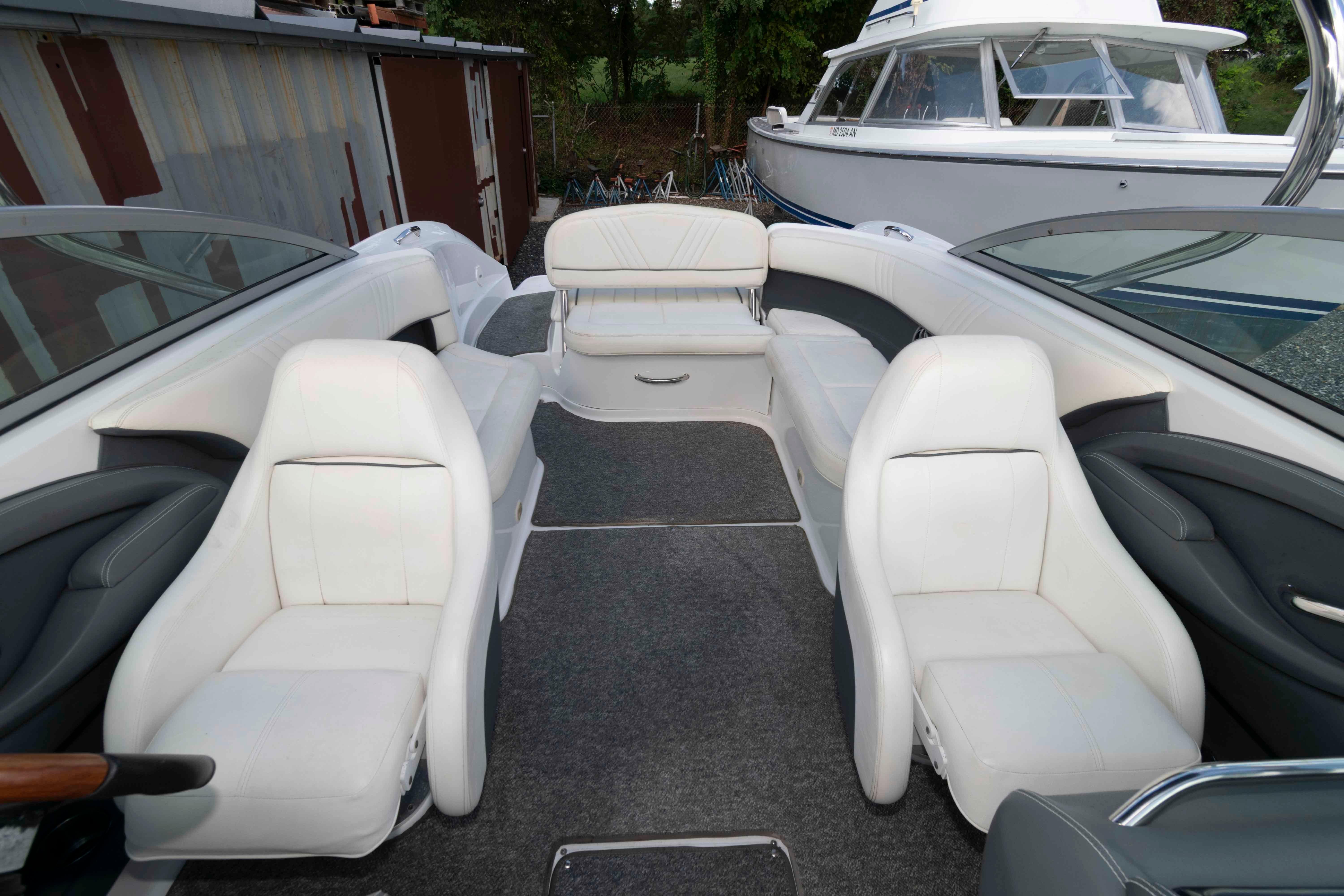 The 252 jumps at the opportunity to entertain, from the deep-down relaxation of the small island that is the 252?s sunpad with its adjustable backrest to the walkthru doors at the bow, accommodating easy traffic flow back and forth as does the side walk-thru astern, even with a capacity crowd of 15 funlovers on board. Two massive ice chests huddle out of sight, molded into the cockpit, in keeping with the 252?s maximized use of space, from an easily accessed ski locker underfoot to handy stash compartments thoughtfully placed here and there stem to stern. The entertainment system comprises an entire family of standard equipment ? AM/FM radio and CD player with six speakers, an iPod/MP3 port, and stereo remote at the dash.
