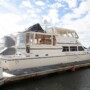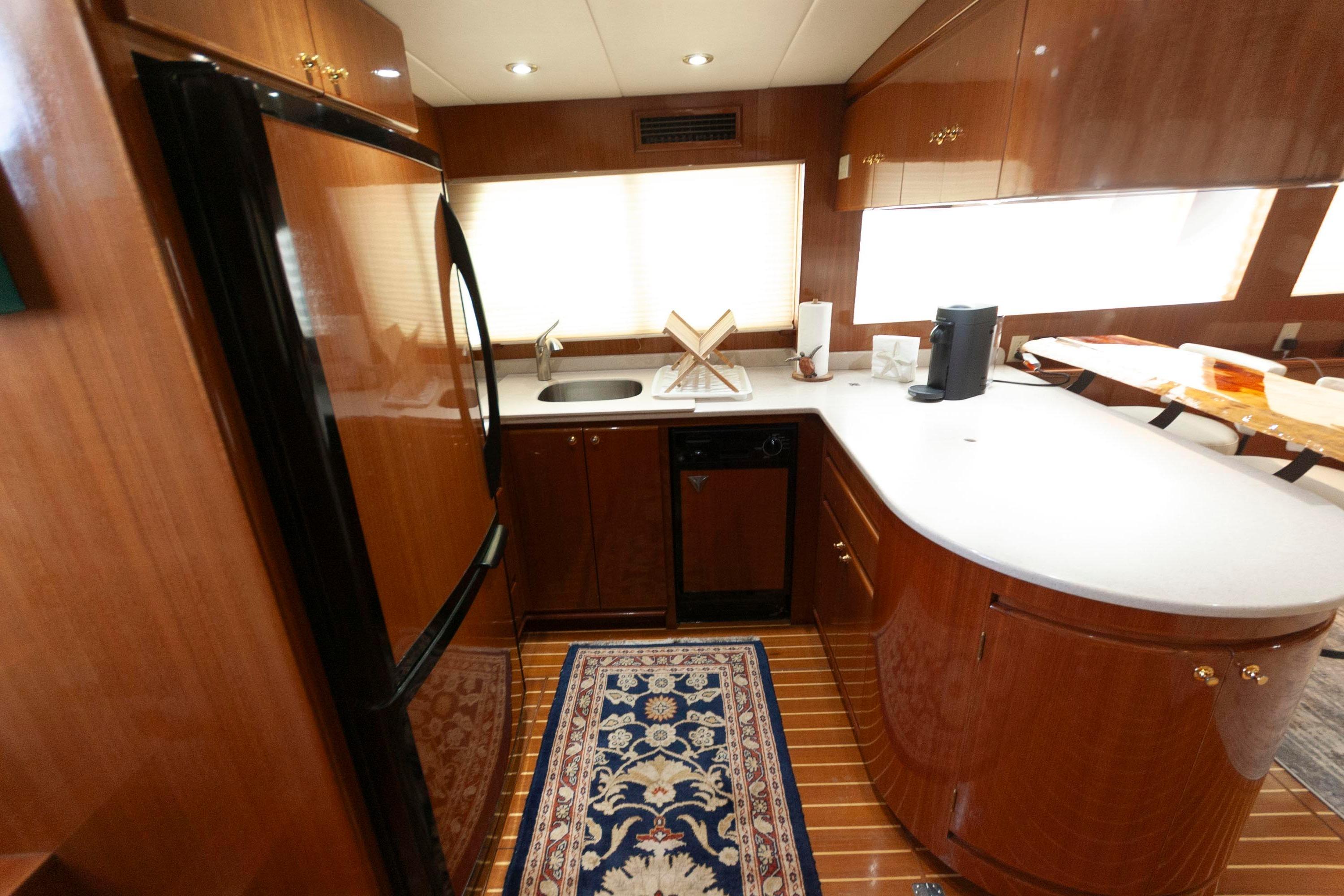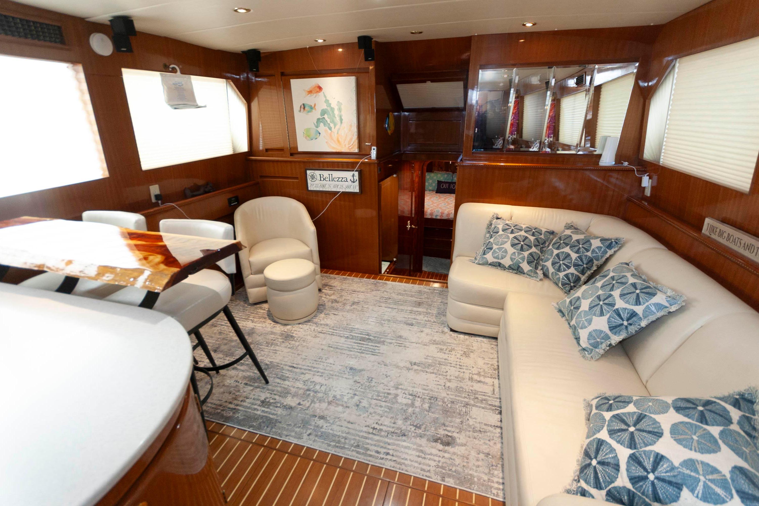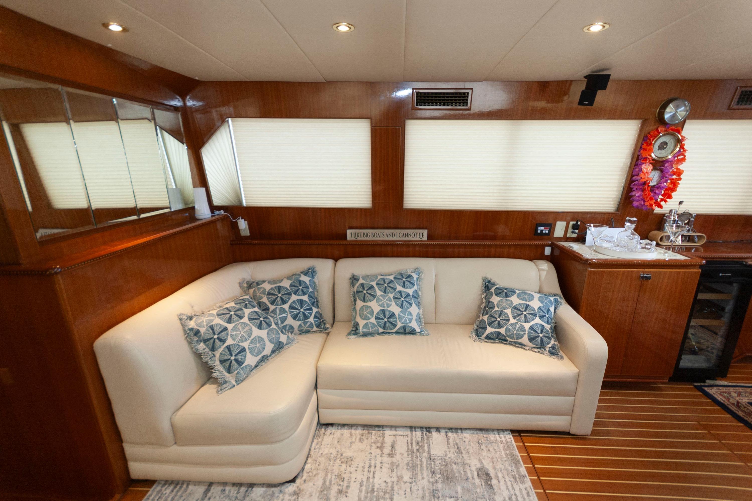 The Main Salon is entered through a stainless steel sliding door from the aft deck and has all newer furnishings. Upon descending 3 stairs to the cabin one will immediately notice the quality of the high gloss Cherry wood interior with detailed inlayed accents. The entire interior of the vessel has Teak and Holly flooring with bounded high quality carpeting.