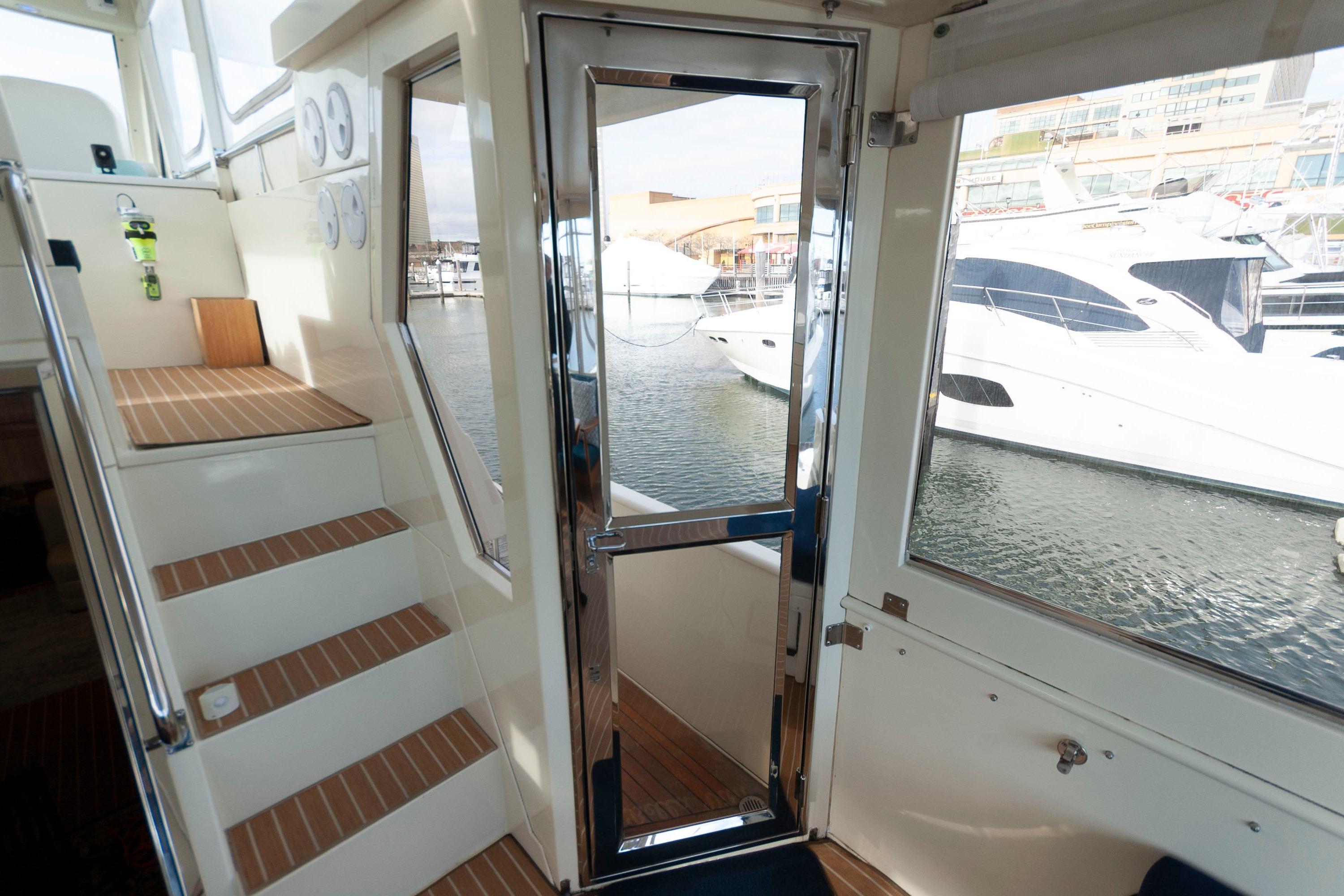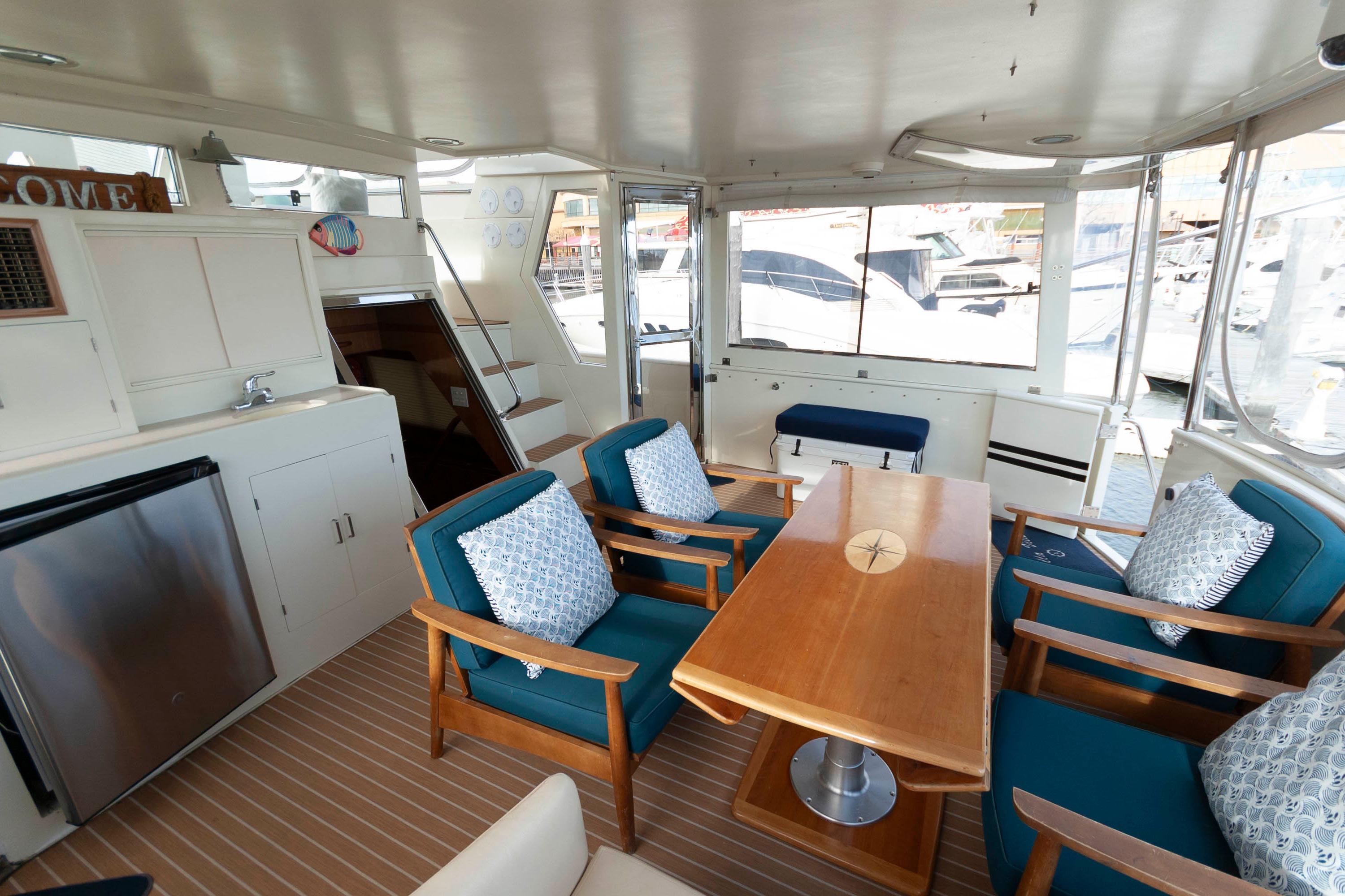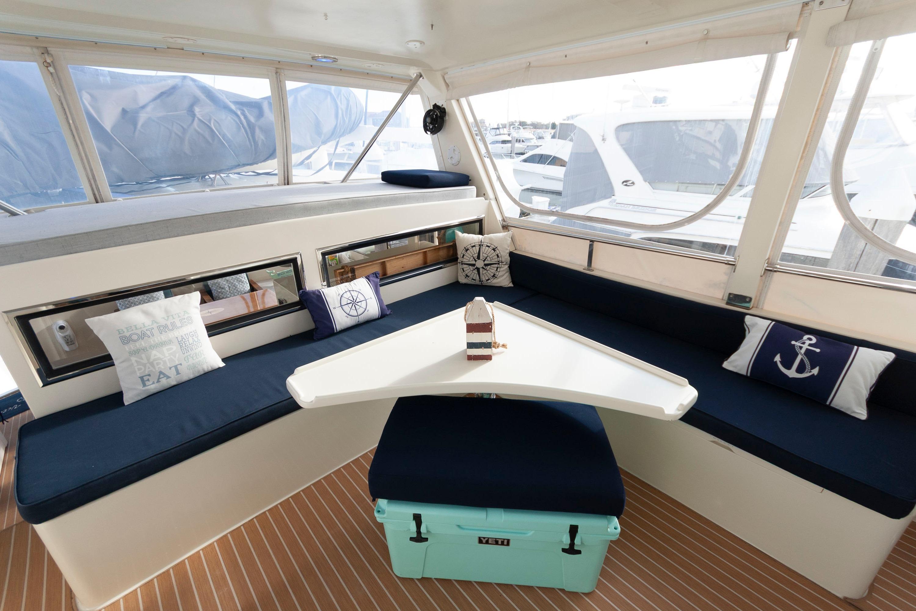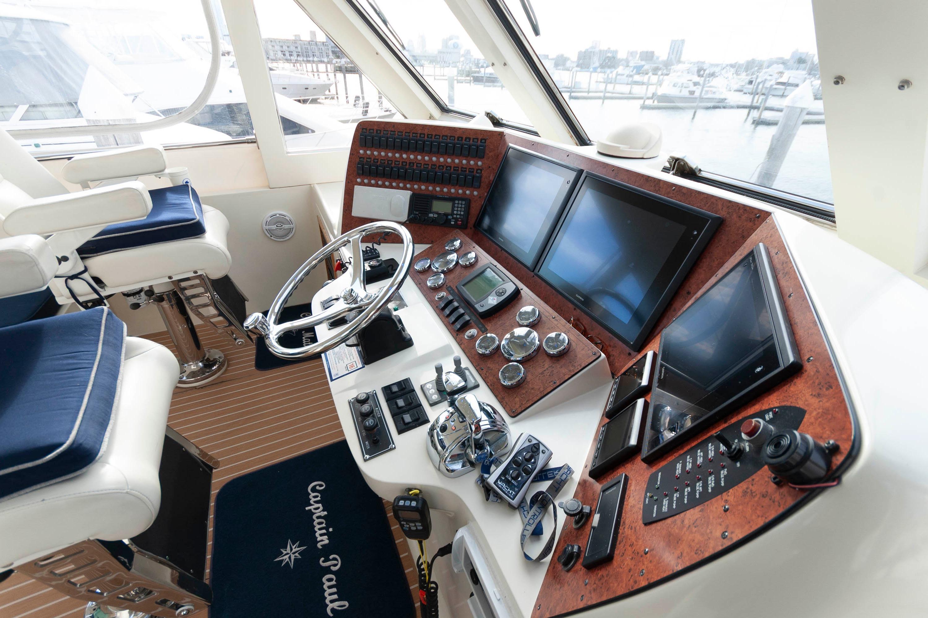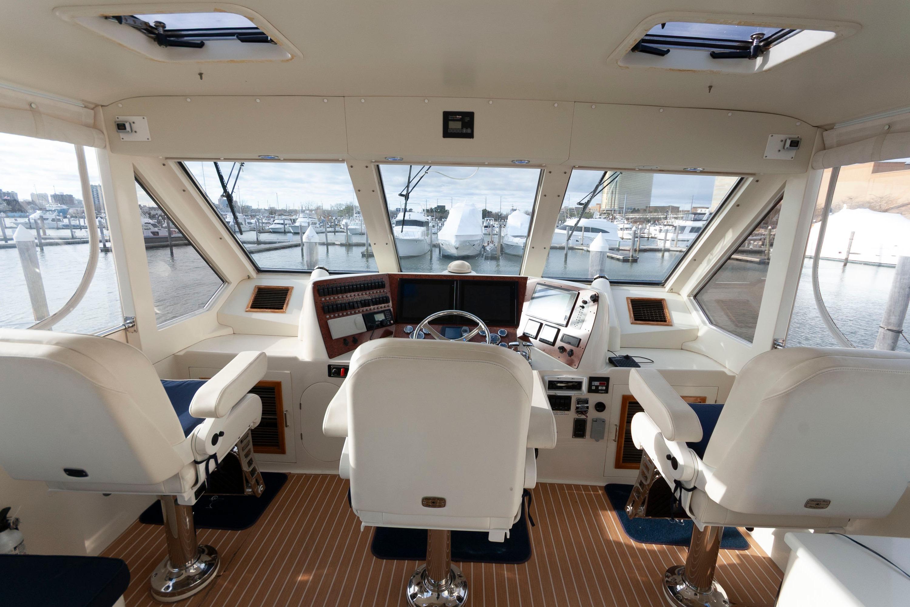 There are 3 large very comfortable Pompanette helm chairs, AC/Heat, EZ2CY enclosure on sides and aft - all with sun screens, and 3 hard glass hydraulic opening windshields with wipers, and 3 hatches. For your convience it also has a large chart table with a pull out draw with ample chart storage underneath.