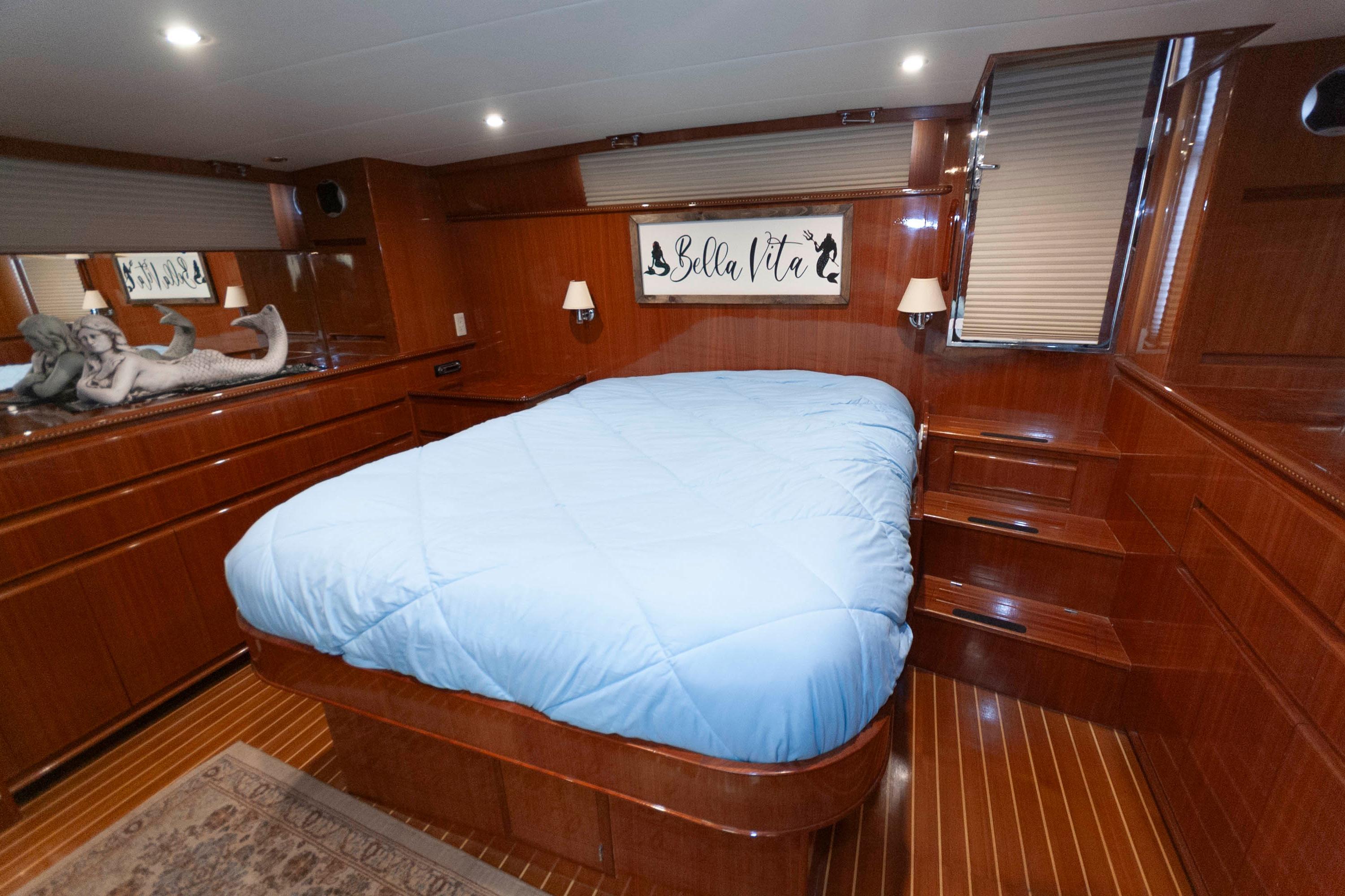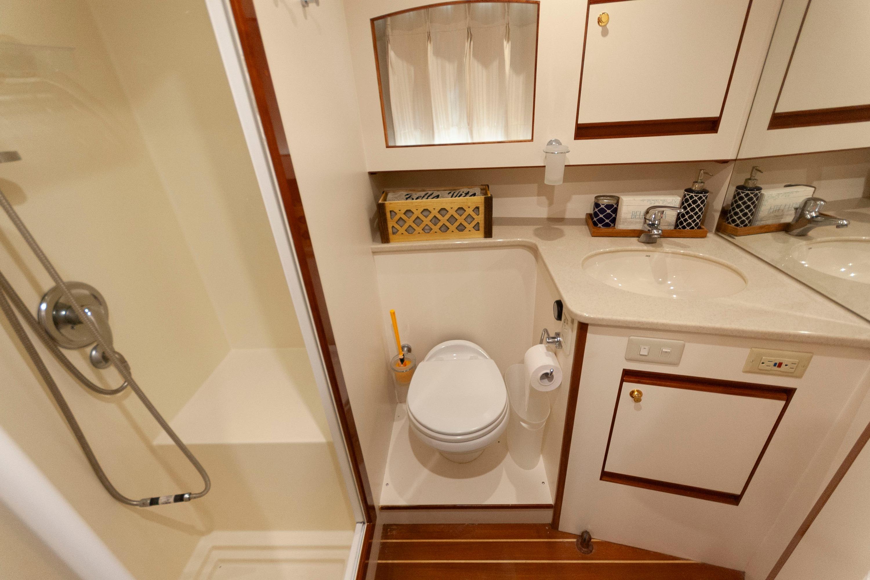 The VIP is forward with a walk around new Queen size mattress. There is complete privacy and access to the 2nd head and shower which is shared with the Guest stateroom. The cabin offers a large hanging locker and cabinets for plenty of storage. There is a 13" Sharp flat screen and bedside lighting.