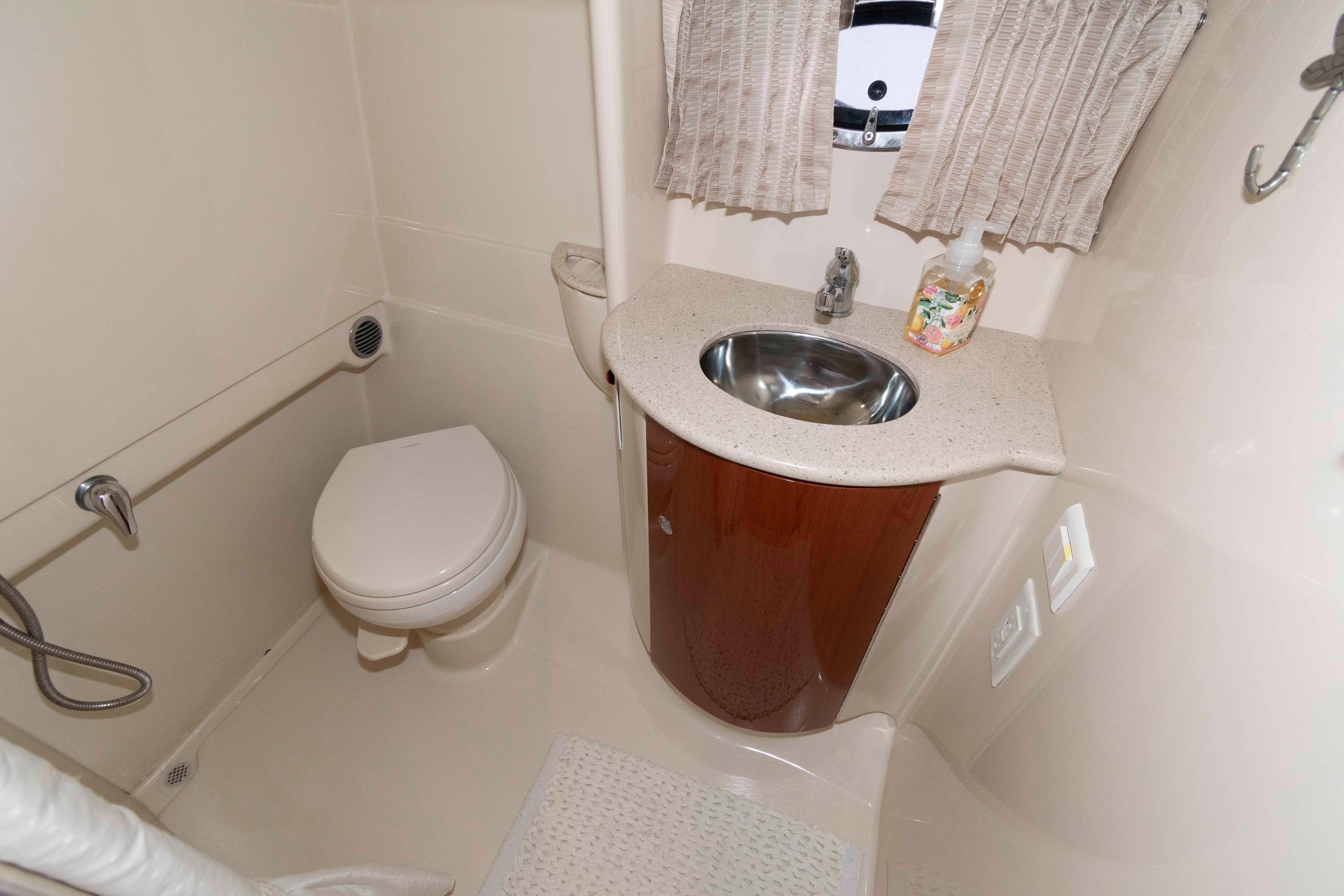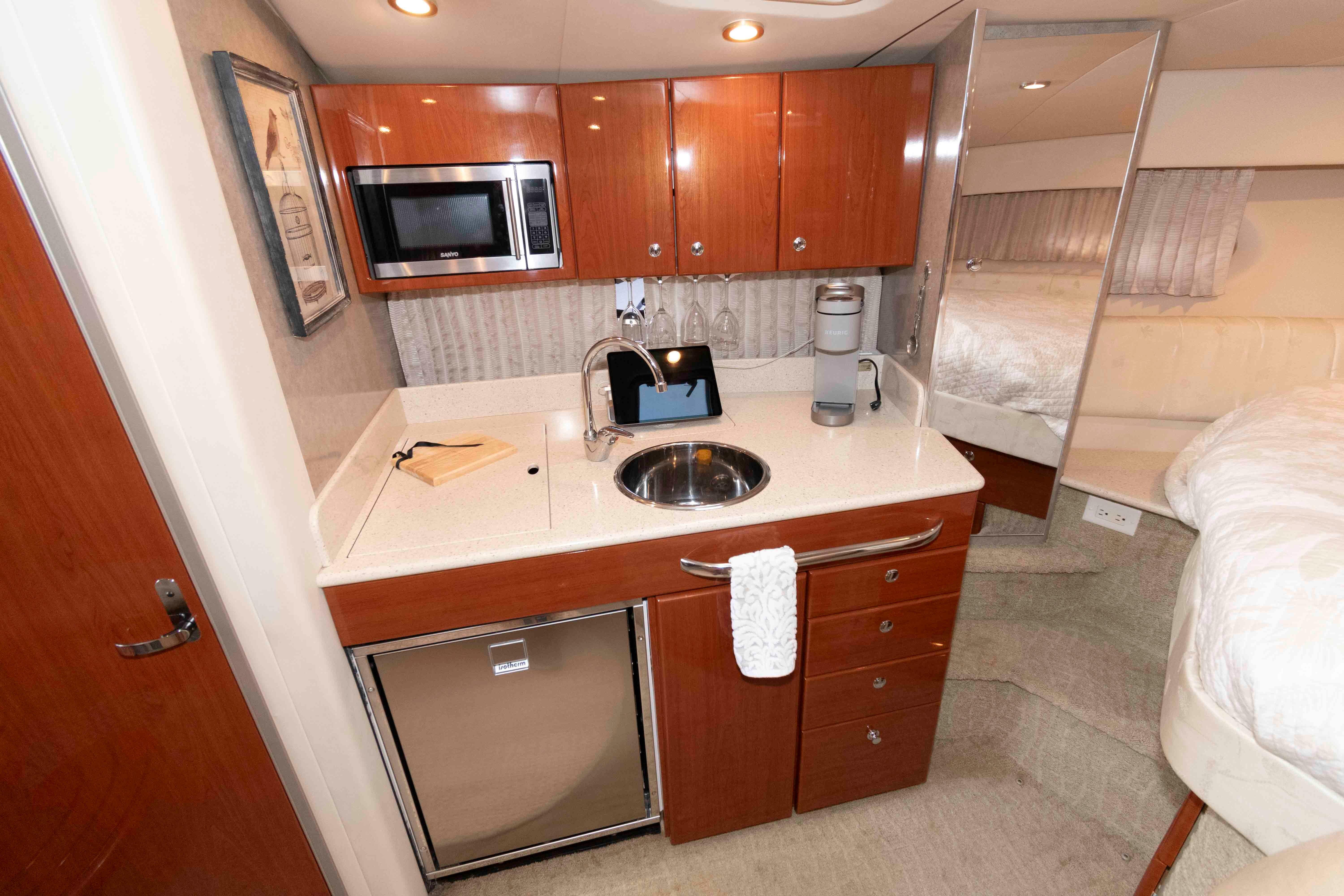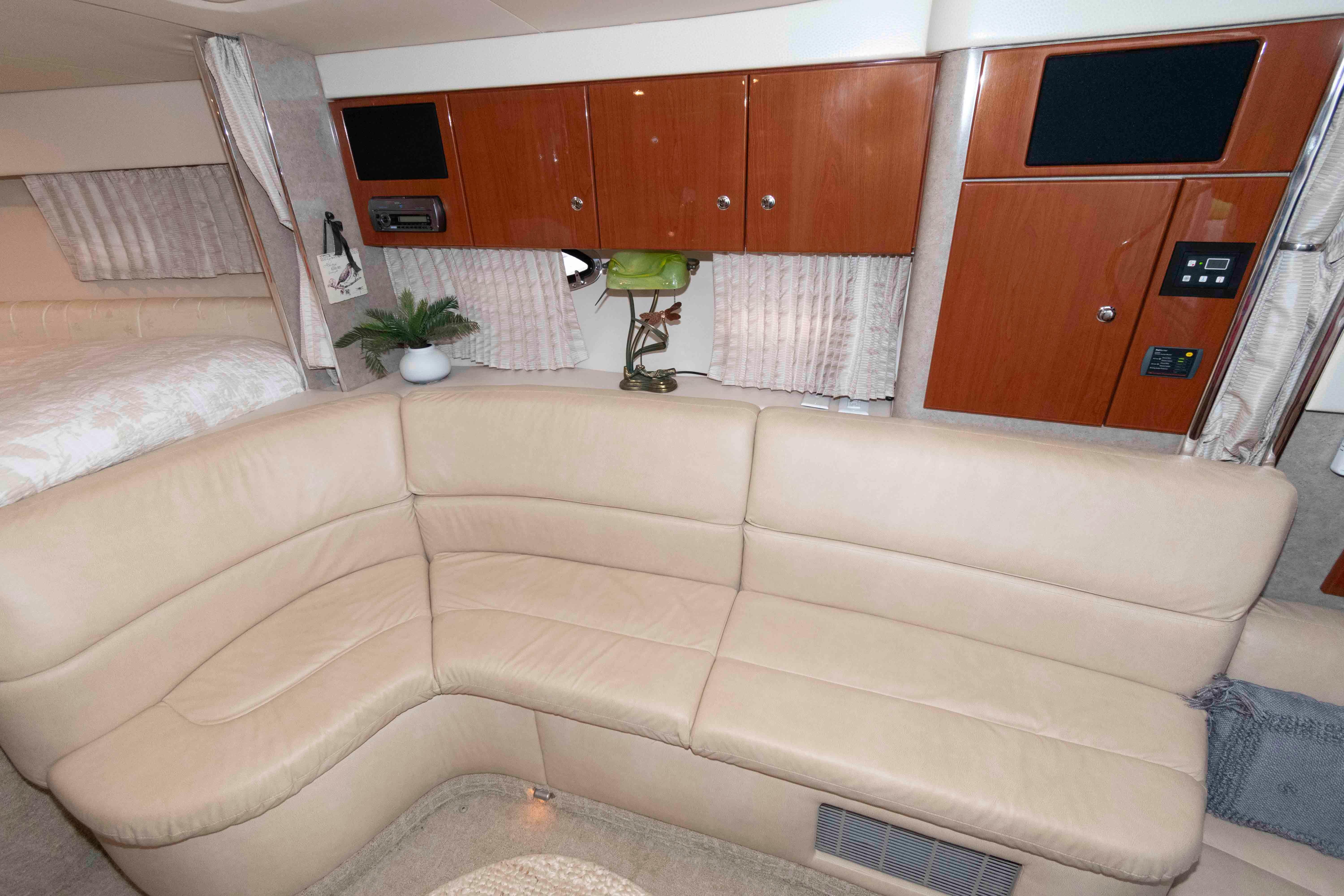 Each Performance Cruiser cabin elicits immediate admiration. The flawless, high-gloss, Deep Cherry finish of the cabinetry is echoed in solid wood tables, while gleaming, handcrafted Corian provides the perfect counterpoint. The galley is equipped with a refrigerator, polished stainless steel sink, microwave oven and a concealed electric stove. Each hardwood drawer has dovetailed corners as in all fine furniture. Either American Cherry woodgrain-finish flooring or warm, subtly patterned custom carpet is a beautiful touch underfoot. As always, the luxuriously supple Ultraleather lounge is the natural center for socializing, whether for eating, watching TV or just for interesting conversations.