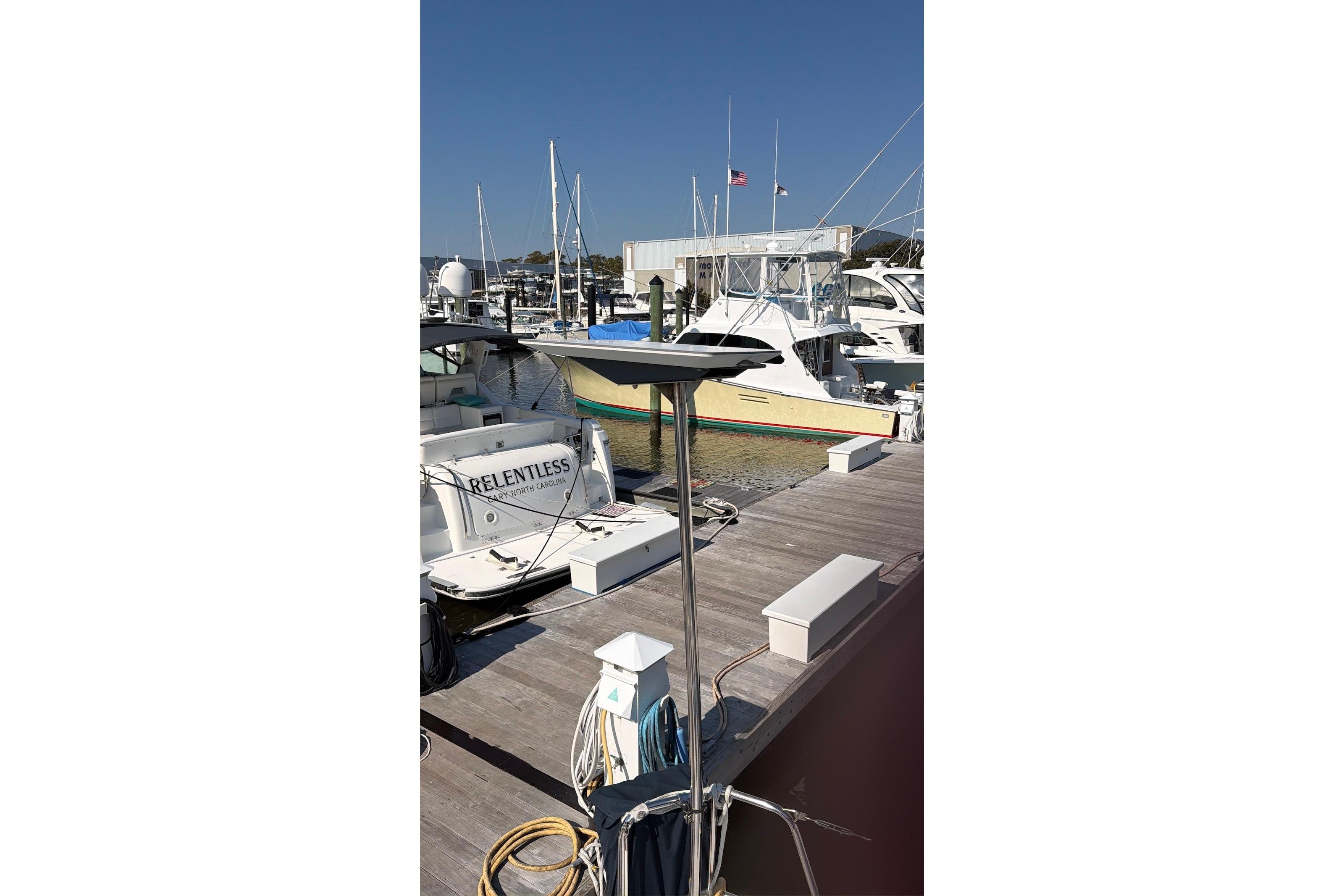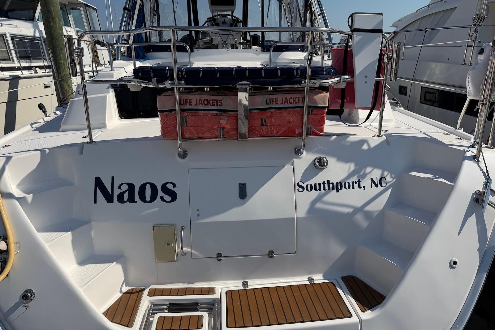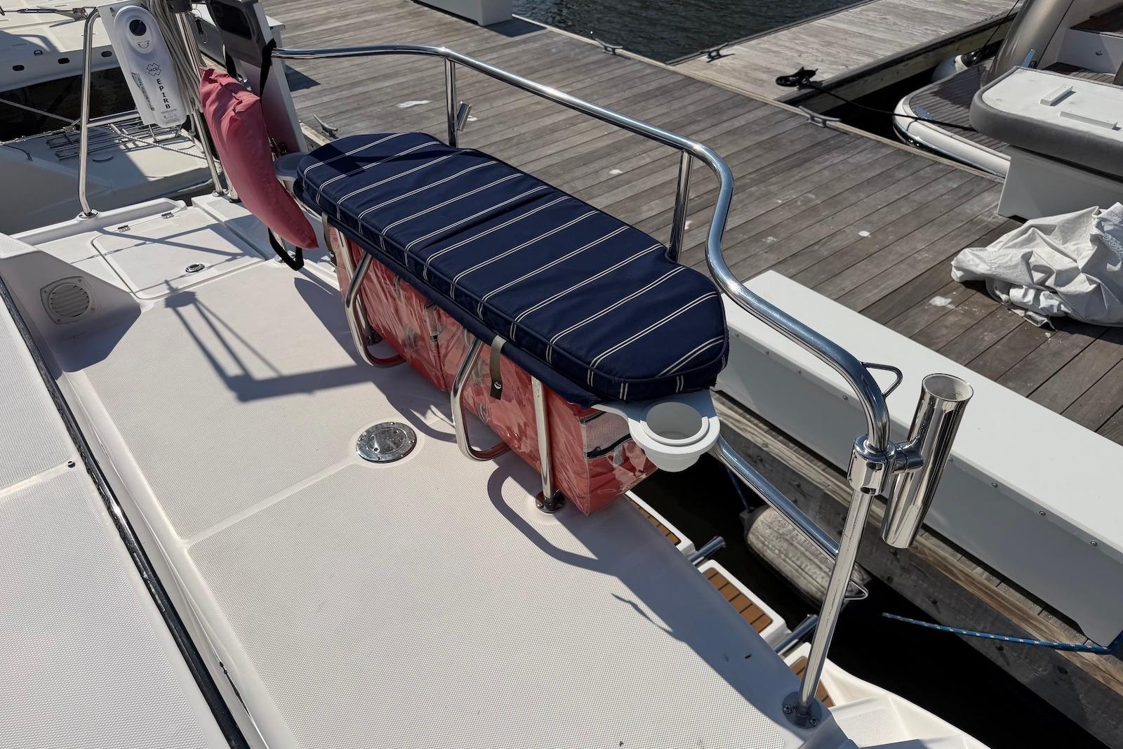 - Exterior: Stainless steel arch and traveler, stainless steel stanchions (27 in) with triple lifelines.