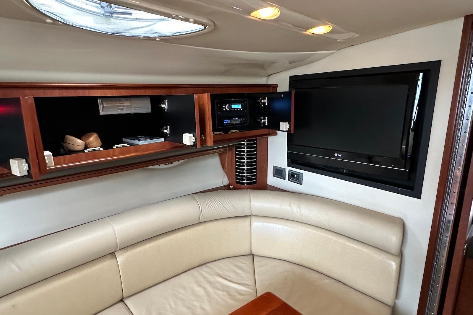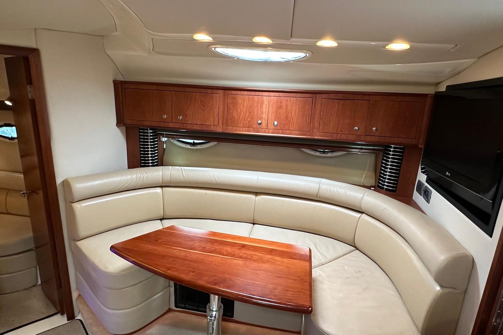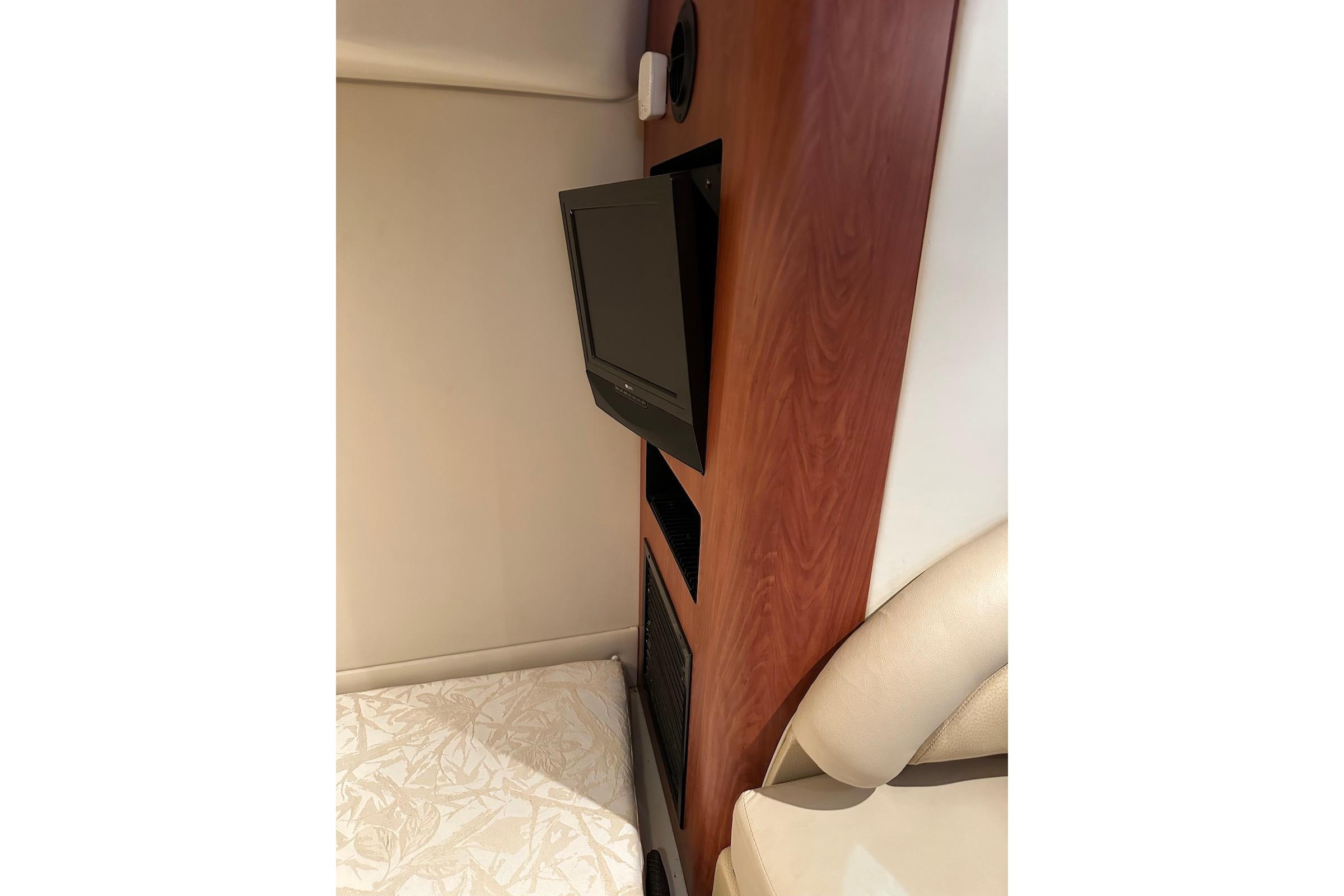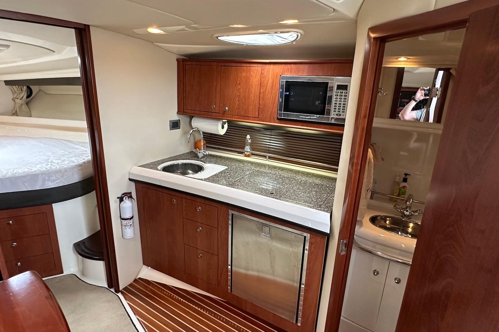 With a marriage of performance, style and comfort, the 350 incorporates the latest construction techniques and performance-enhancing design elements to deliver an exhilarating ride. A large cockpit seating area and masterfully laid out helm station, starboard wet bar and additional storage makes short or extended cruises just shy of a fantasy. Below deck, a luxuriously appointed cabin awaits with generous accommodations. Discover beauty and unparalleled craftsmanship on the 350 Sport Yacht. Below deck, rich cherrywood and a warm palette adorn the lavish interior, extending from the roomy salon to the well-appointed galley and enclosed head with stand-up shower. A spacious curved dinette converts into a double bed for sleeping, while the stateroom comfortably accommodates room for two. Flatpanel TV screens make efficient use of space with audio and video demands just a click away. A fully equipped galley provides matching cherrywood cabinets, refrigerator and an electric stove and microwave, perfect for the countless delicious meals prepared onboard.