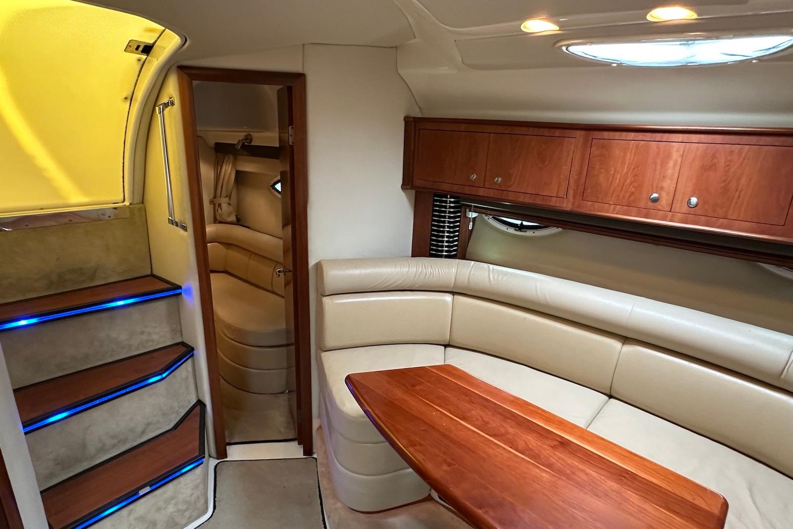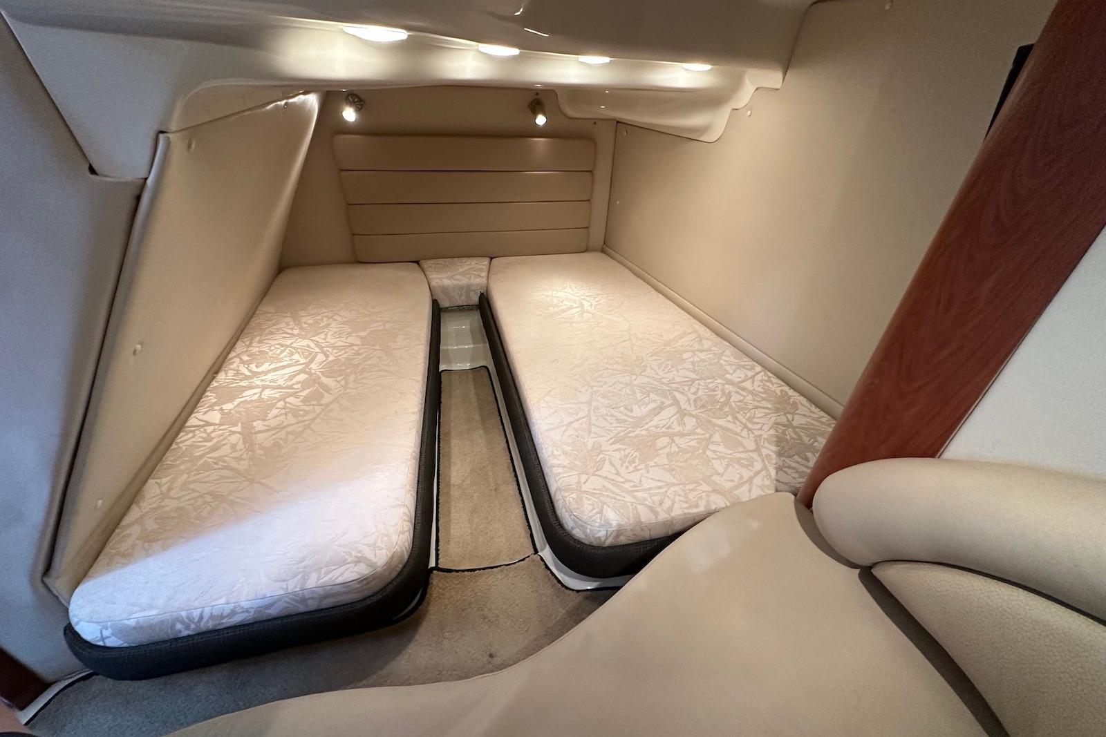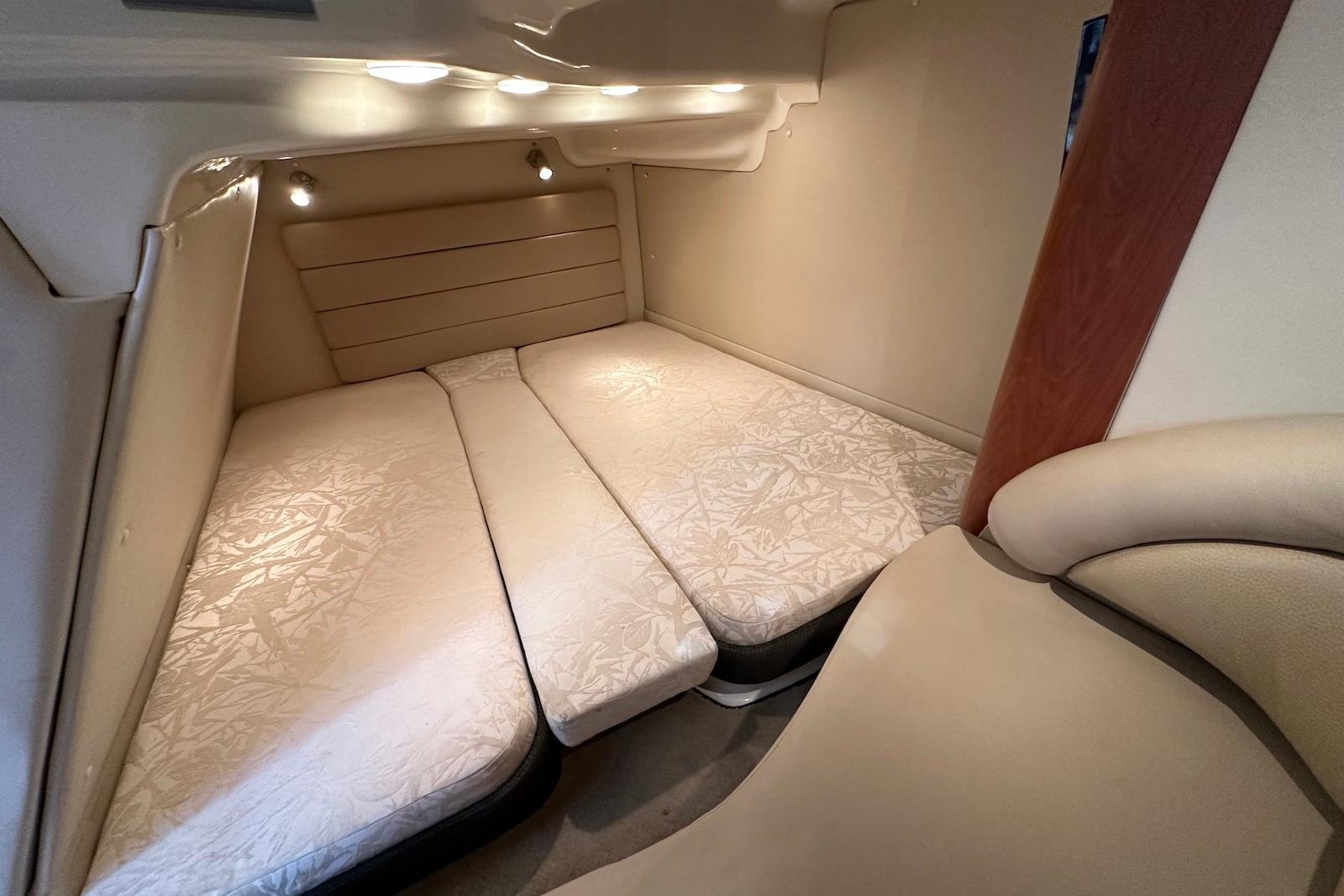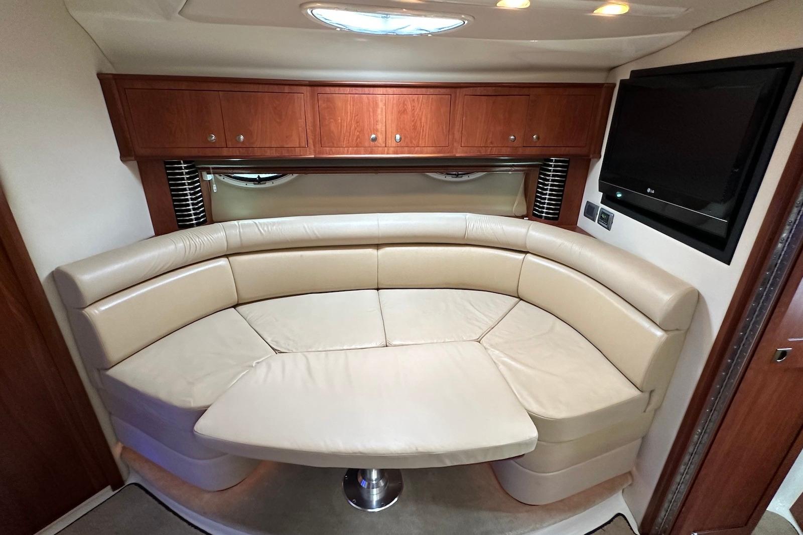 With a marriage of performance, style and comfort, the 350 incorporates the latest construction techniques and performance-enhancing design elements to deliver an exhilarating ride. A large cockpit seating area and masterfully laid out helm station, starboard wet bar and additional storage makes short or extended cruises just shy of a fantasy. Below deck, a luxuriously appointed cabin awaits with generous accommodations. Discover beauty and unparalleled craftsmanship on the 350 Sport Yacht. Below deck, rich cherrywood and a warm palette adorn the lavish interior, extending from the roomy salon to the well-appointed galley and enclosed head with stand-up shower. A spacious curved dinette converts into a double bed for sleeping, while the stateroom comfortably accommodates room for two. Flatpanel TV screens make efficient use of space with audio and video demands just a click away. A fully equipped galley provides matching cherrywood cabinets, refrigerator and an electric stove and microwave, perfect for the countless delicious meals prepared onboard.