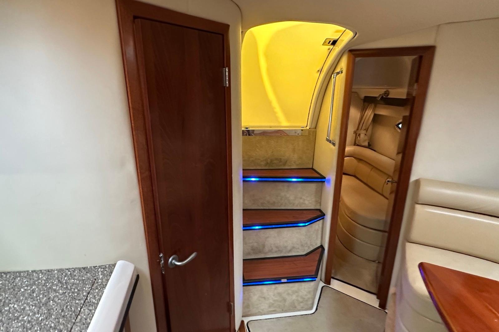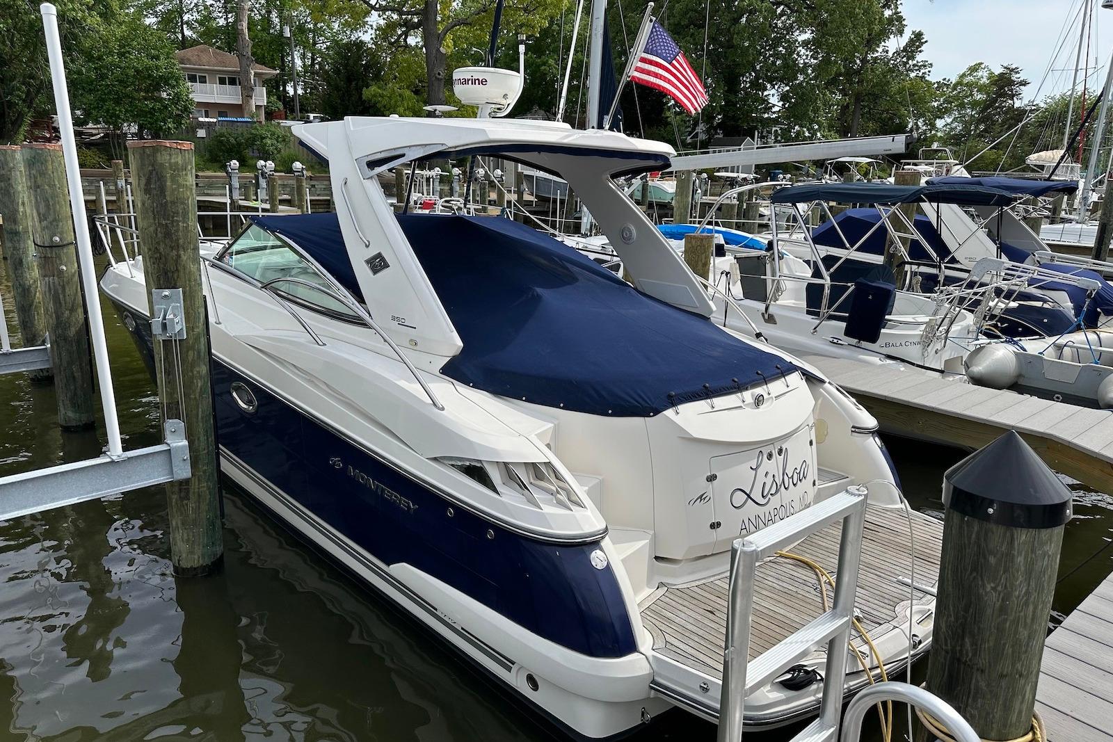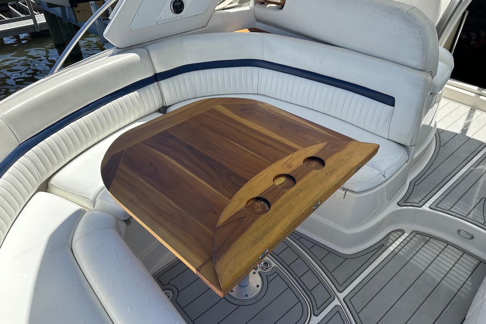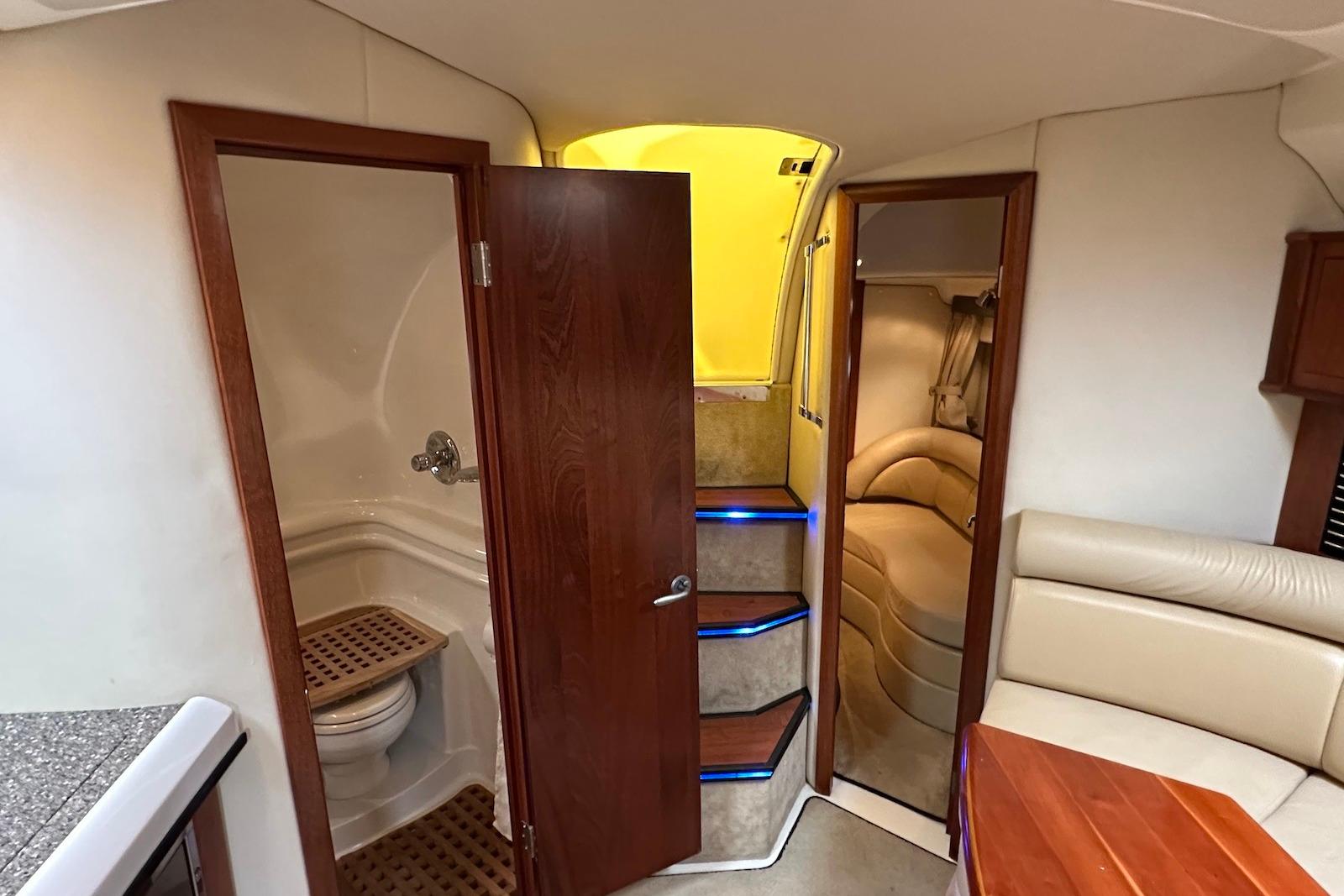 With a marriage of performance, style and comfort, the 350 incorporates the latest construction techniques and performance-enhancing design elements to deliver an exhilarating ride. A large cockpit seating area and masterfully laid out helm station, starboard wet bar and additional storage makes short or extended cruises just shy of a fantasy. Below deck, a luxuriously appointed cabin awaits with generous accommodations. Discover beauty and unparalleled craftsmanship on the 350 Sport Yacht. Below deck, rich cherrywood and a warm palette adorn the lavish interior, extending from the roomy salon to the well-appointed galley and enclosed head with stand-up shower. A spacious curved dinette converts into a double bed for sleeping, while the stateroom comfortably accommodates room for two. Flatpanel TV screens make efficient use of space with audio and video demands just a click away. A fully equipped galley provides matching cherrywood cabinets, refrigerator and an electric stove and microwave, perfect for the countless delicious meals prepared onboard.