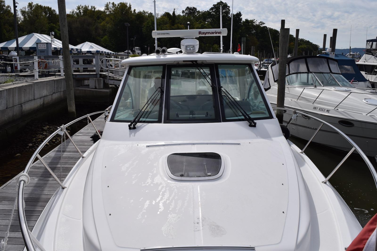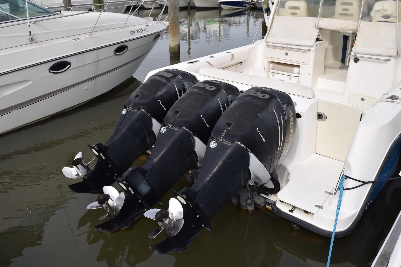 This 2011 Boston Whaler 345 Conquest was purchased new by the current owner. As the only owner of this boat, he has been very proactive with regards to engine maintenance and upkeep of the vessel. The triple Mercury 300 hp motors have 880 hours and the Fischer Panda diesel 8k generator has only 500 hours. The boat has been docked and used almost exclusively in the brackish, but mostly freshwater of the Hudson River.