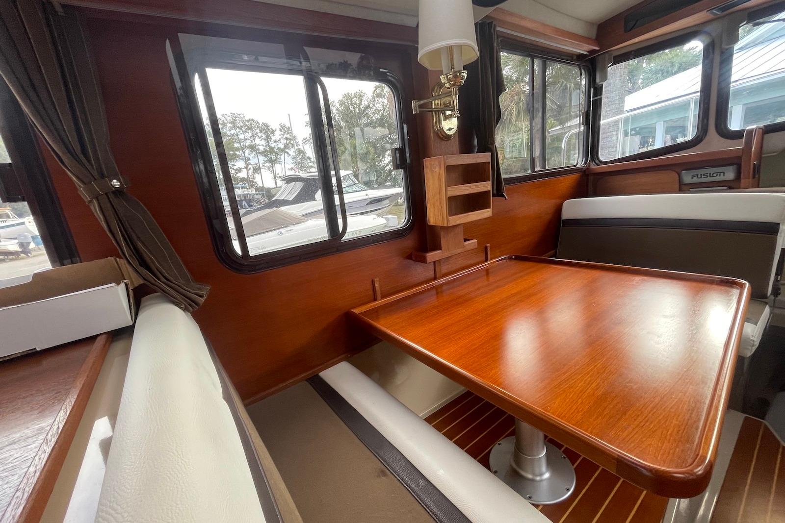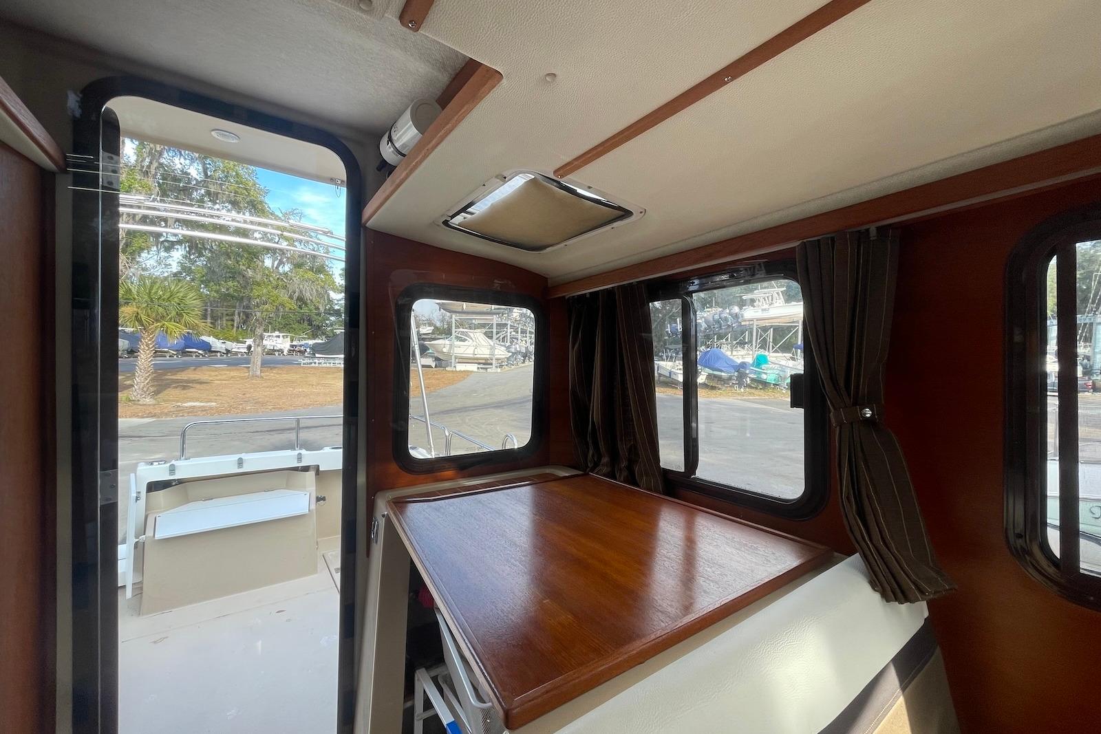 The R27 has nearly 50 Sq ft of aft deck space making the cockpit 25 percent larger than the original R25. This allows for easy access to the standard 180 HP Yanmar diesel and keeps the engine noise out of the cabin. The larger cockpit also lends itself to more above and below deck storage. The well appointed cabin has a midship office with desk and chair, this space also converts to a berth that sleeps two. The dinette table is on a hydraulic piston that allows for an easy conversion to a berth or lounging area. The spacious front v-berth sleeps two adults and is over 65" in length. Cooks will love the standard galley which includes a sink, refrigerator, inverter, microwave and a combination propane stove/oven. The marine head is standard with an electric flush toilet, glass vessel sink and shower. Yacht size features like standard bow and stern thrusters provide for excellent maneuverability around the dock and the 86" beam allows the boat to be easily trailered. Solar panels are an option on all of our models including the Ranger R27.